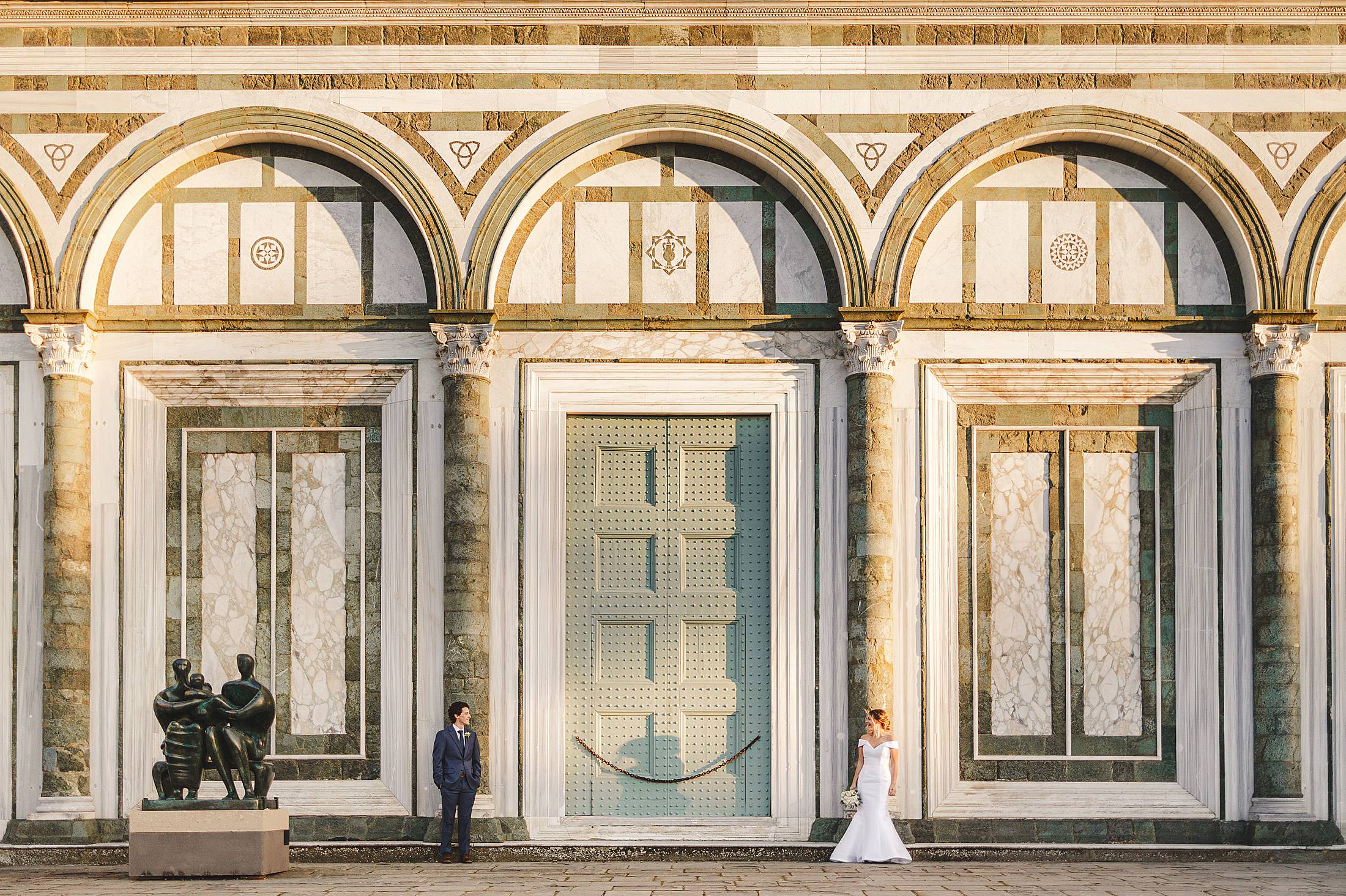Bride and groom elegant elopement wedding portrait at San Miniato al Monte Church. Photo by the Italian elegant elopement photographer in Florence Gabriele Fani