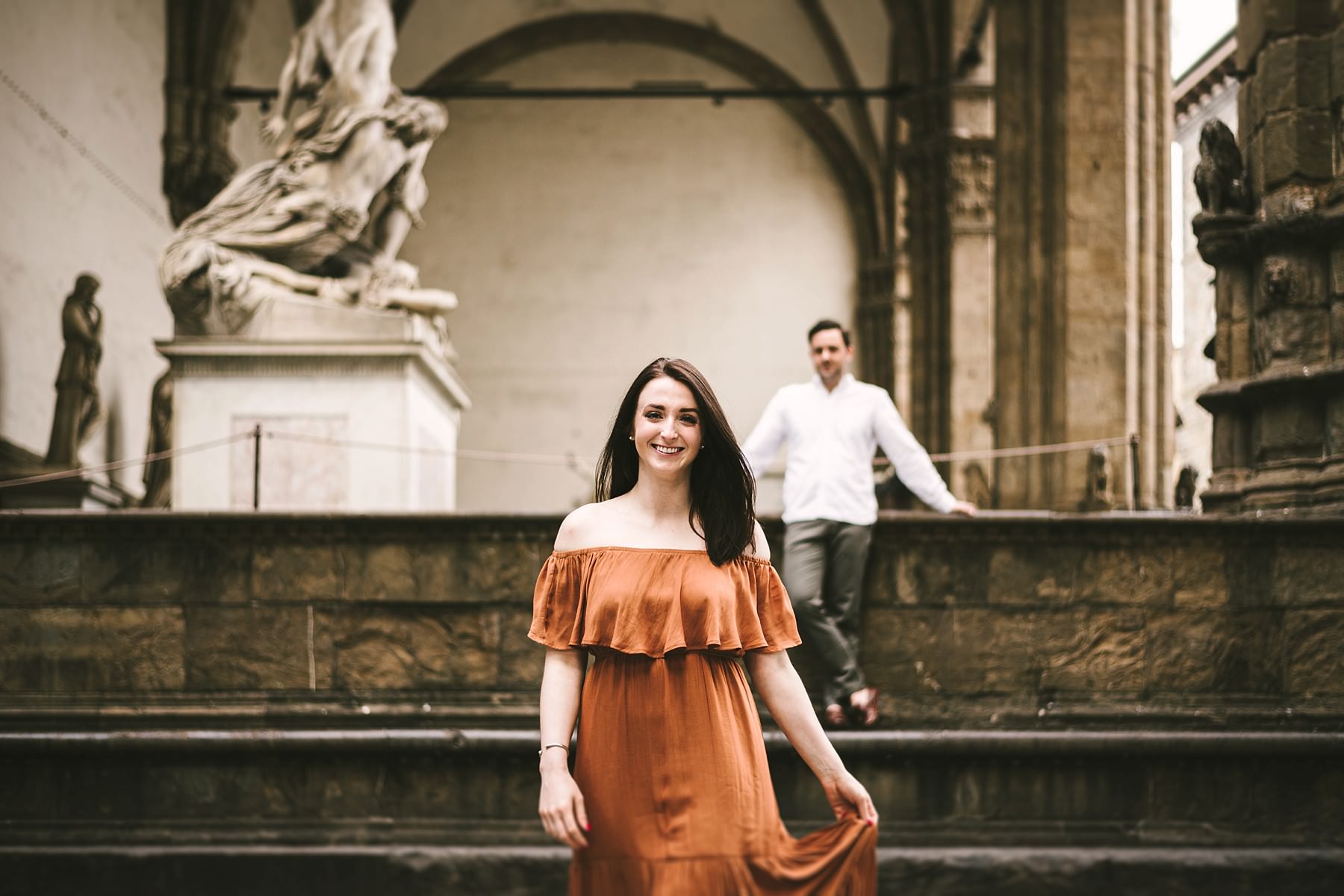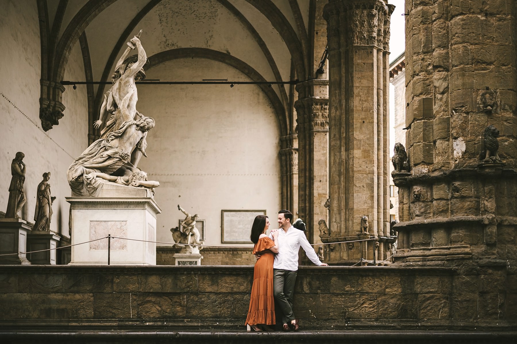 Sunrise engagement photo shoot in Florence. Couple portrait near Piazza Piazza della Signoria and Loggia Lanzi in a dreamy soft light. Photo by the Italian creative, elegant and modern photographer in Tuscany based Florence Gabriele Fani