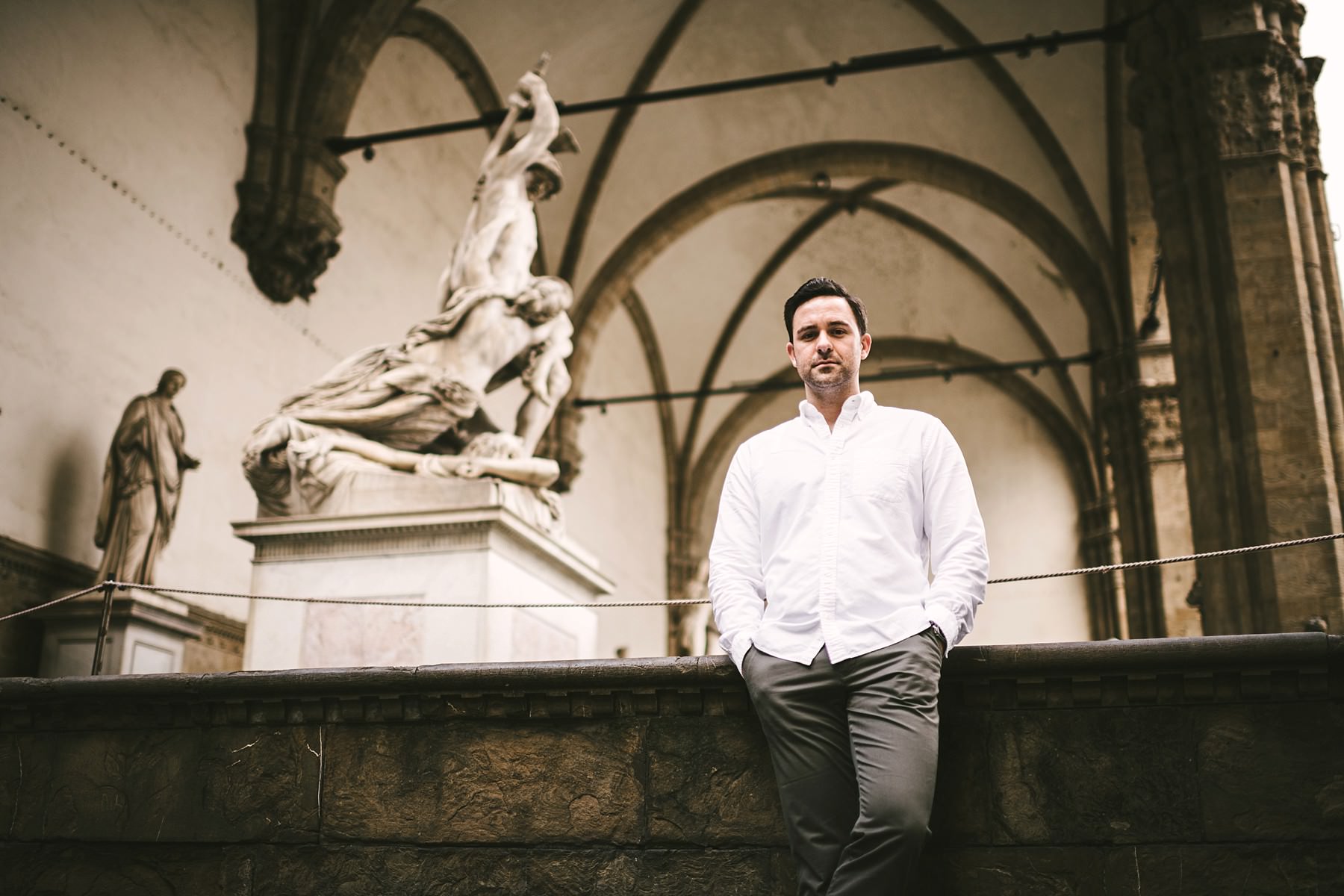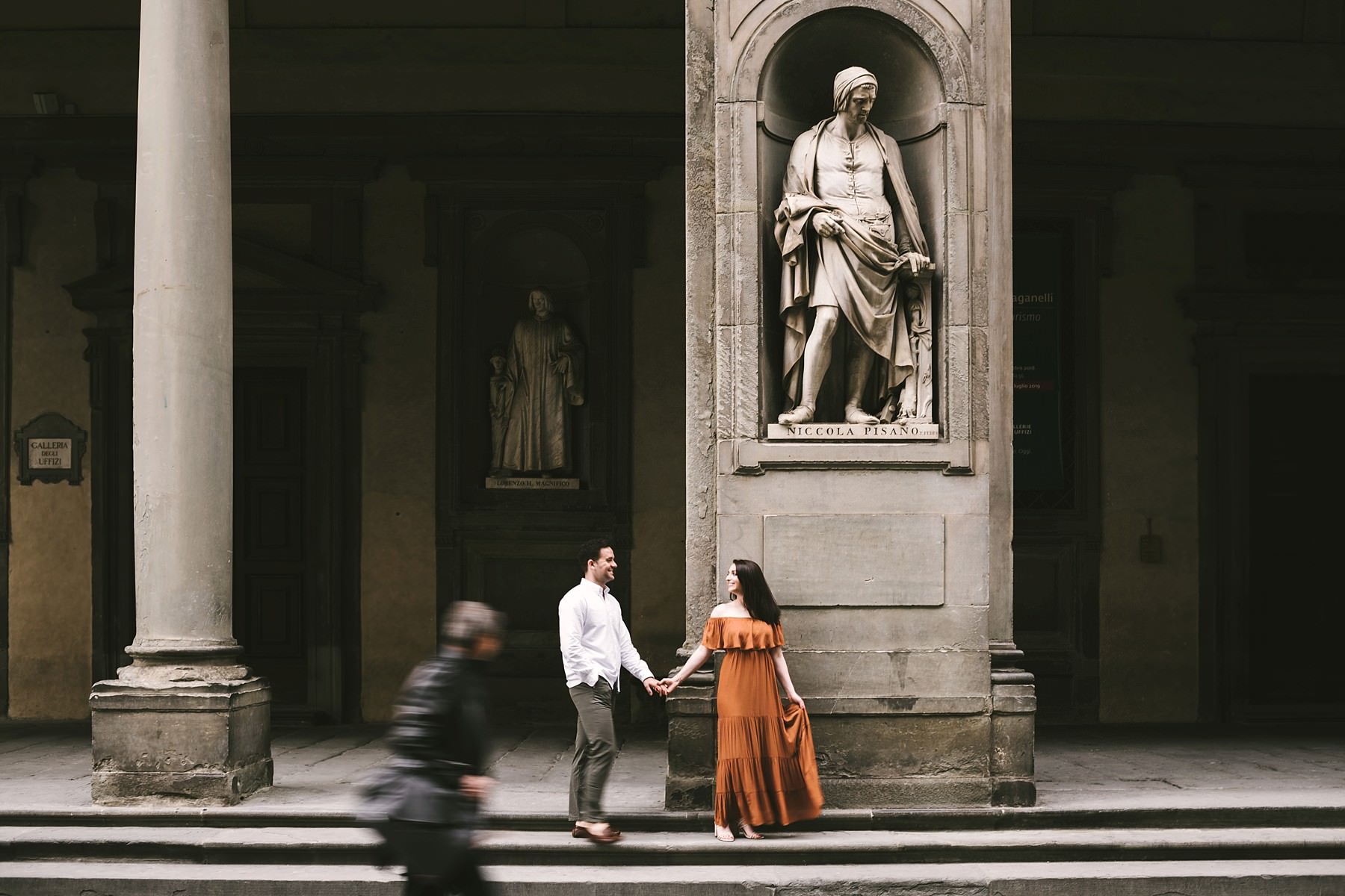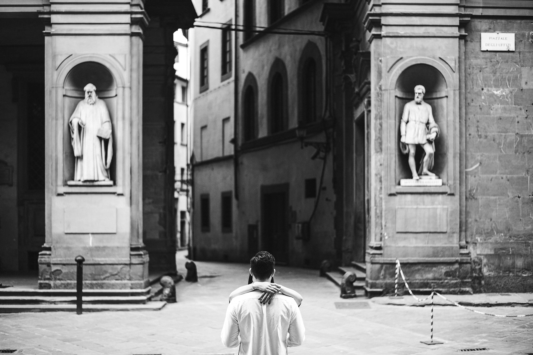 Modern early morning photo session in Florence at Uffizi gallery near Palazzo Vecchio. Photo by the Italian creative, elegant and modern photographer in Tuscany based Florence Gabriele Fani