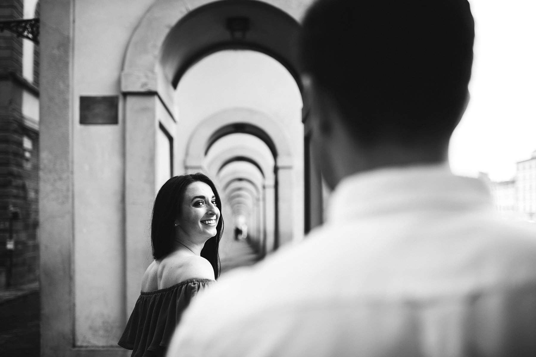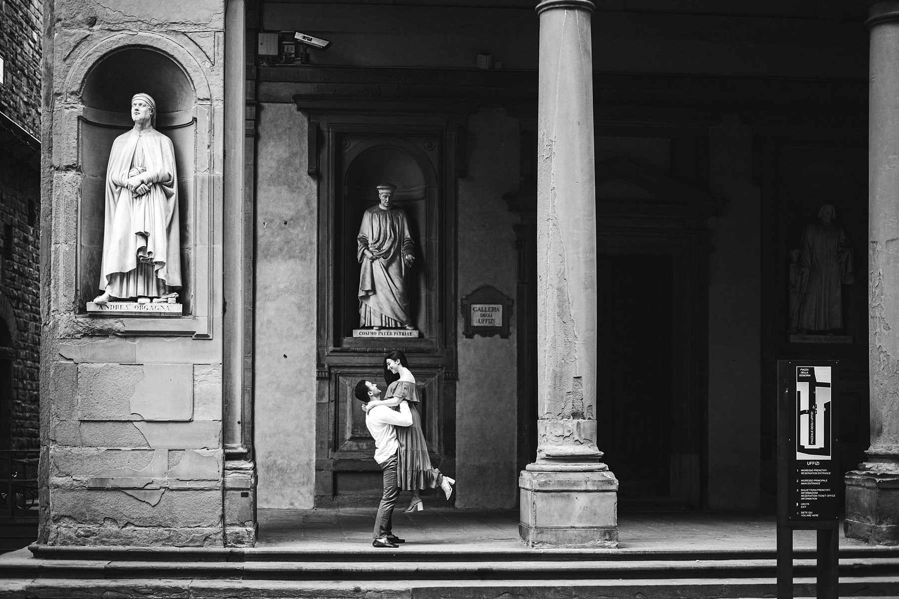 Creative and modern couple photos in the heart of Florence near Piazza della Signoria and Old Bridge. Photo by the Italian creative, elegant and modern photographer in Tuscany based Florence Gabriele Fani
