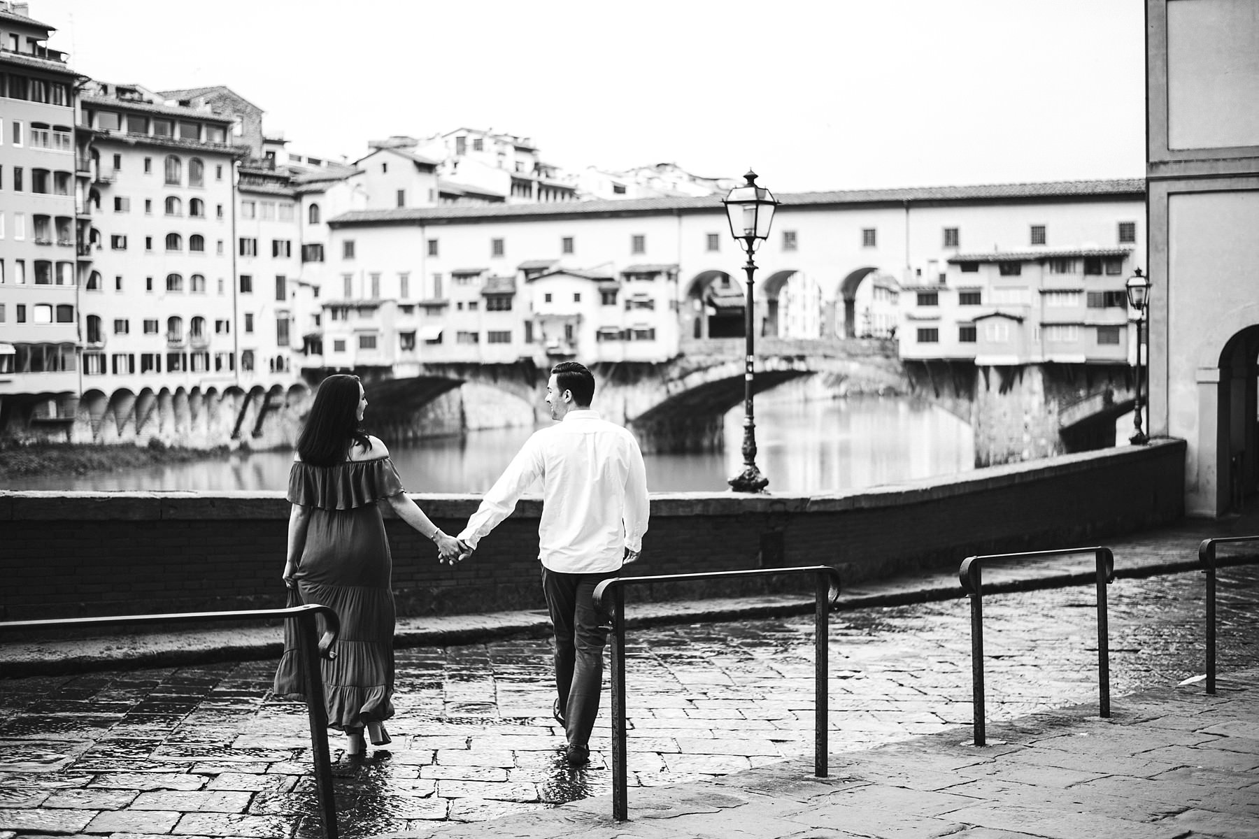 Lovely couple candid photo near Old Bridge in the early morning with anyone around. Sunrise photo session is the best to enjoy the walk tour experience photo shoot. Photo by the Italian creative, elegant and modern photographer in Tuscany based Florence Gabriele Fani