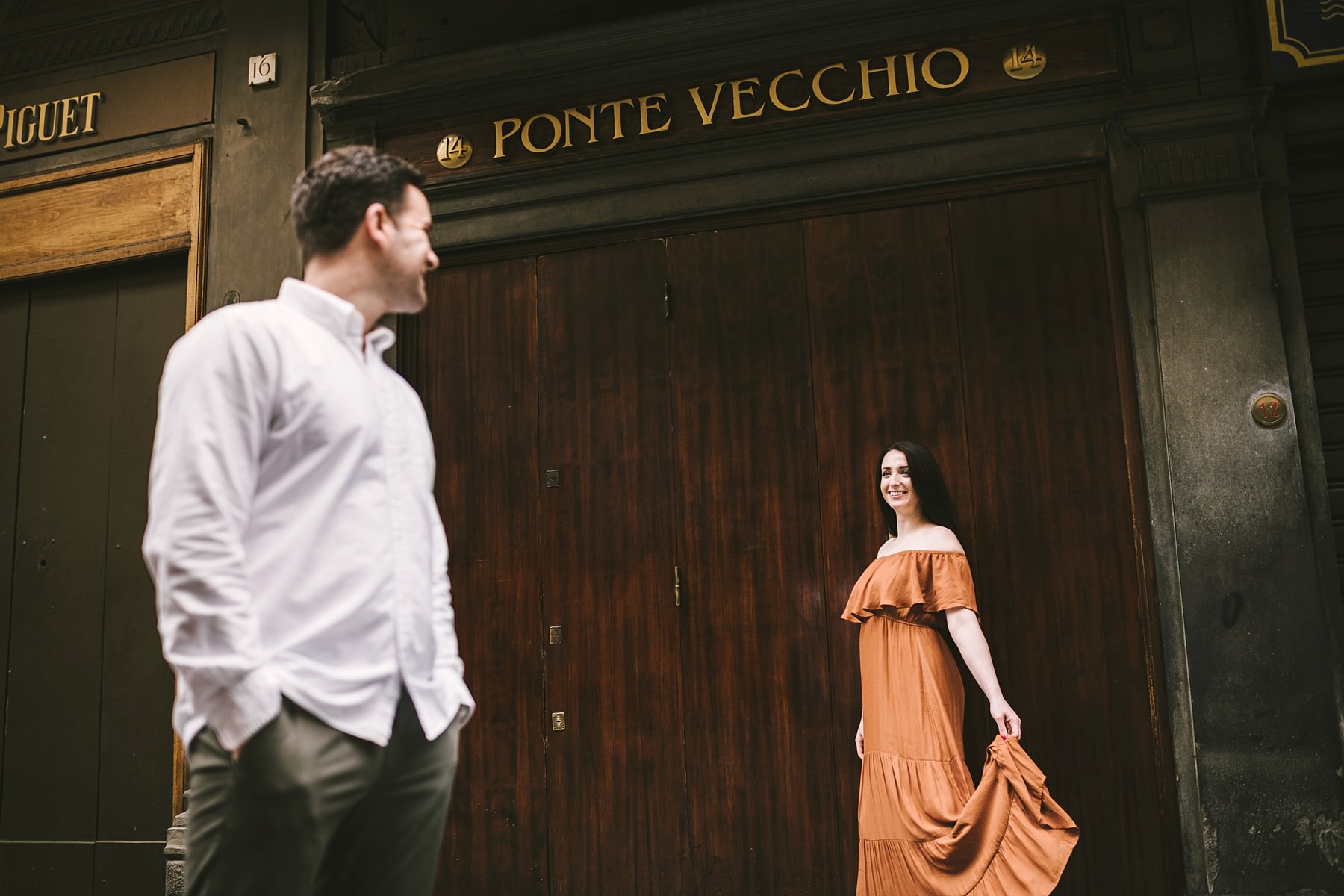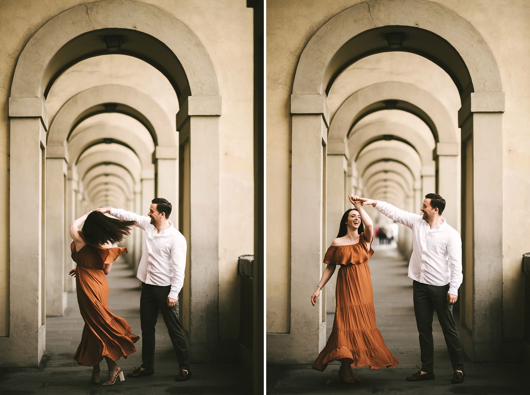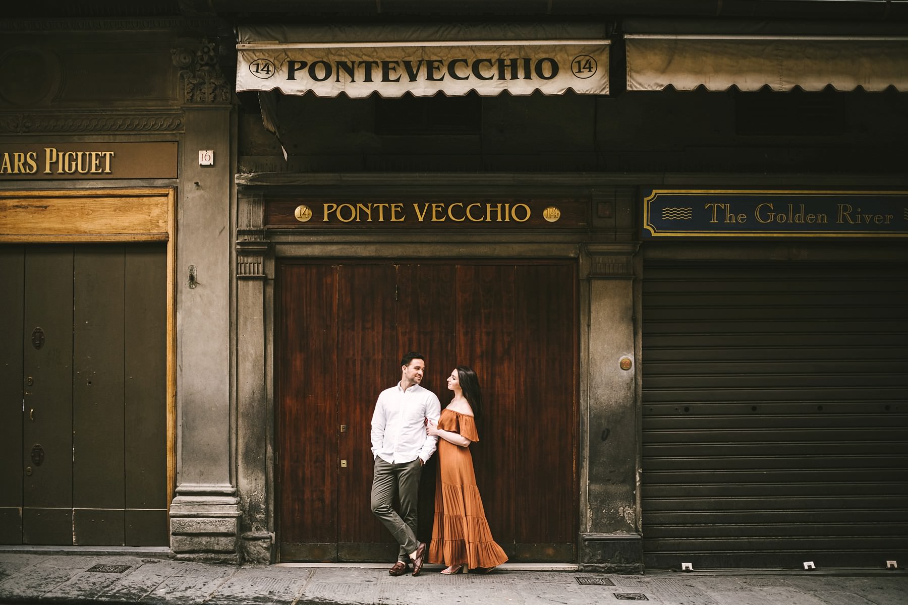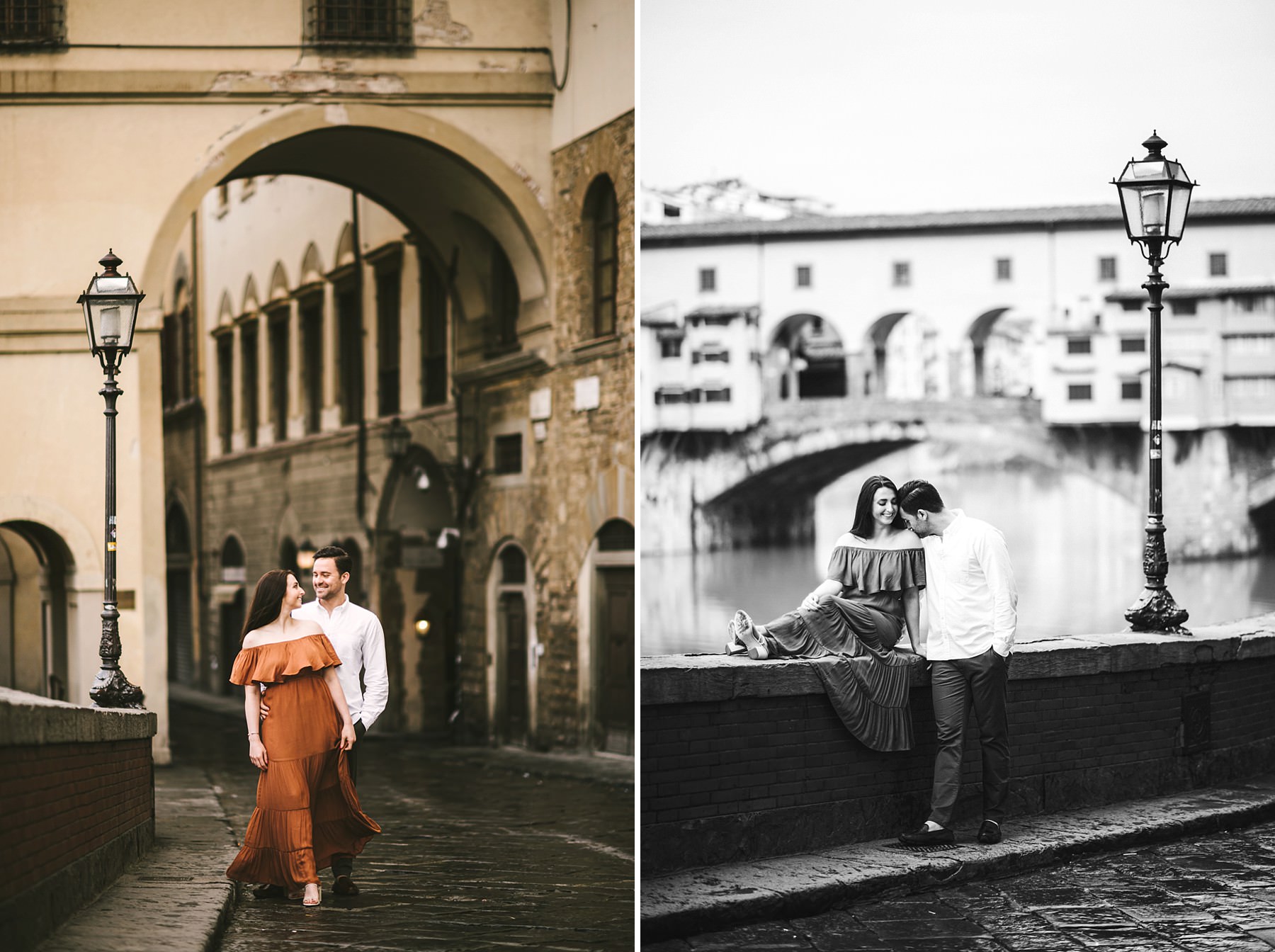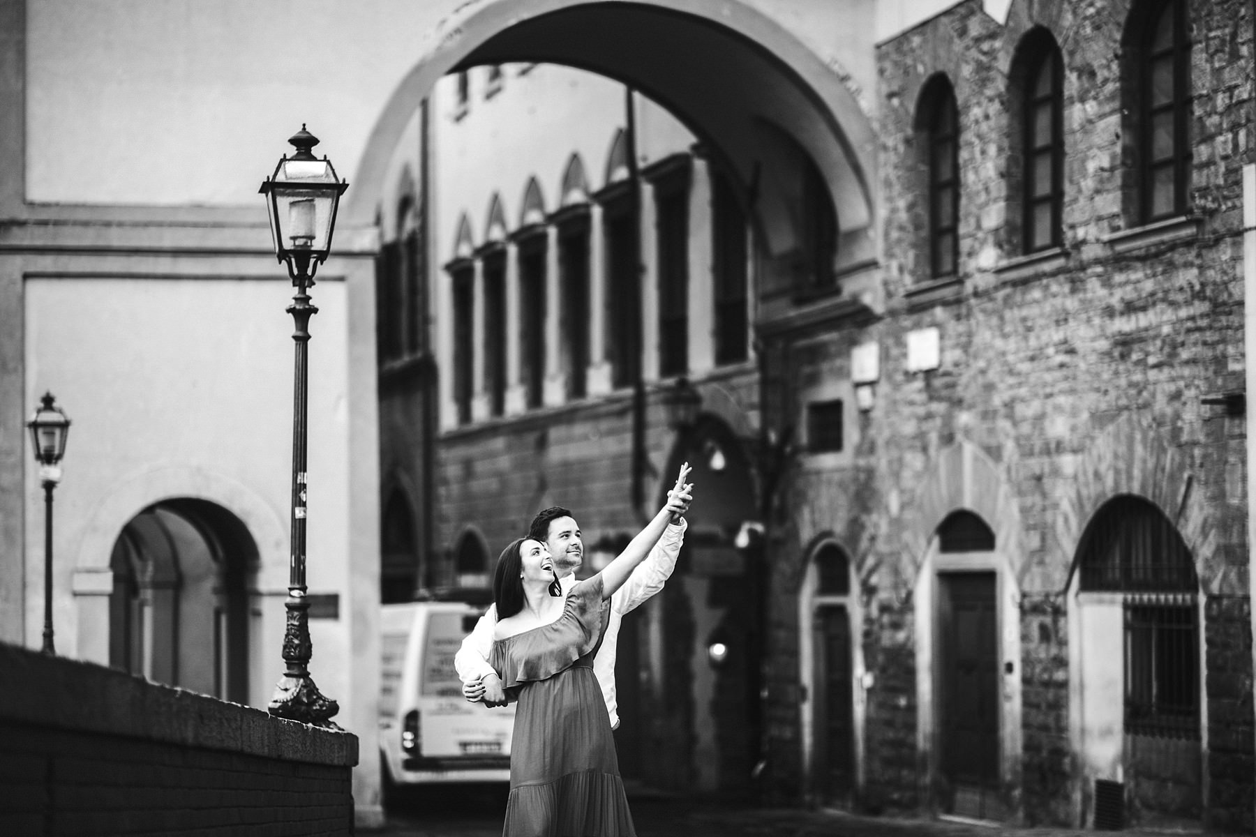 Creative and fun couple engagement photo shoot near Old Bridge in Florence. Sunrise photo session with no tourists down the streets. Photo by the Italian creative, elegant and modern photographer in Tuscany based Florence Gabriele Fani