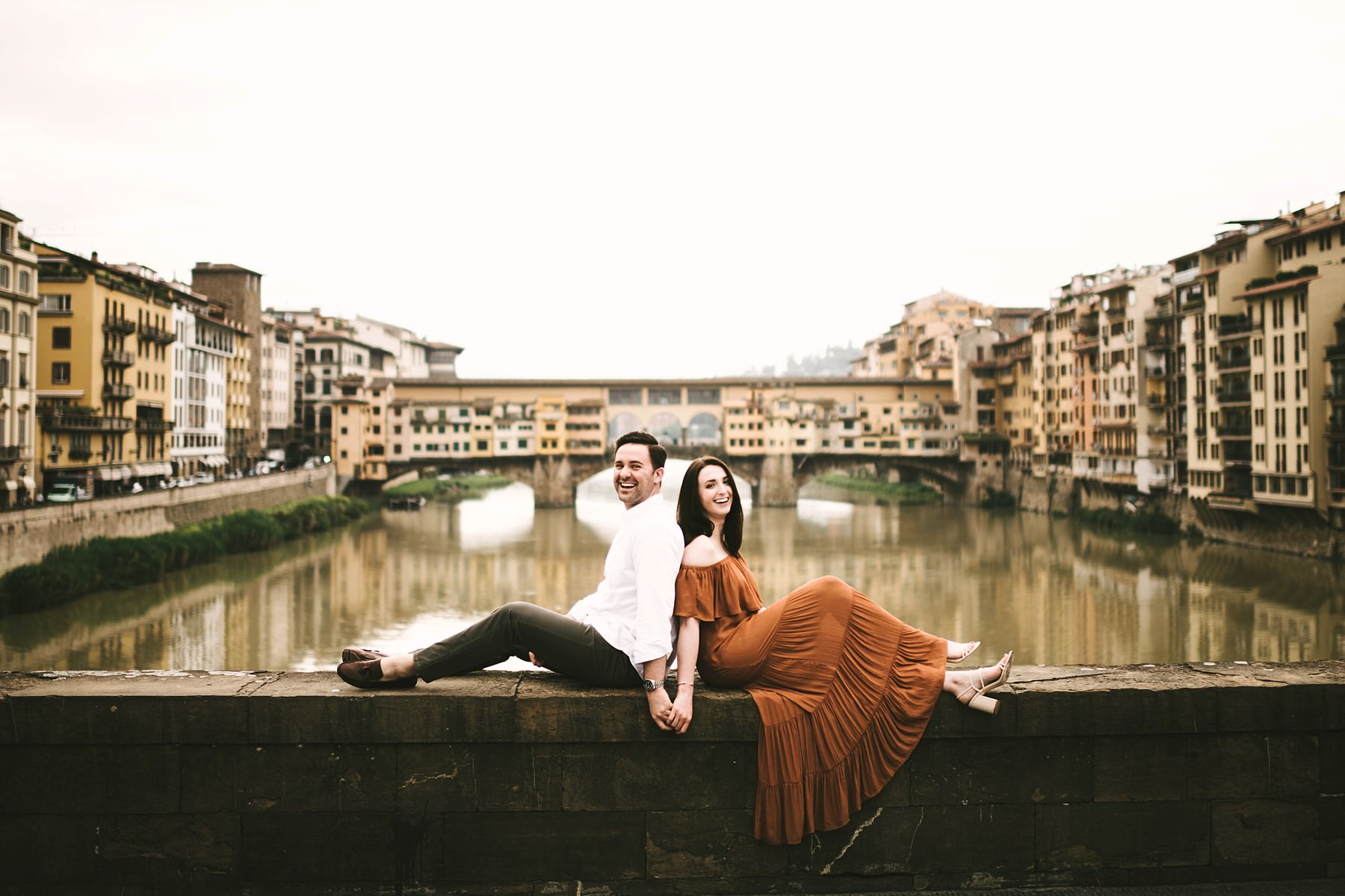 Gorgeous romantic and elegant couple portrait at Ponte Vecchio, Florence at sunrise time. Romantic experience with anyone around the couple. Photo by the Italian creative, elegant and modern photographer in Tuscany based Florence Gabriele Fani