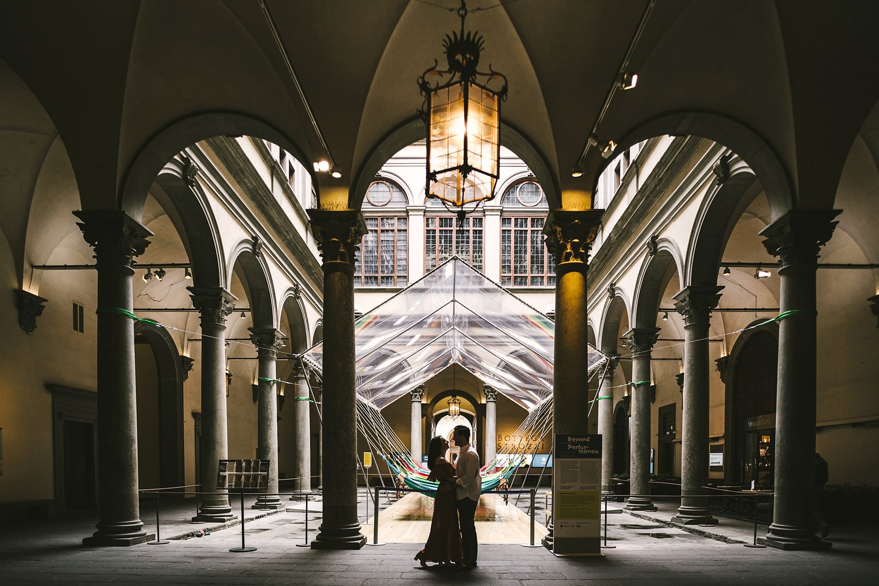 Elegant and romantic engagement photo shoot in Palazzo Strozzi in the very heart of Florence. Enjoy the early morning time for the best intimate and relaxed experience. Photo by the Italian creative, elegant and modern photographer in Tuscany based Florence Gabriele Fani