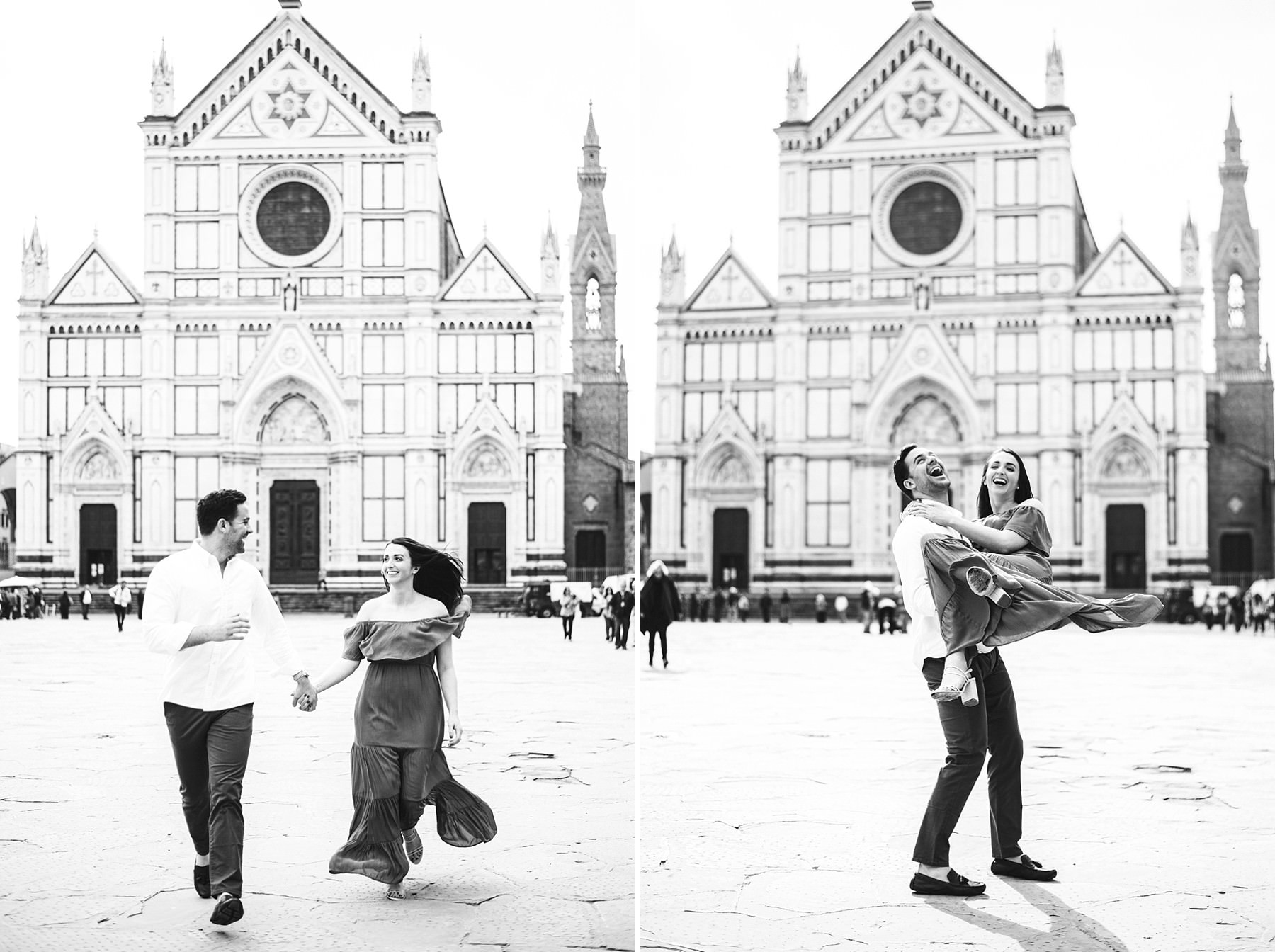 Lovely couple portrait at Santa Croce square in the heart of Florence at sunrise time. Photo by the Italian creative, elegant and modern photographer in Tuscany based Florence Gabriele Fani