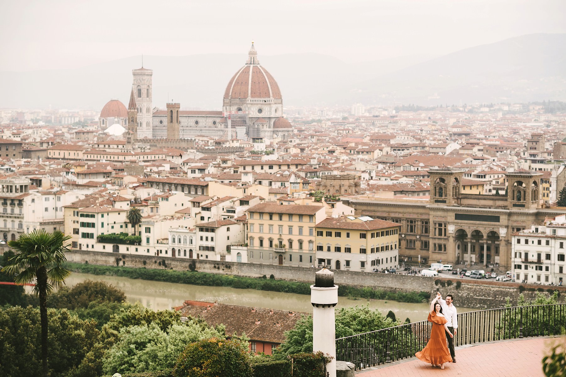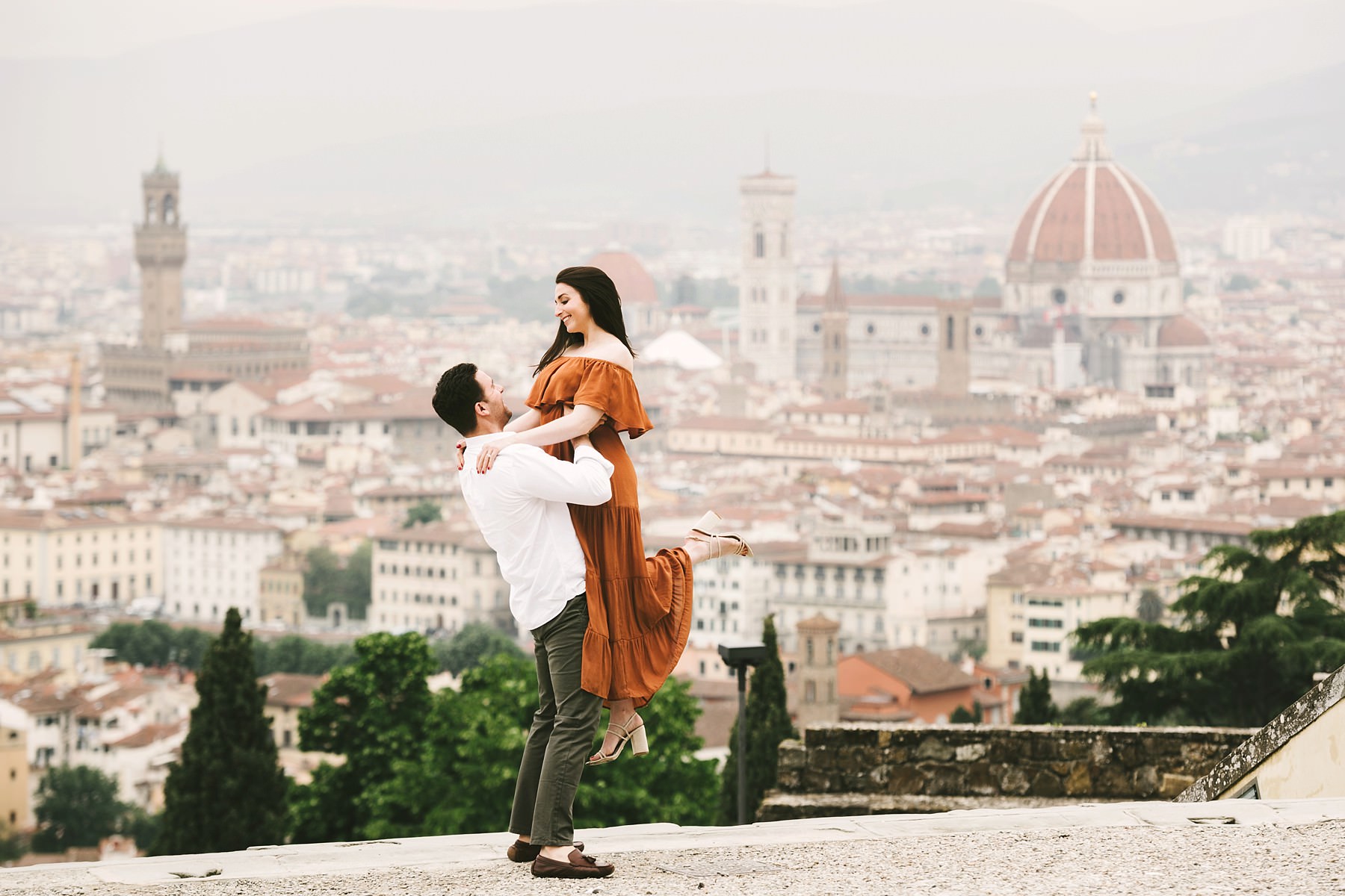 Lauren and Alex’s engagement session photos were taken in the historic heart of town and at the viewpoints of Piazzale Michelangelo and San Miniato al Monte. Every set was breathtaking in its own way: the first one because the color of Lauren’s dress matched perfectly with the fascinating architecture, the latter because of the incredible view that framed the photos.