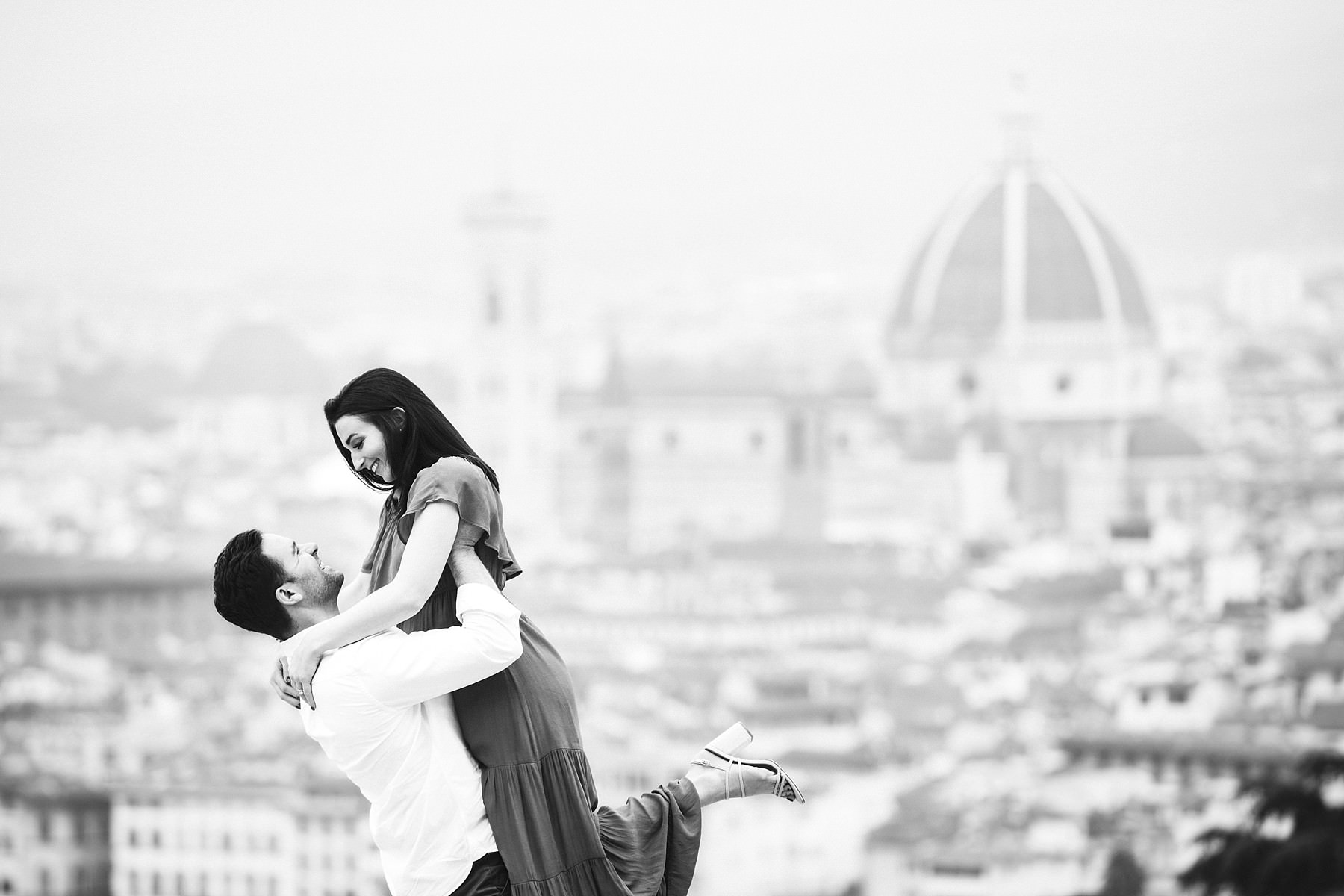 Exciting couple portrait photo session in Florence at sunrise time with anyone around the couple. Have the whole city at your feet for the best enjoyable experience. Photo by the Italian creative, elegant and modern photographer in Tuscany based Florence Gabriele Fani