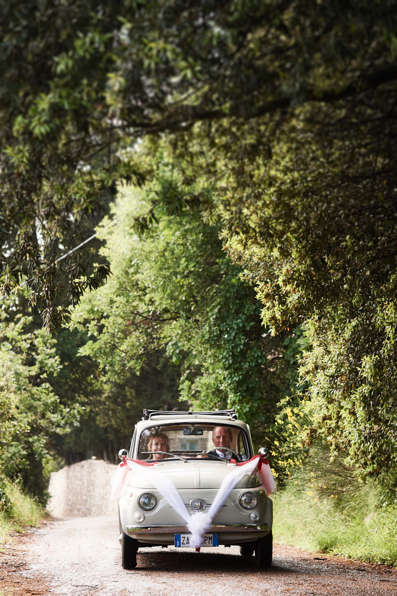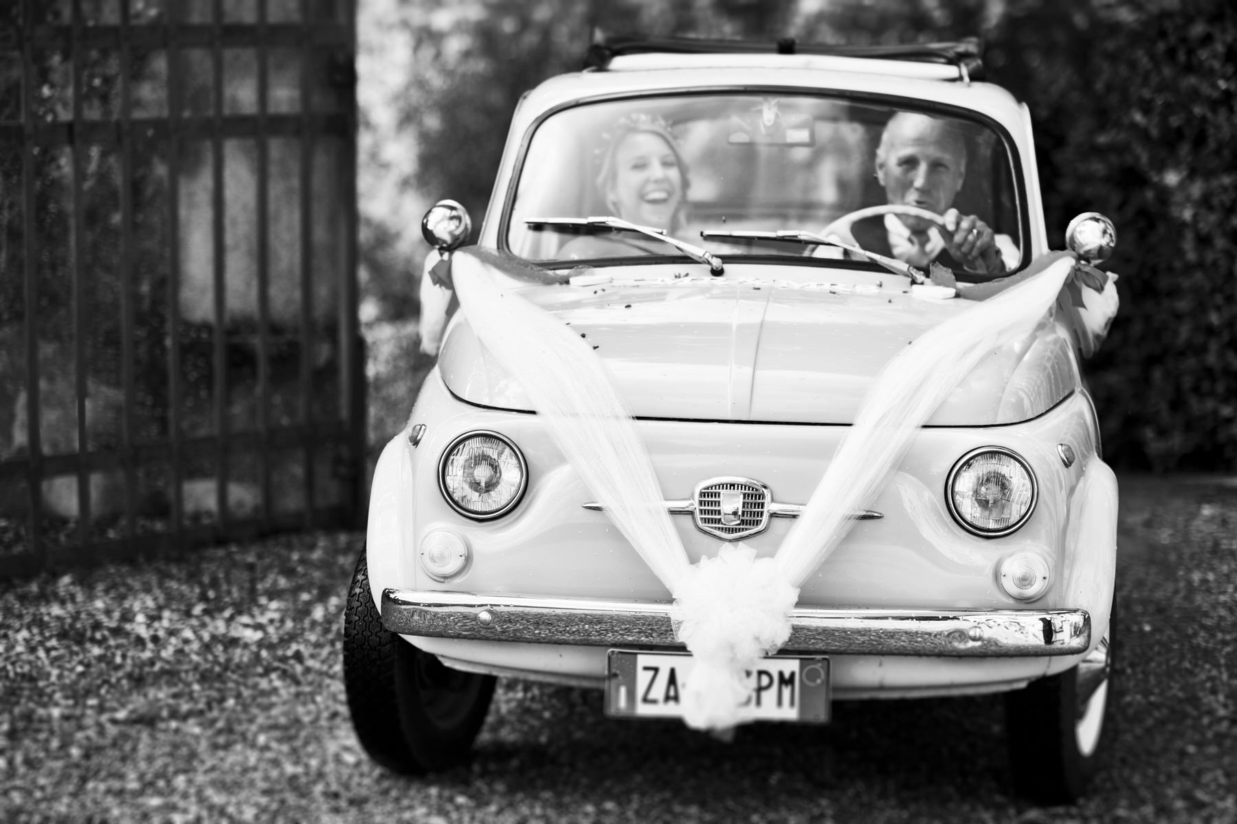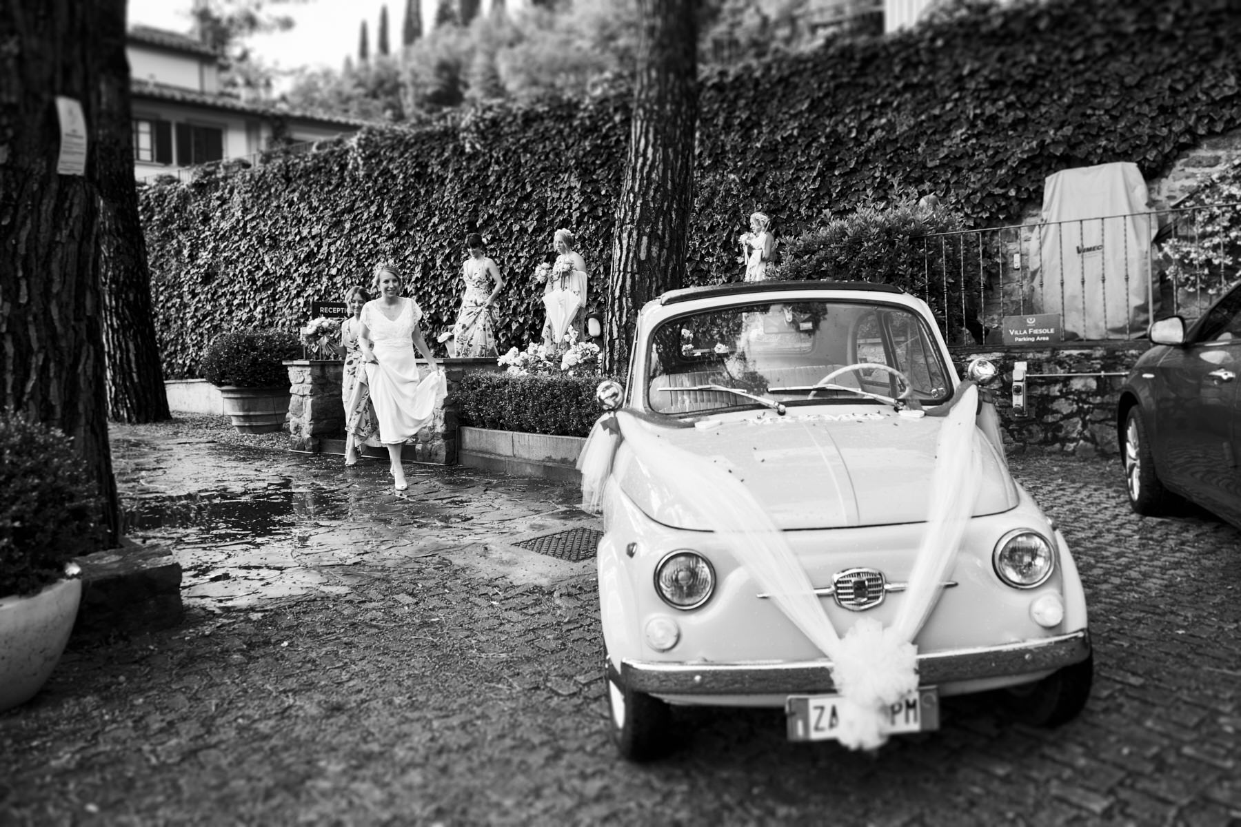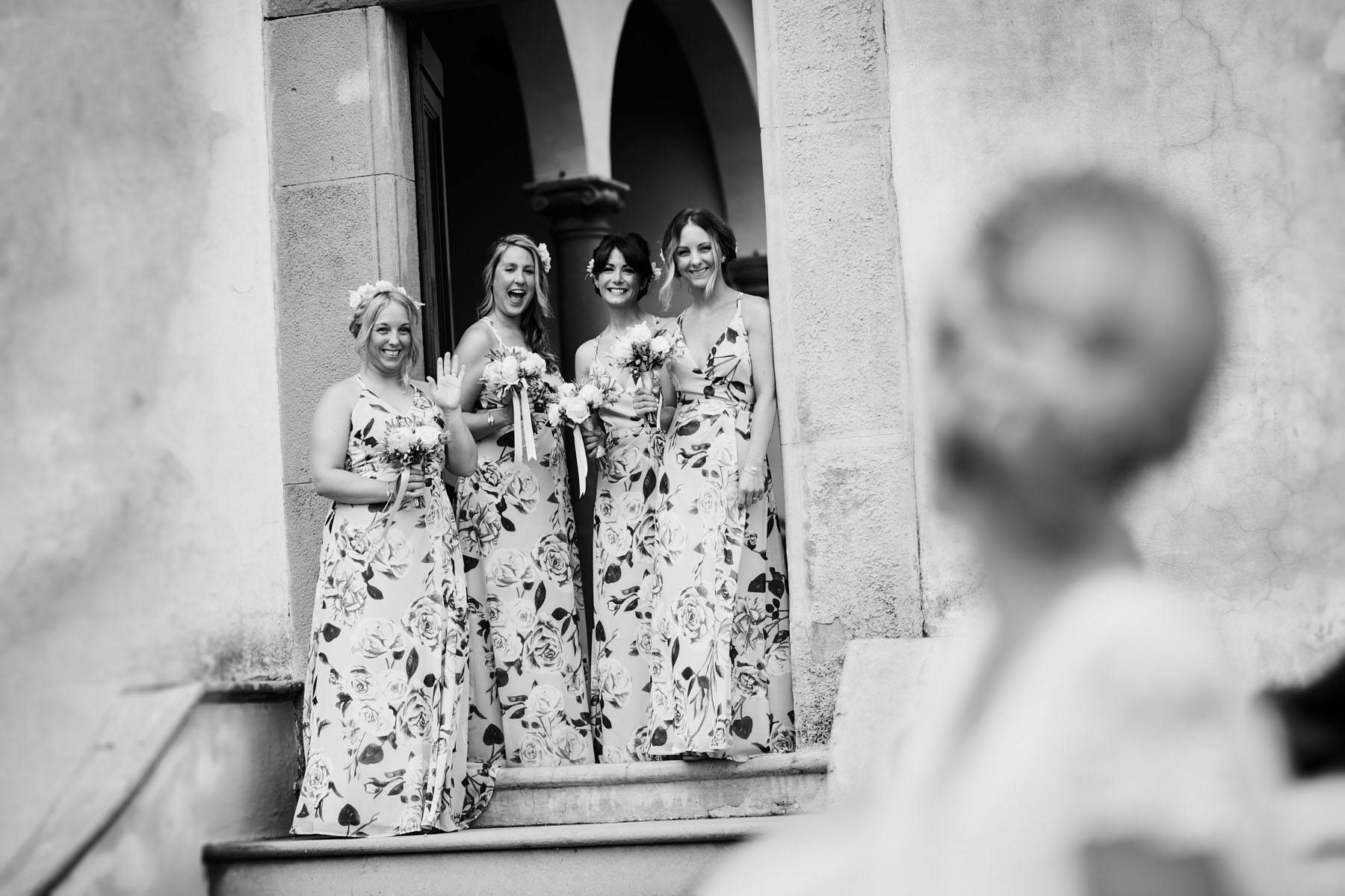A lovely old vintage wedding car Fiat 500 driven carefully by Hayle’s father, was organised to transfer the bride from the getting ready venue to the ceremony. When we arrived I really enjoyed a very important moment which I’ve taken with my cameras. Smiling bridesmaids waiting us at the entrance of the villa while Hayley got out of the car.