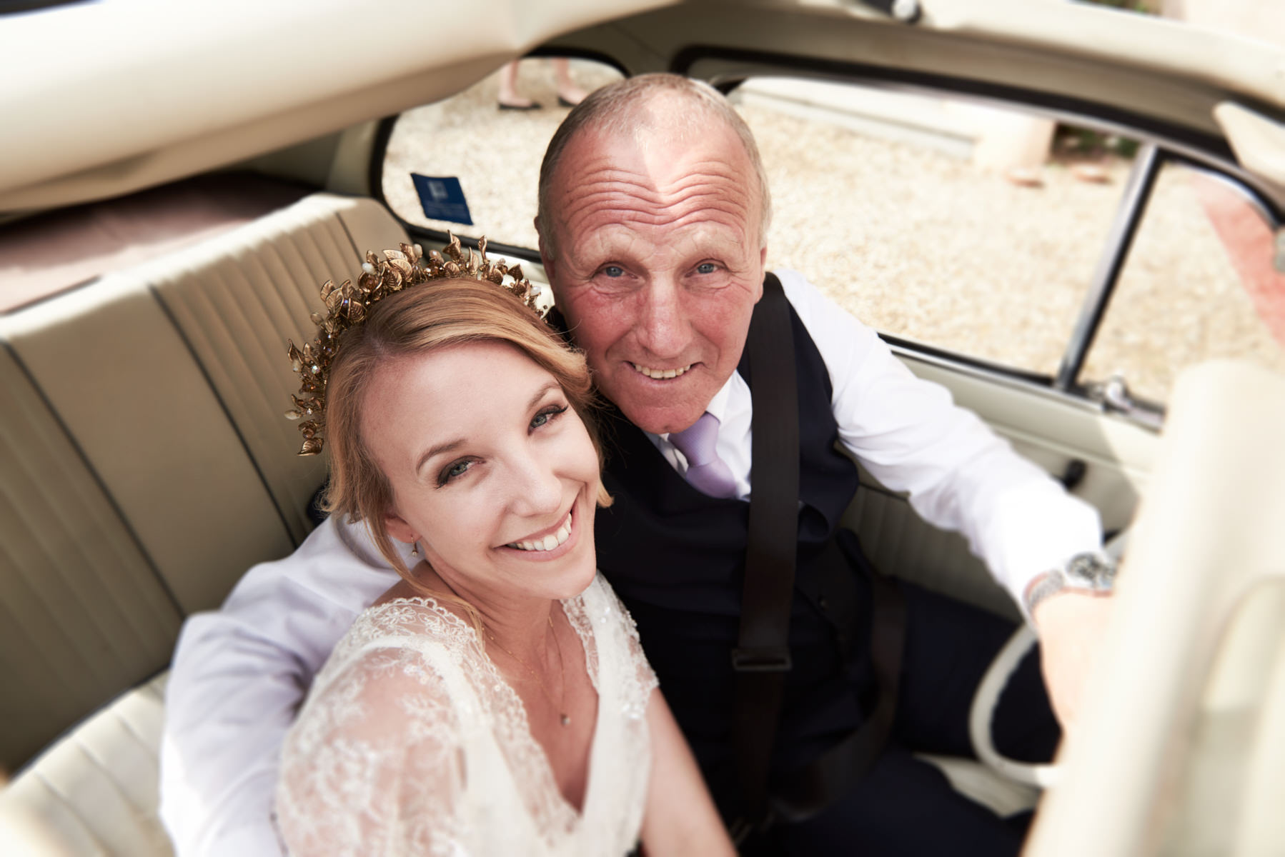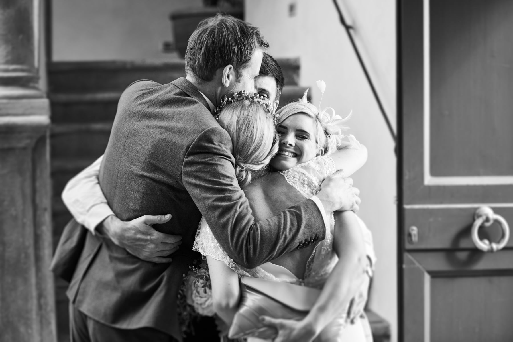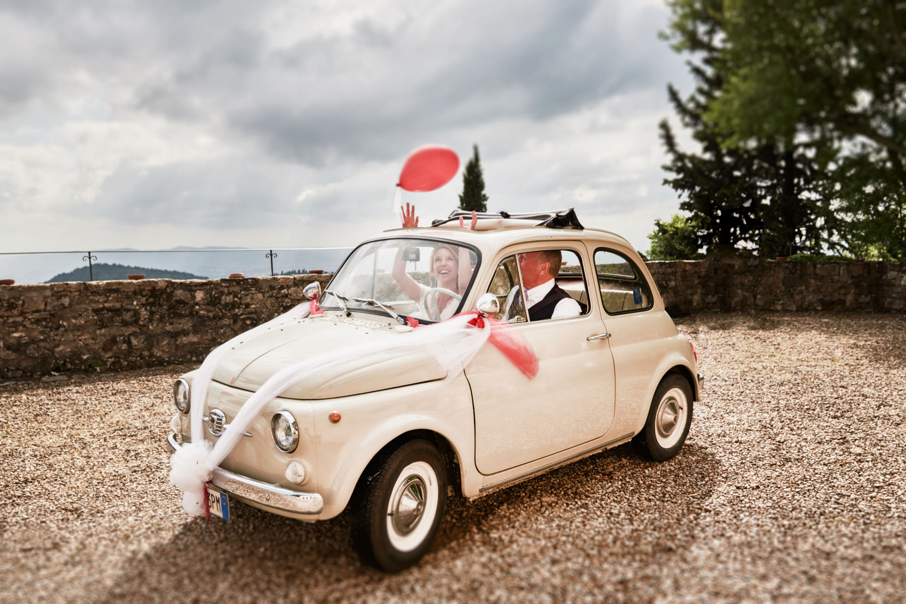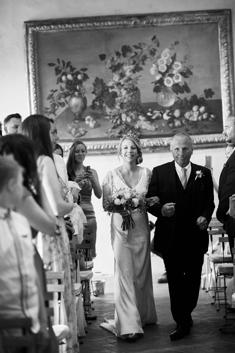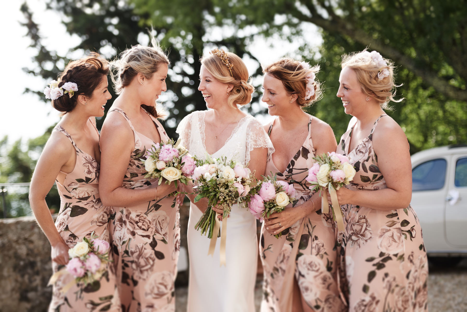 A lovely old vintage wedding car Fiat 500 driven carefully by Hayle’s father, was organised to transfer the bride from the getting ready venue to the ceremony. When we arrived I really enjoyed a very important moment which I’ve taken with my cameras. Smiling bridesmaids waiting us at the entrance of the villa while Hayley got out of the car.