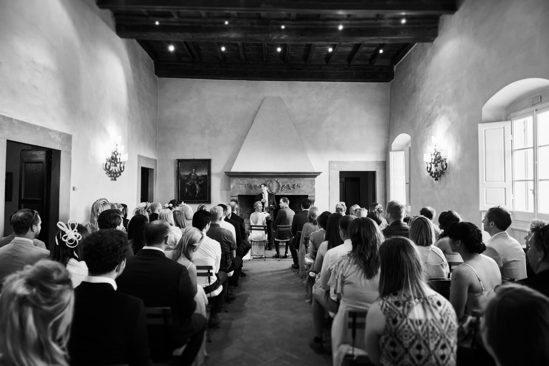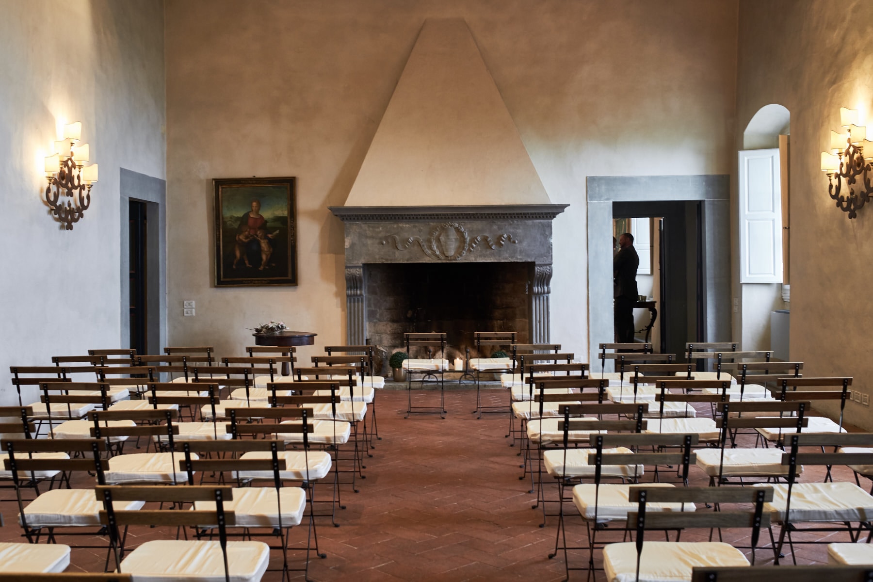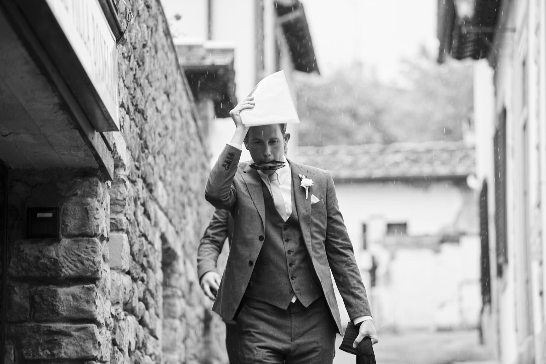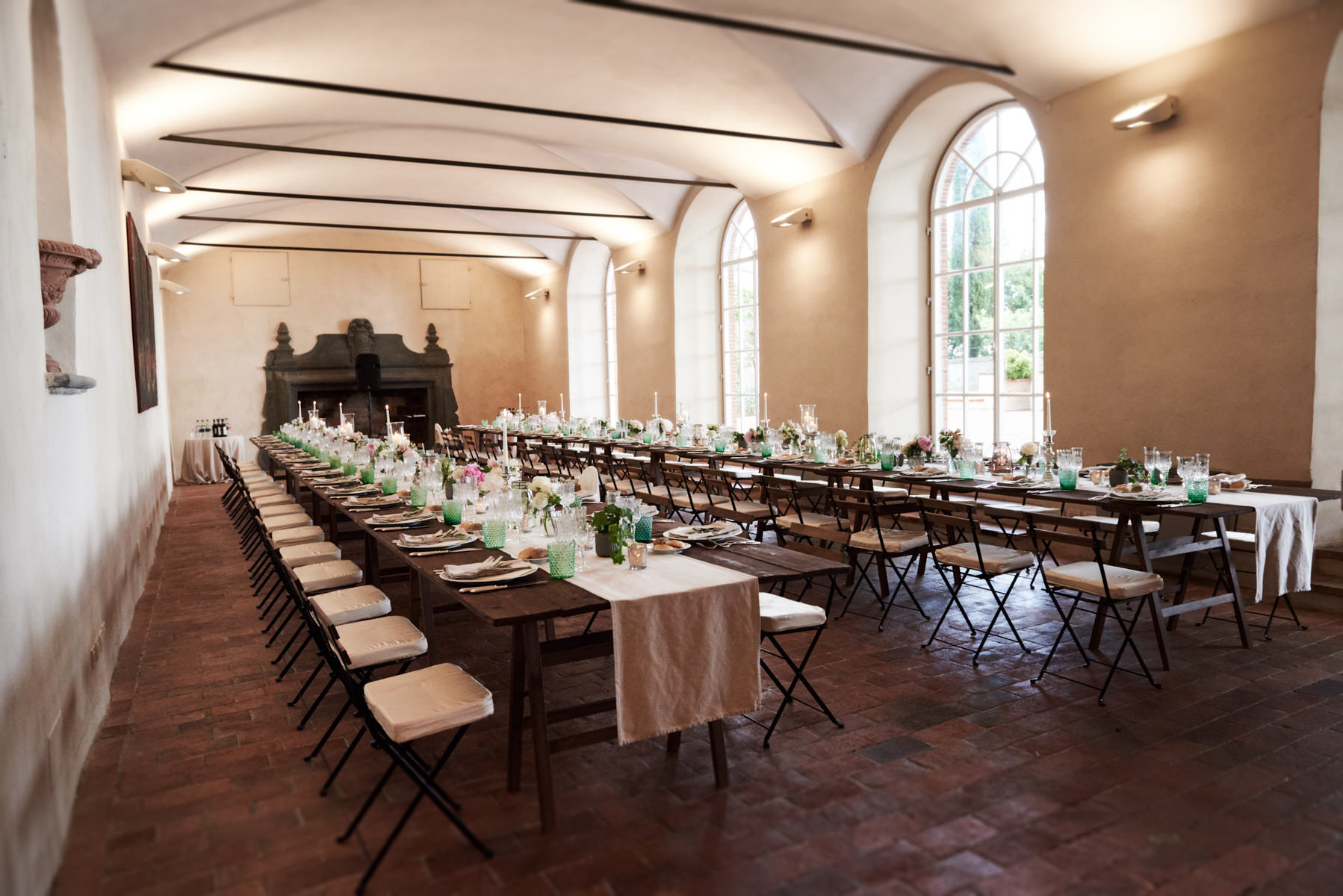 Unfortunately by the heavy rain the originally very fast but emotional outside ceremony was re-planned inside one of the main room of the villa. After the ceremony some portraits with the couple just married into the main garden and after that the country chic dinner at limonaia room planned by Weddings Italy by REGENCY wedding agency.