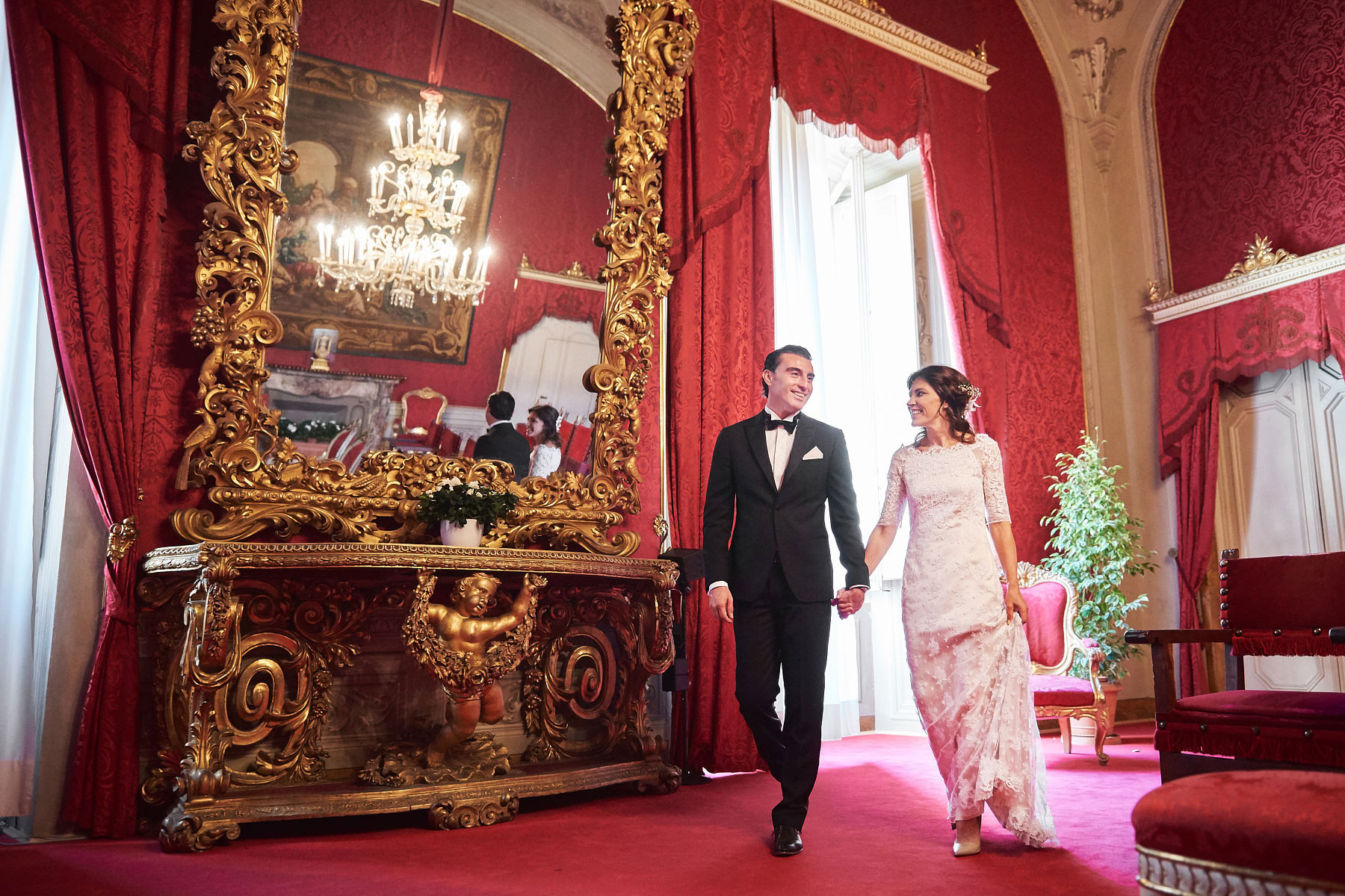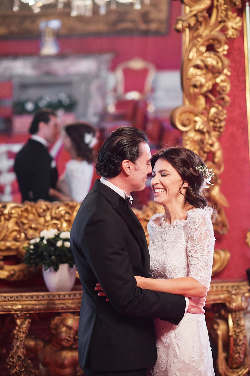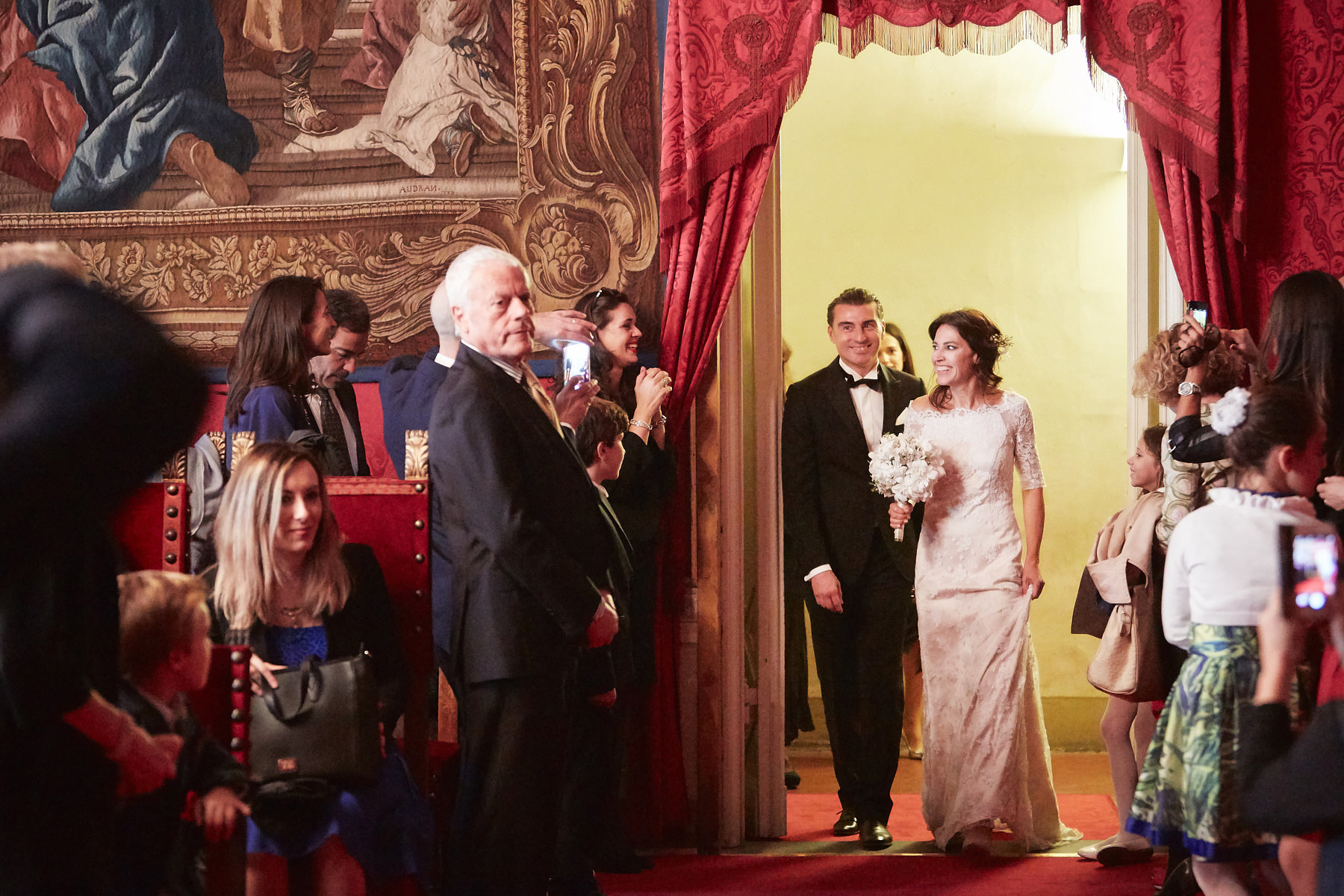 Getting Ready Venue: Hotel Four Seasons Florence | Flower designer by: Vincenzo Dascanio | Bridal Dress: Maria PIA G. Atelier | Groom’s suit: Lanificio Cerruti | Ceremony Venue: Palazzo Vecchio Sala Rossa