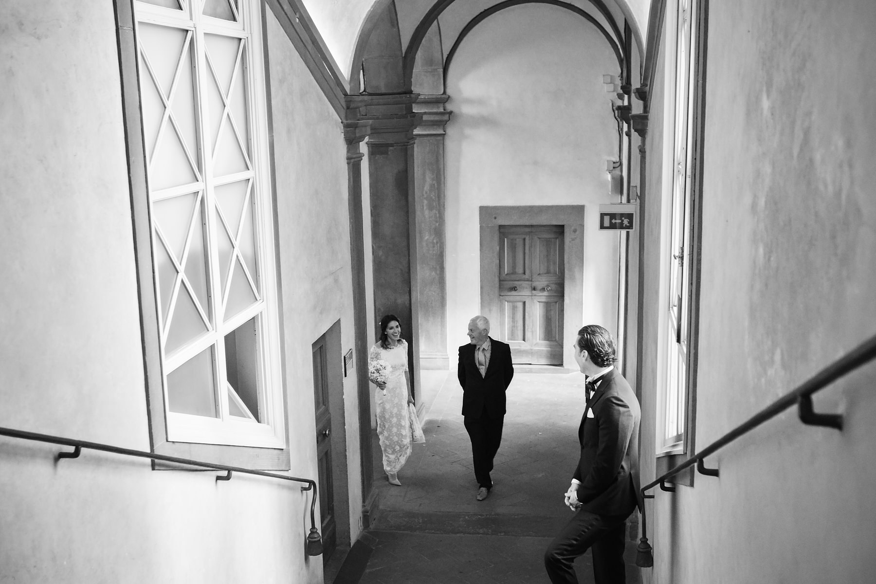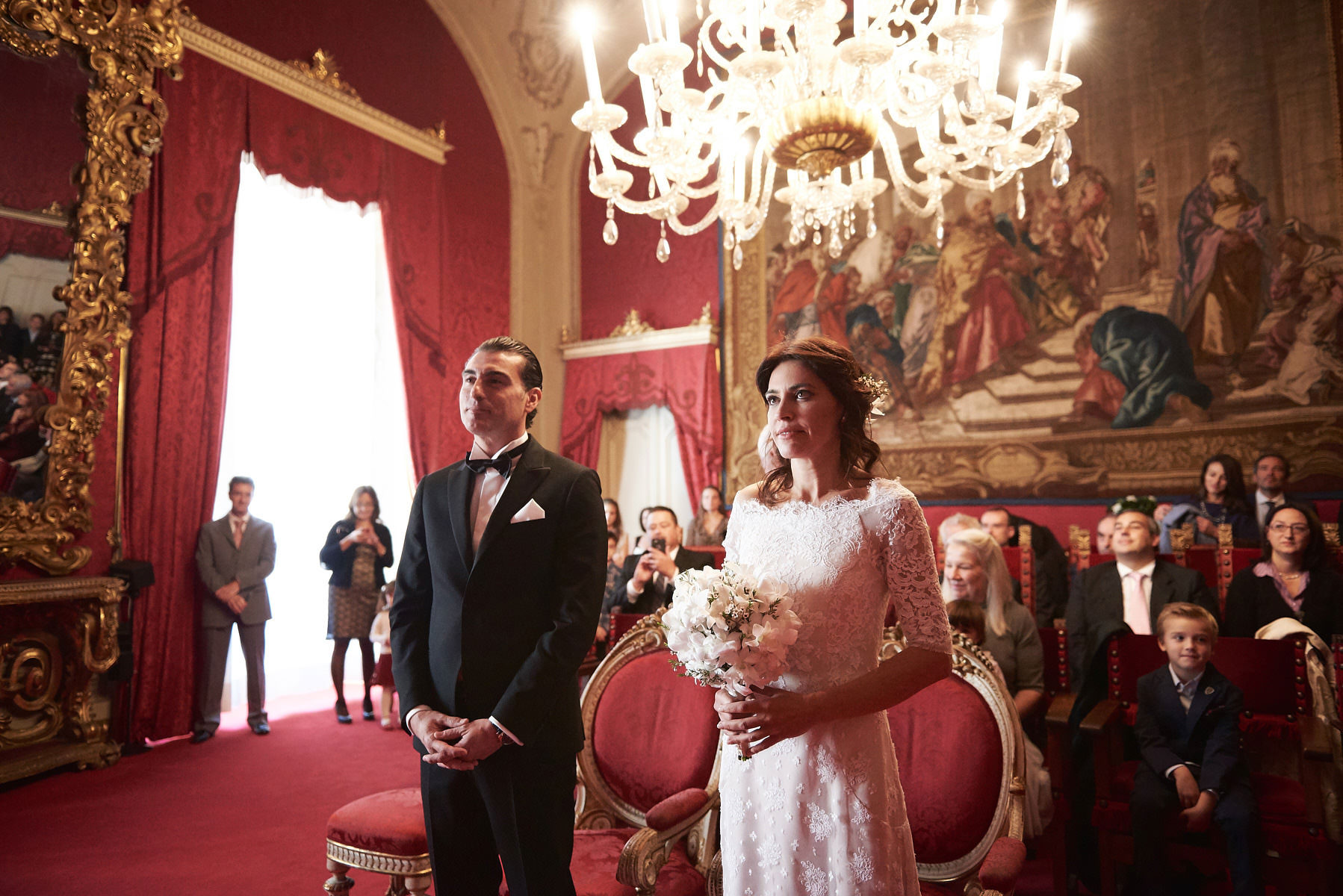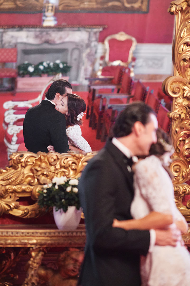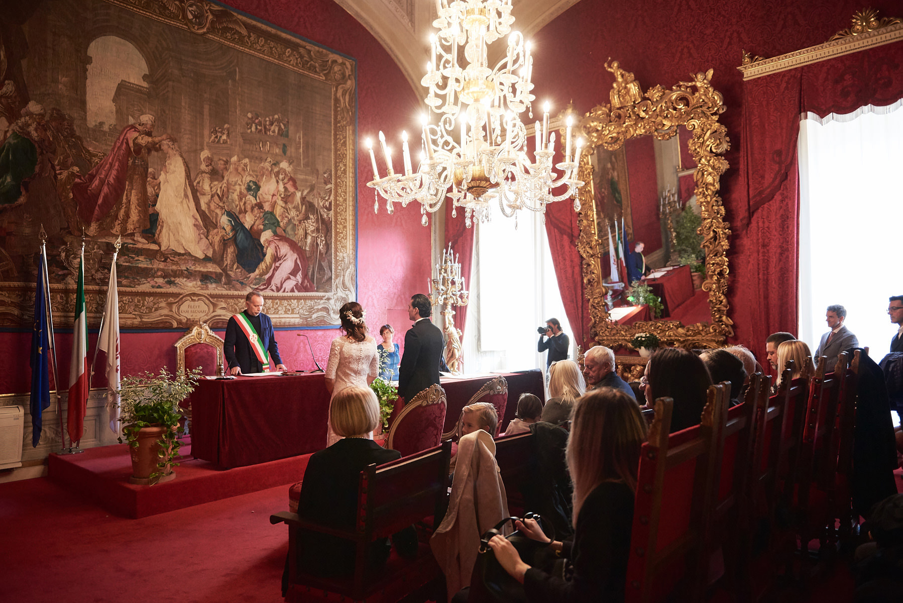 The spectacular back drops and statues in a walled ancient garden, the Gherardesca Garden, served as the perfect photoshoot location for my coworker Alessandro who clicked some perfect shots of the groom, Sergio. Before the bride and groom tied the sacred knot for the rest of their lives and took their vows, they met each other for a short while just before to walk down the aisle. With the mixture of emotions, and excitement, the couple finally entered into the gorgeous Sala Rossa room in the Florence Town Hall.