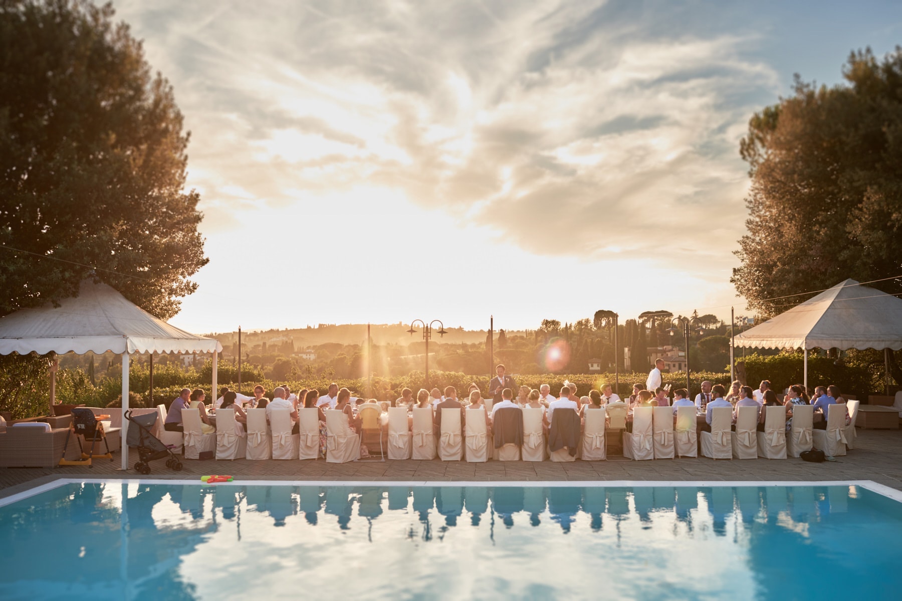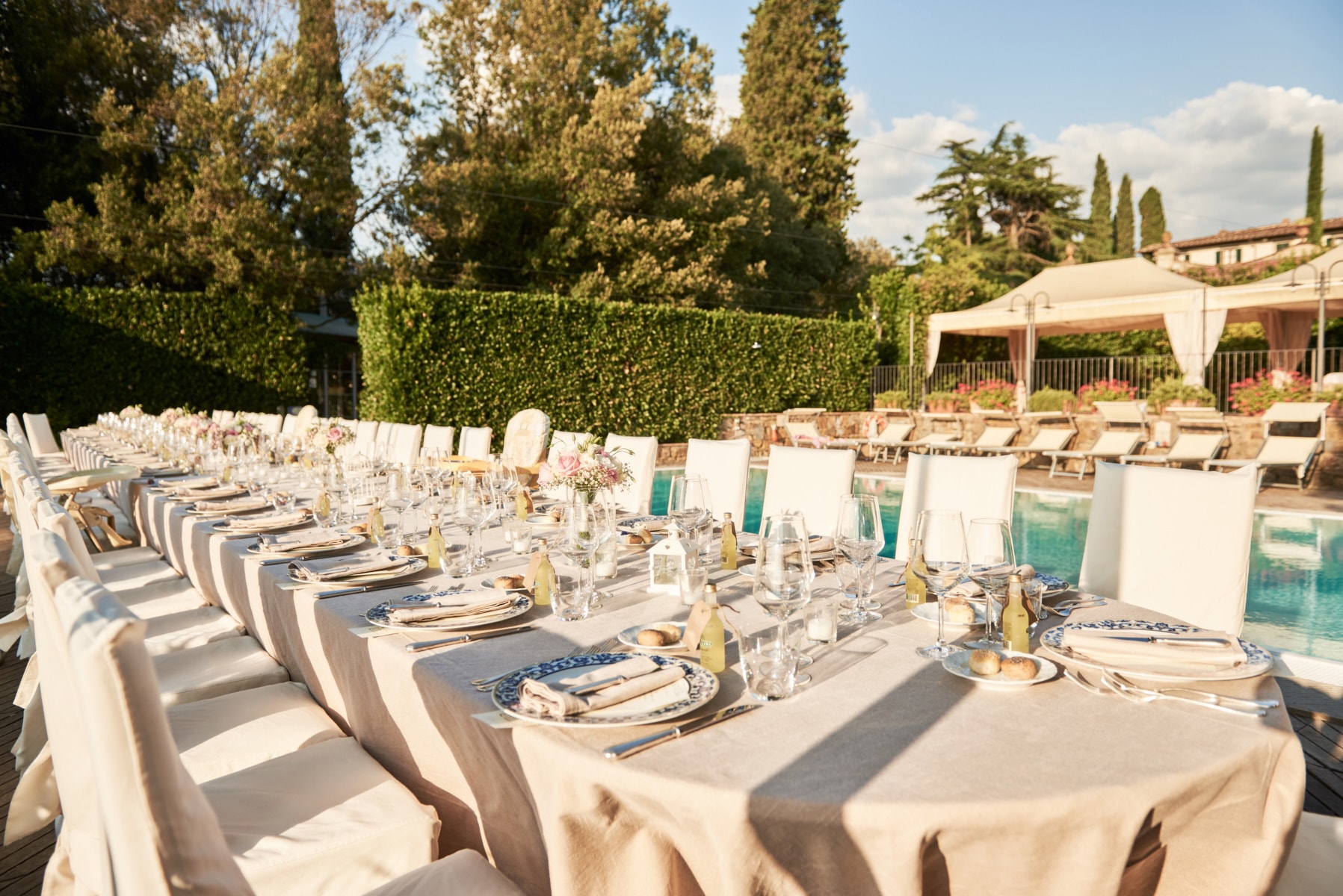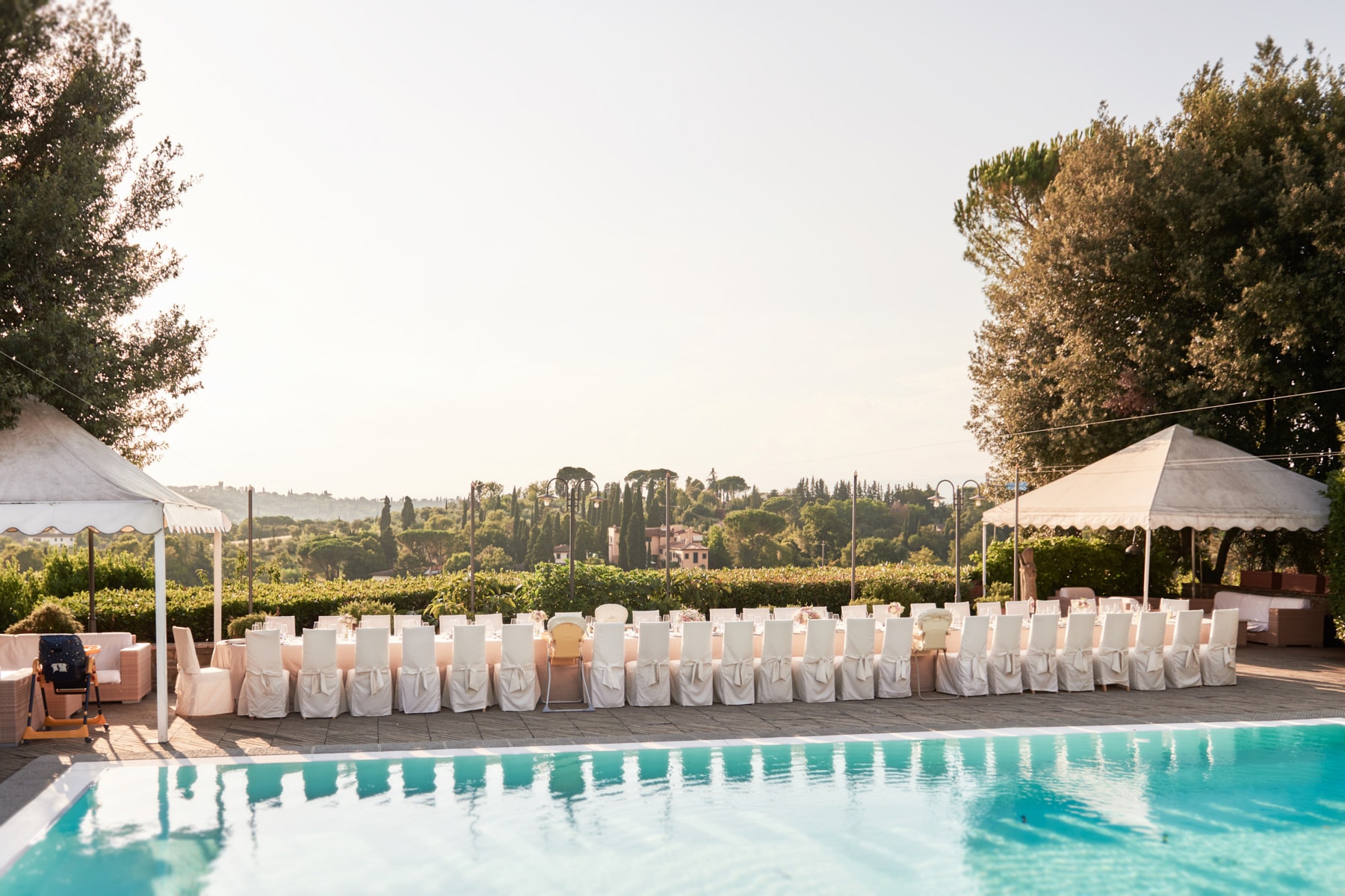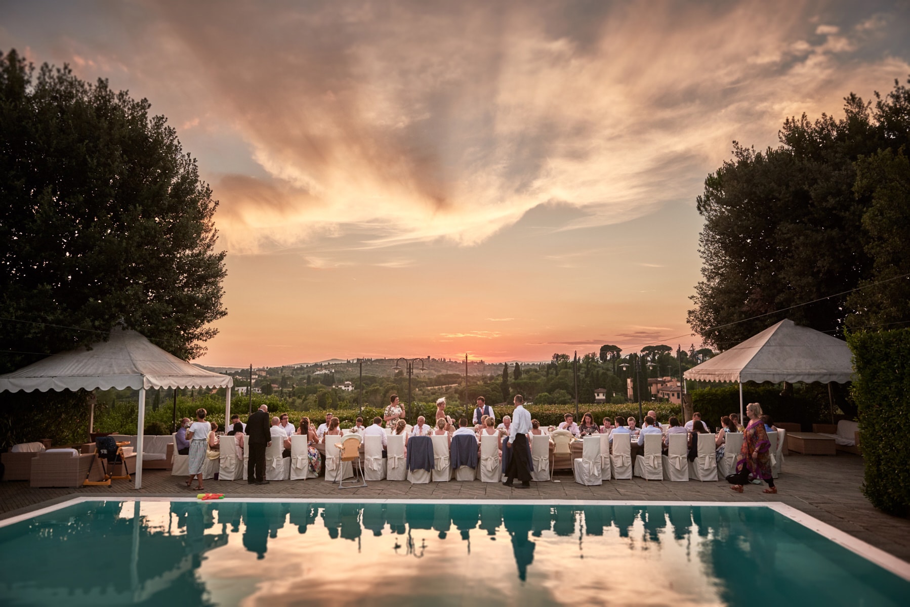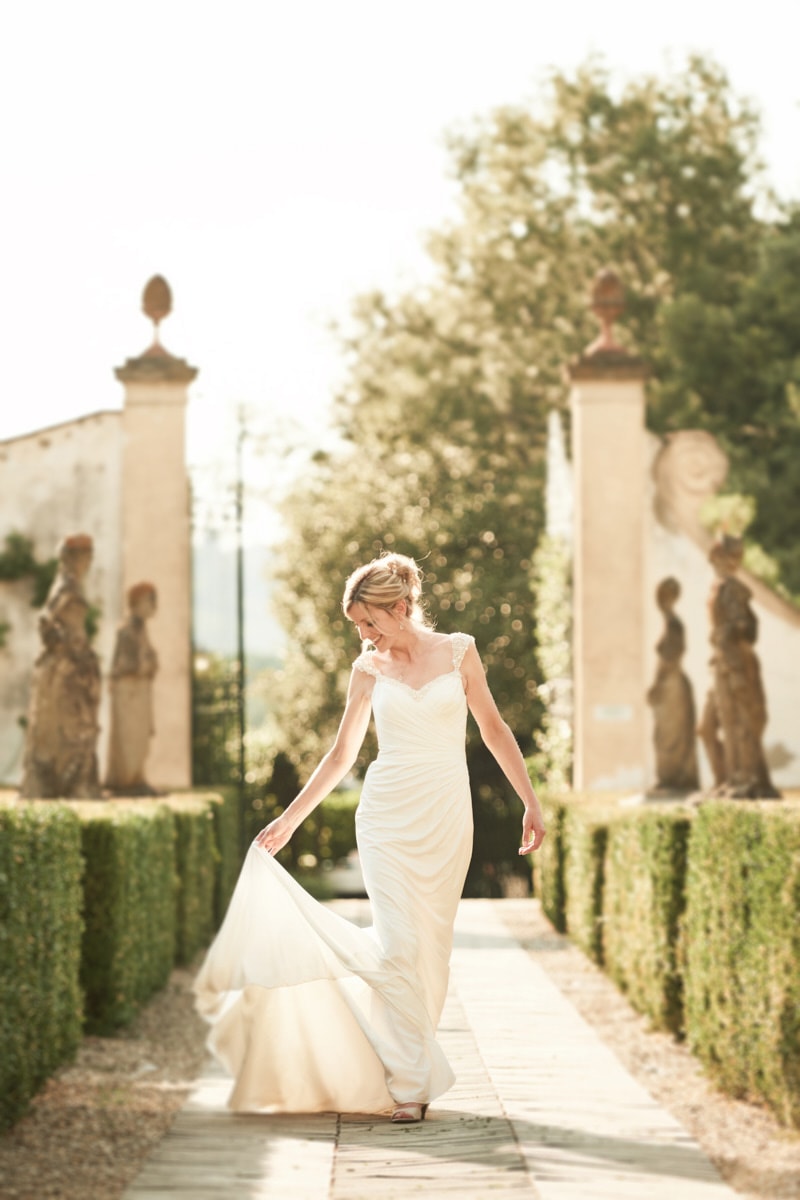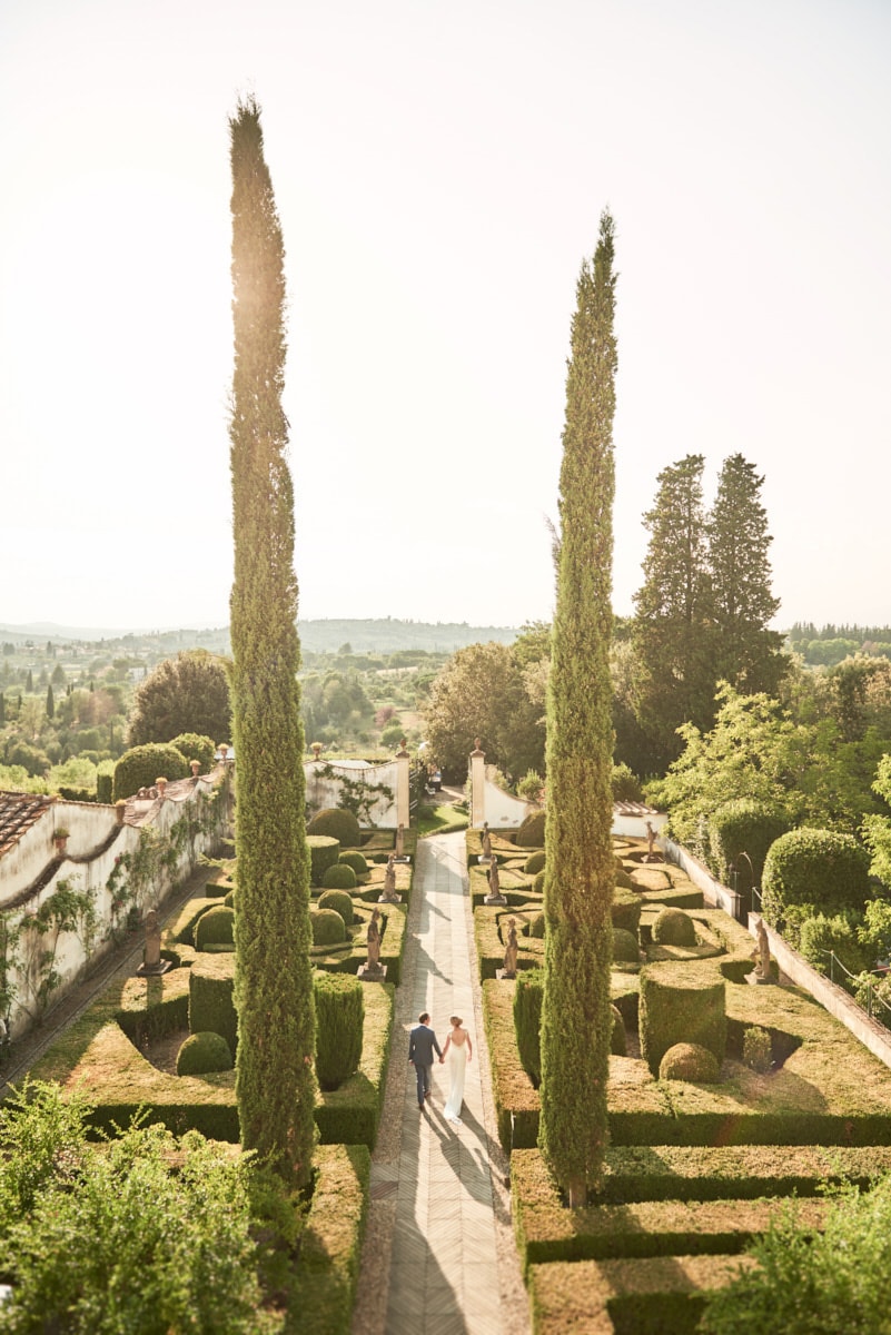 For portrait Elaine and Matt want to to stay inside the venue so we started the shooting by the Italian garden of the villa and then into the beautiful vineyard. I really love the picture taken from the Royal suite balcony while bride and groom walk together toward the main gate of the garden. Light was absolutely gorgeous! Also beautiful the reception setup near the pool with the usual stunning landscape view of the Florence countryside from the imperial table.