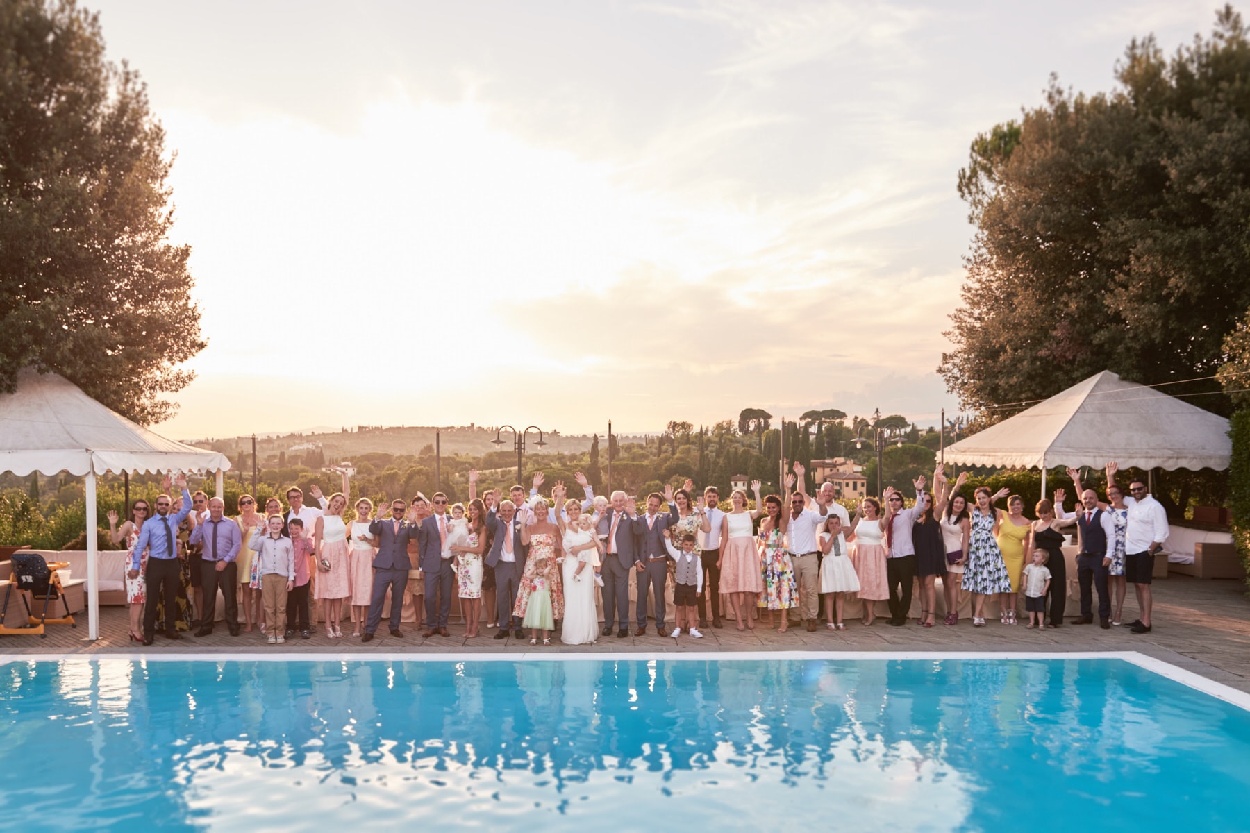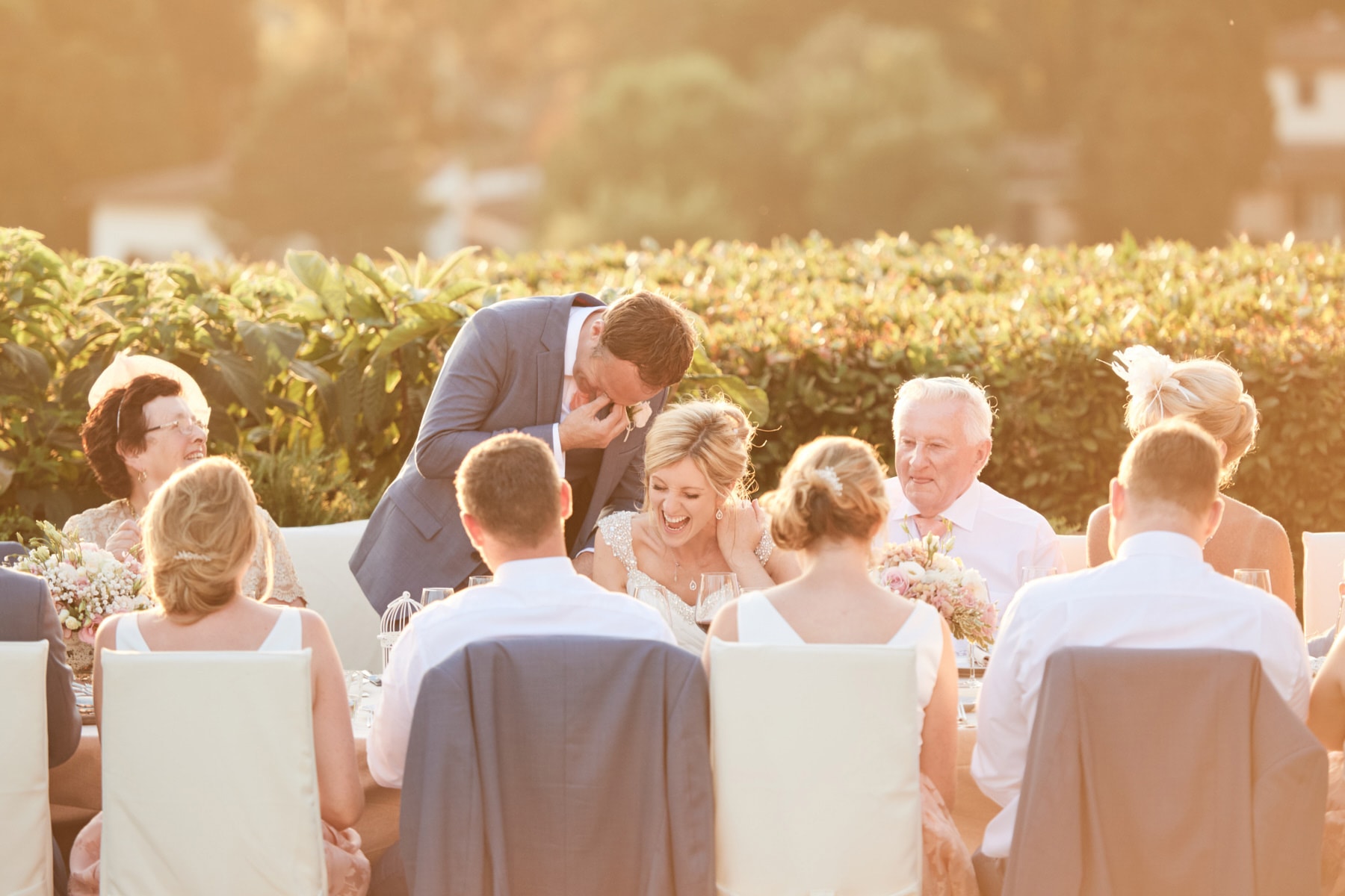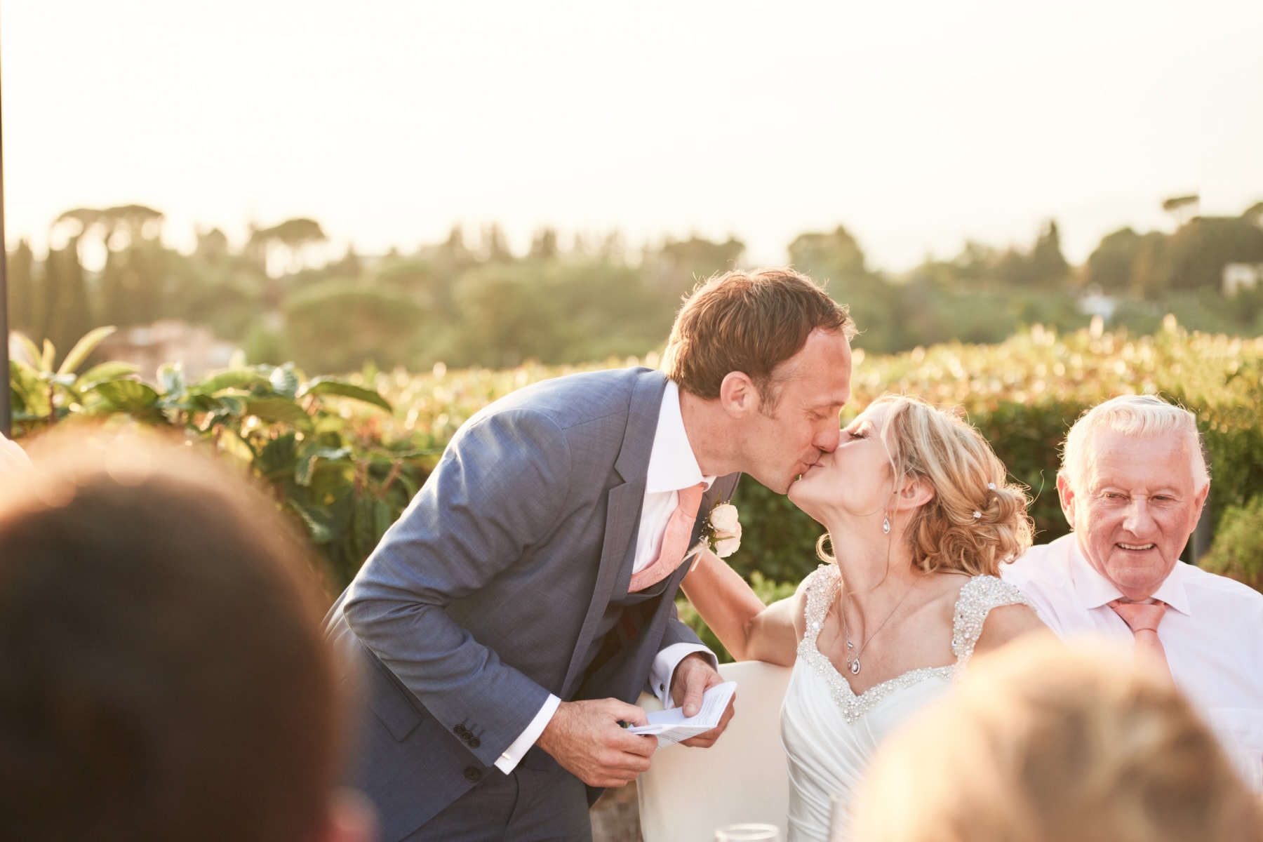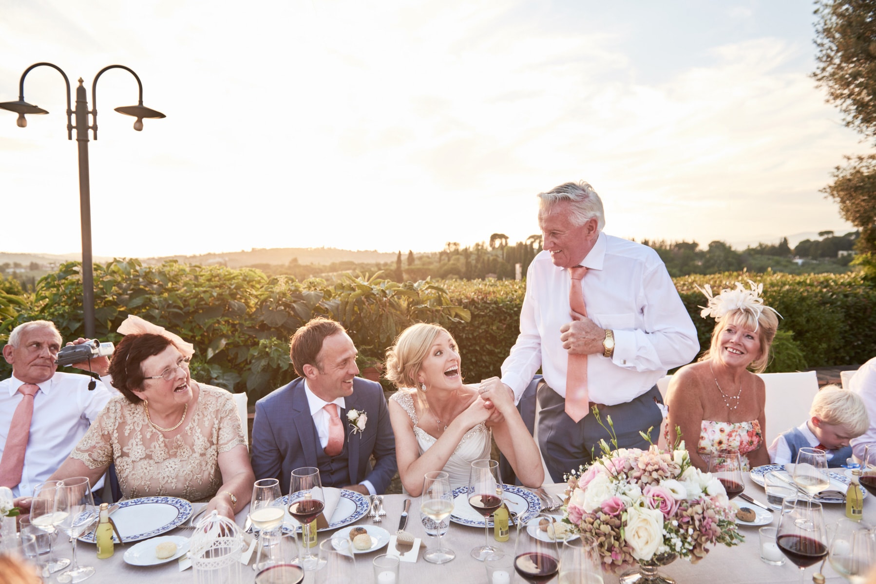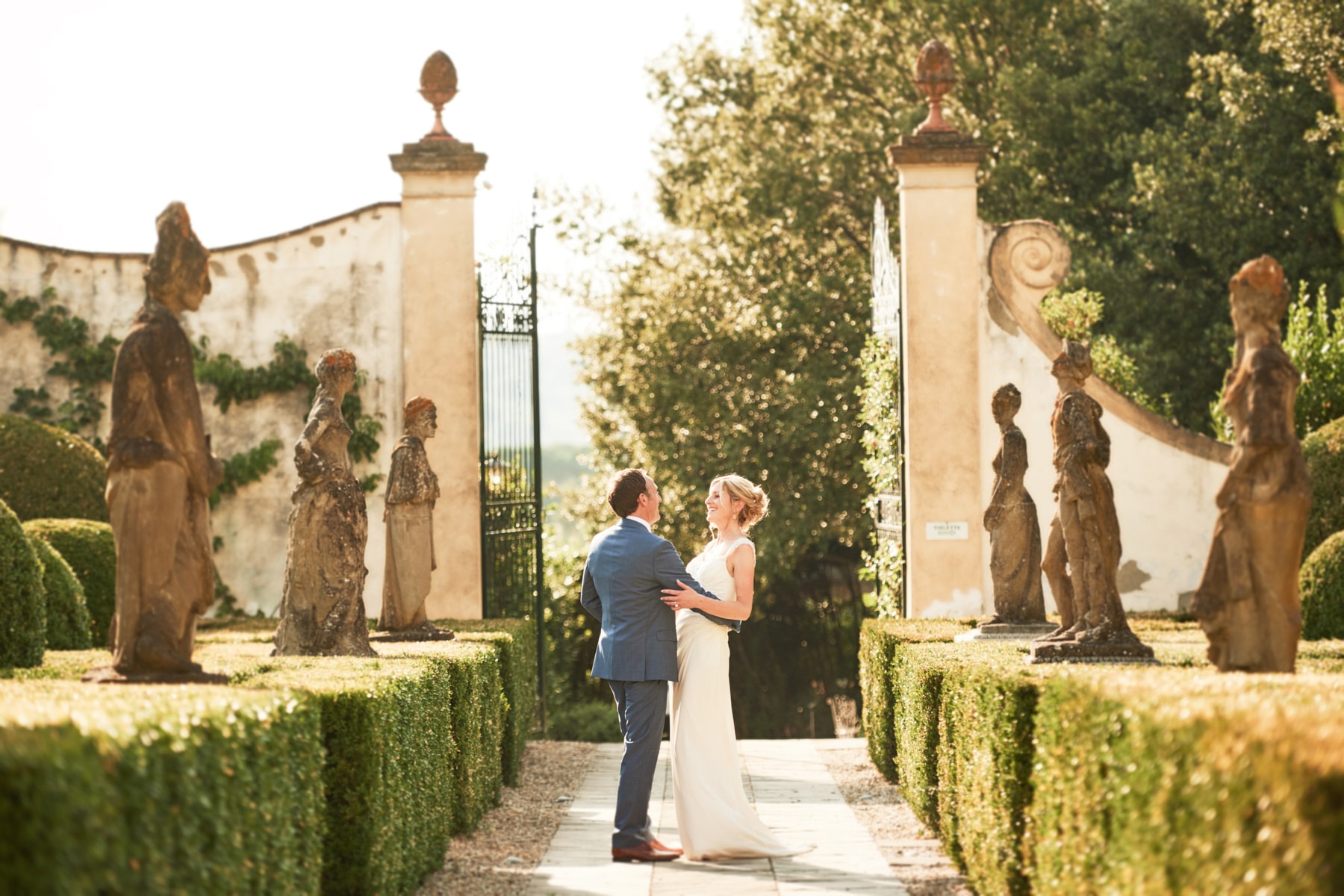 For portrait Elaine and Matt want to to stay inside the venue so we started the shooting by the Italian garden of the villa and then into the beautiful vineyard. I really love the picture taken from the Royal suite balcony while bride and groom walk together toward the main gate of the garden. Light was absolutely gorgeous! Also beautiful the reception setup near the pool with the usual stunning landscape view of the Florence countryside from the imperial table.