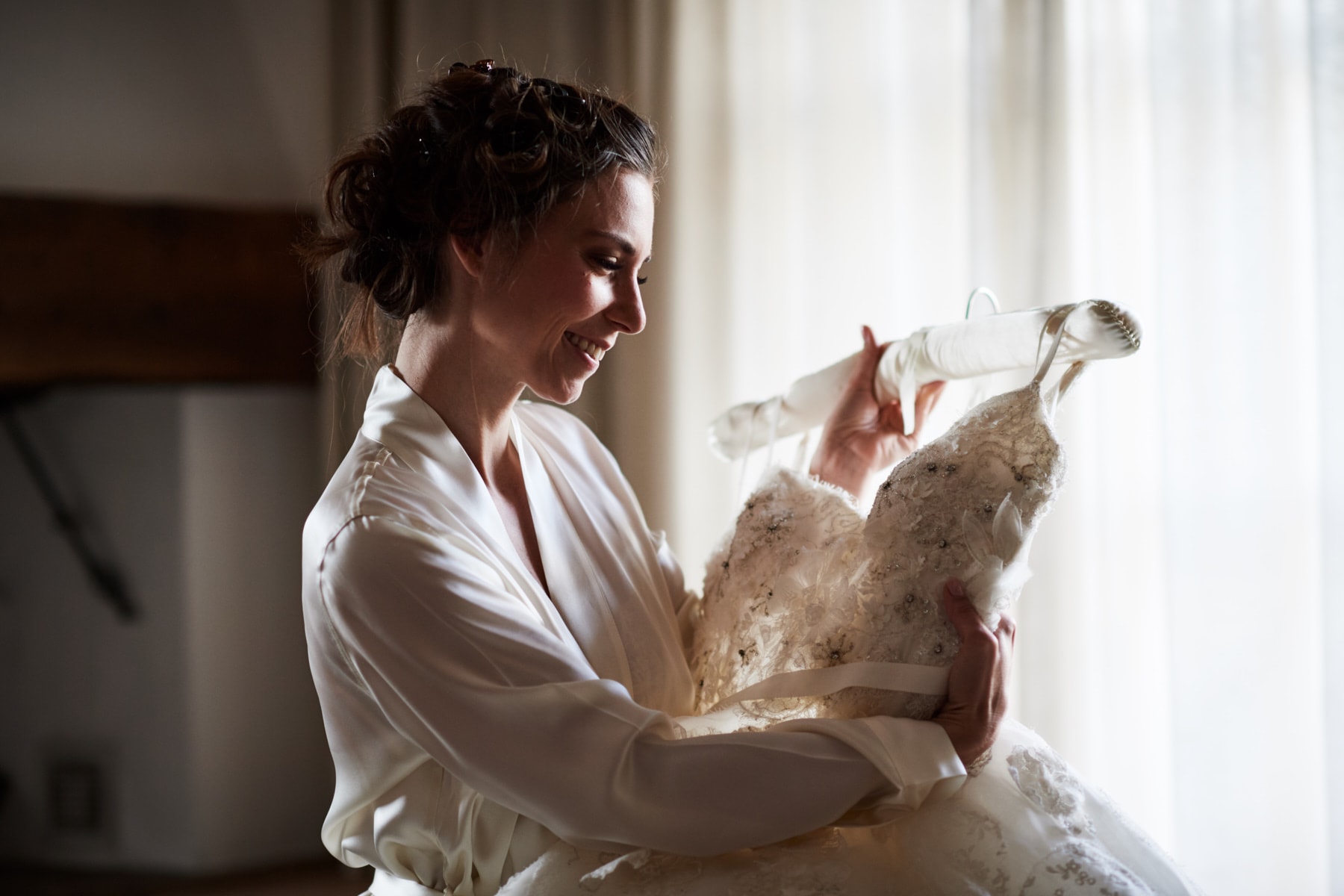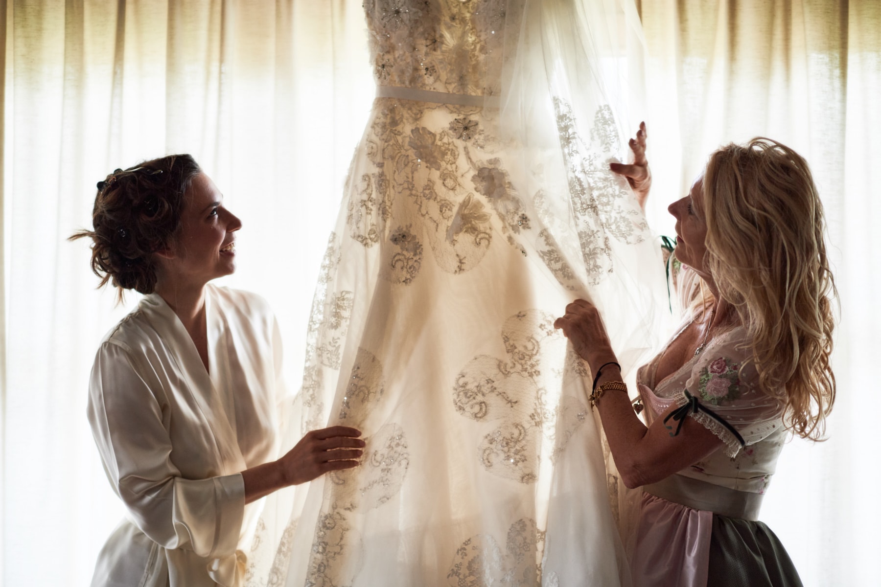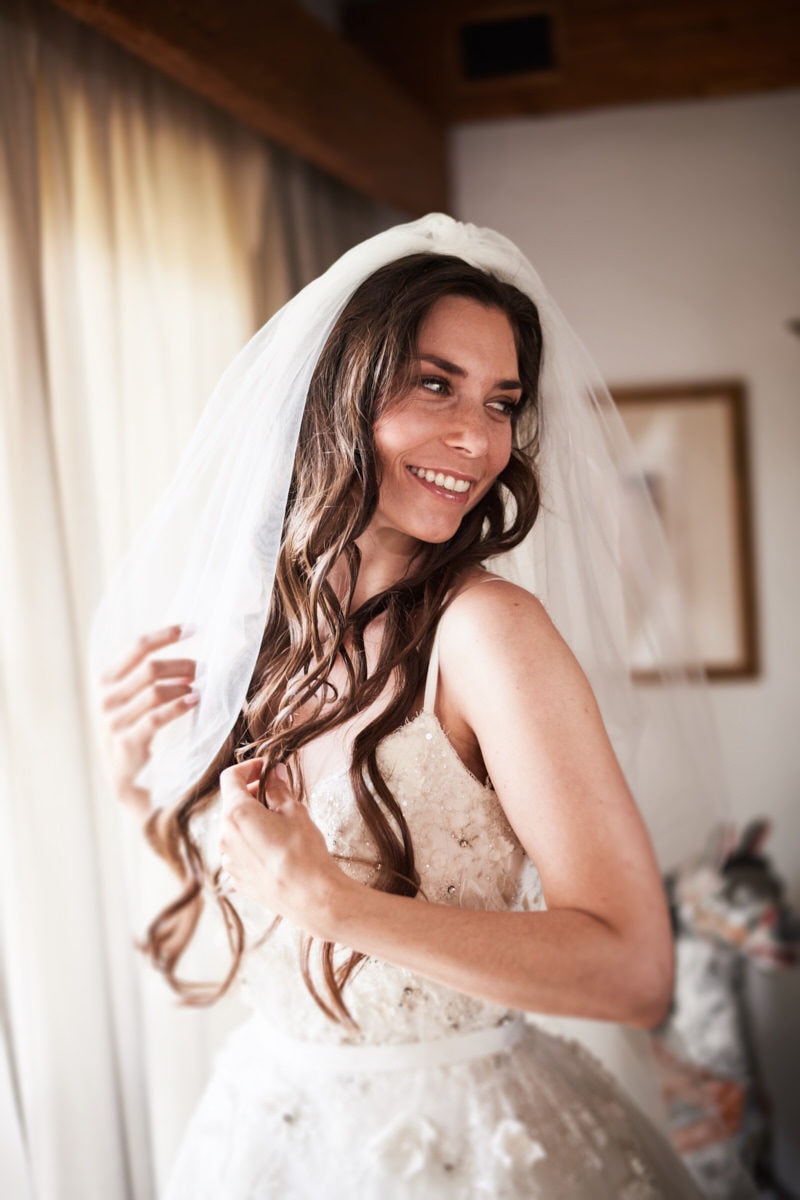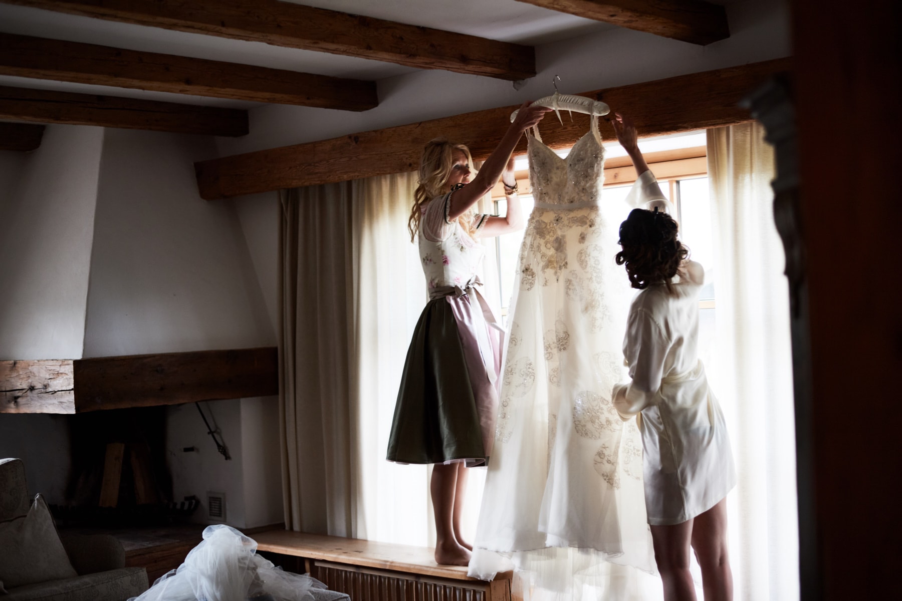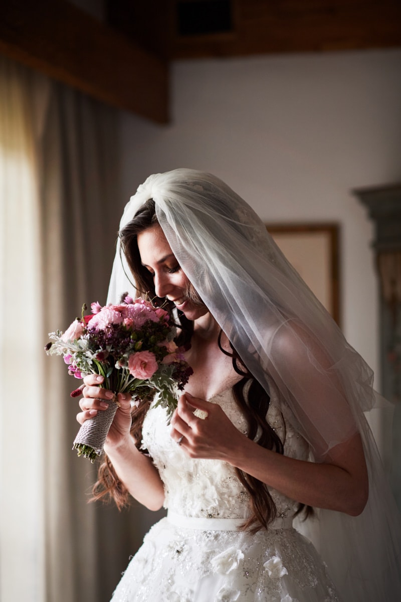 The next day I and Alessandro start the “big” day in the early morning for Linda’s getting ready which has been to parent’s private and luxury house which I decided to not show here for privacy reason. The atmosphere is extremely relaxed and I quietly begin to photograph bride accessories starting from the magnificent wedding dress made by Elie Saab Couture and shoes made by Valentino . Then my mind goes to the imposing mountain so I quickly decide to bring the shoes outside for some shots with the wedding venue as backdrop. Very characteristic also the colorful chic country bridal bouquet made by the flower designer Andreas Bamesberger Zweigstelle Vienna . After the getting ready we went directly to the cable car toward the ceremony venue at the top of the mountain.