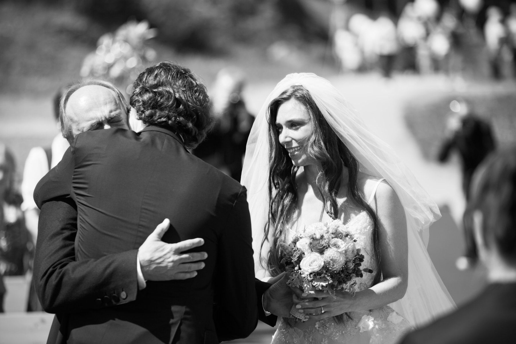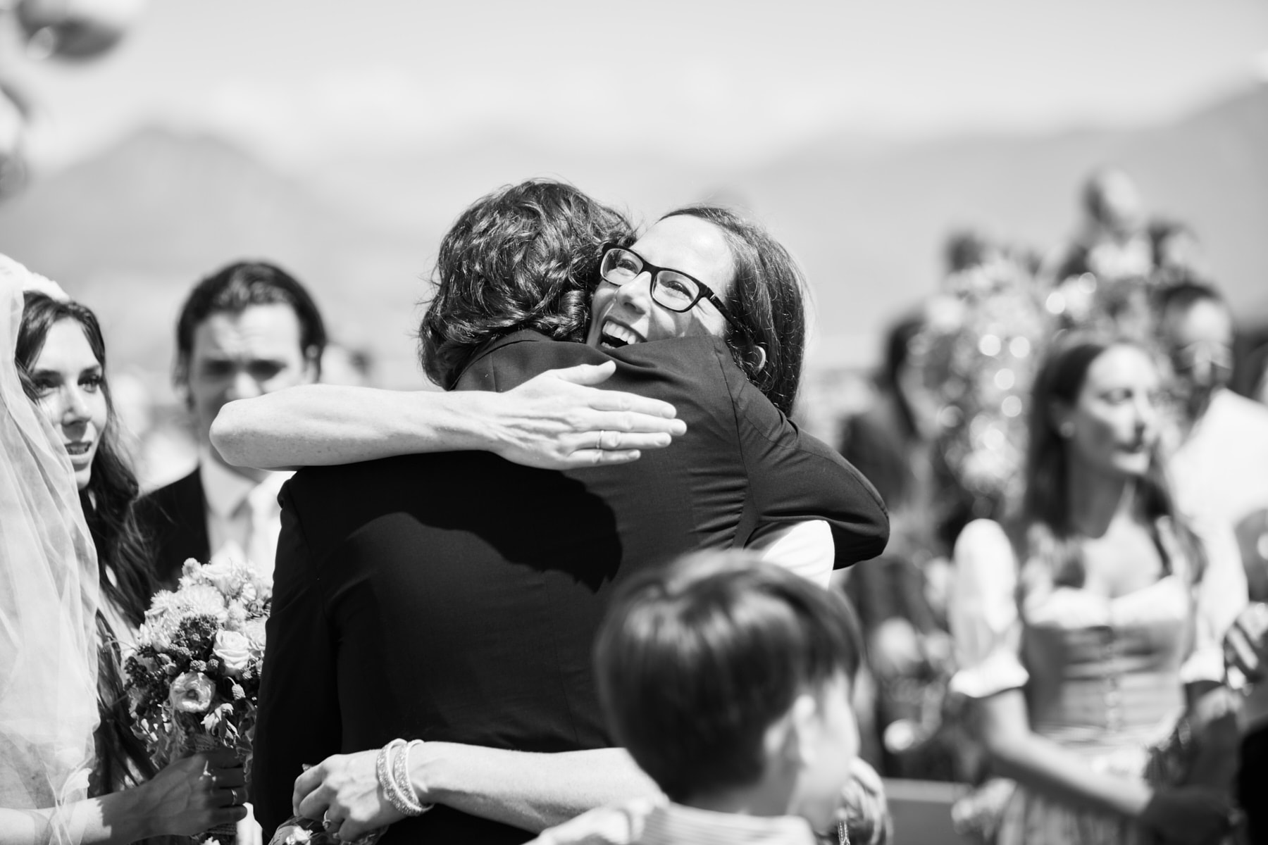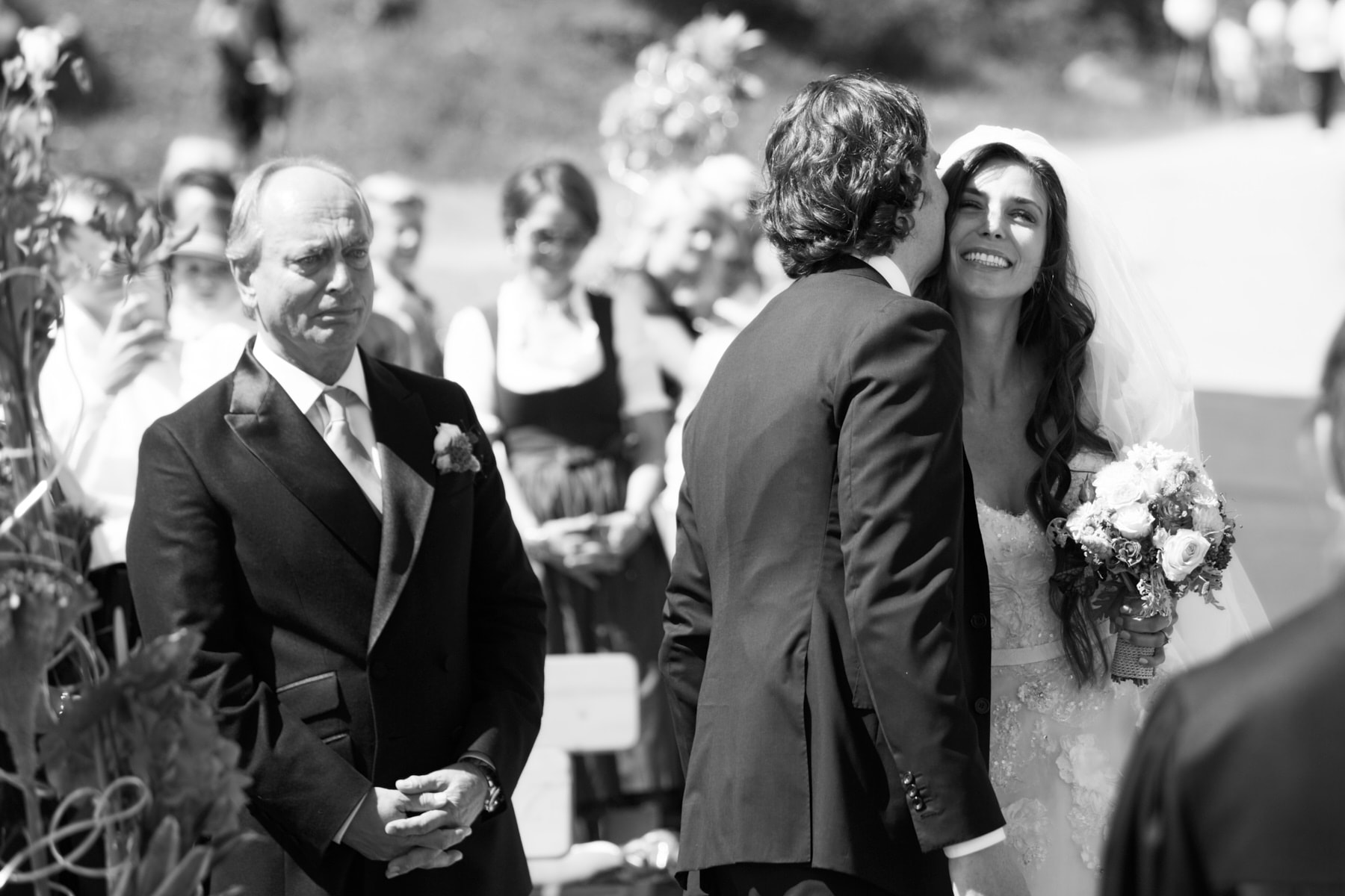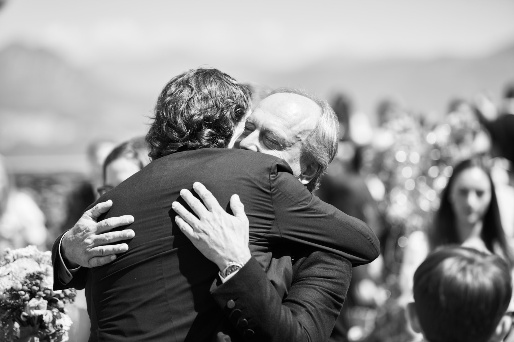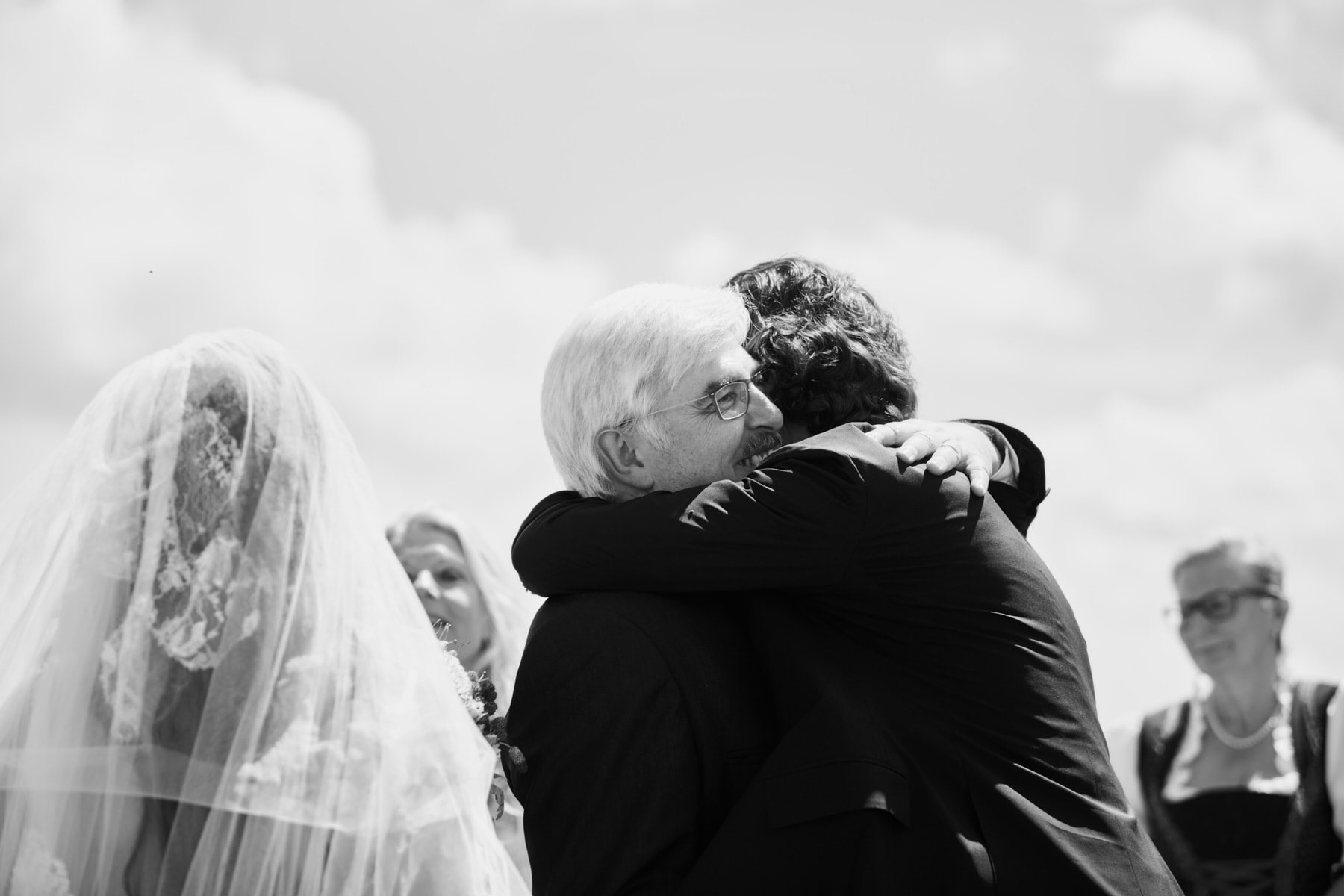 Meanwhile the weather, not particularly favorable to that point, suddenly improve and allow the sun to bright more the civil celebration and make everyone happy, including us. Our first international destination wedding could not be celebrated in the rain! By the way the temperature was perfect and the view of the Mountains was exciting as well as the groom Claus during the “first look” of his beloved future wife that slowly join him amiably greeted by friends and relatives, and accompanied by her father. A little further on, a memorable moment happened in front of me when the Linda’s dad embrace Claus at the end of the aisle.