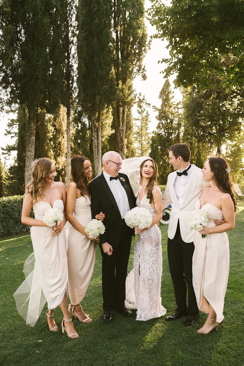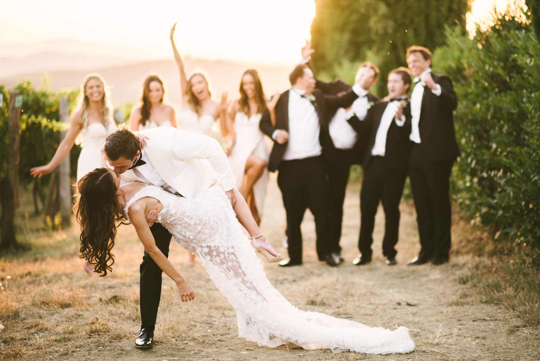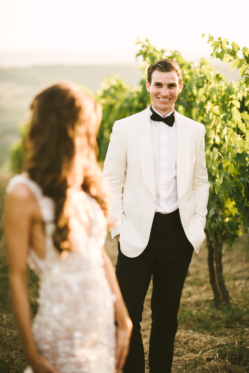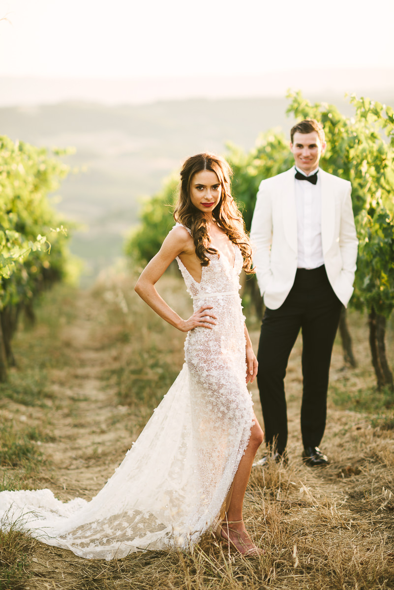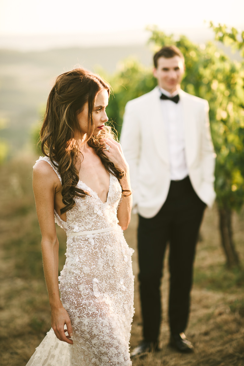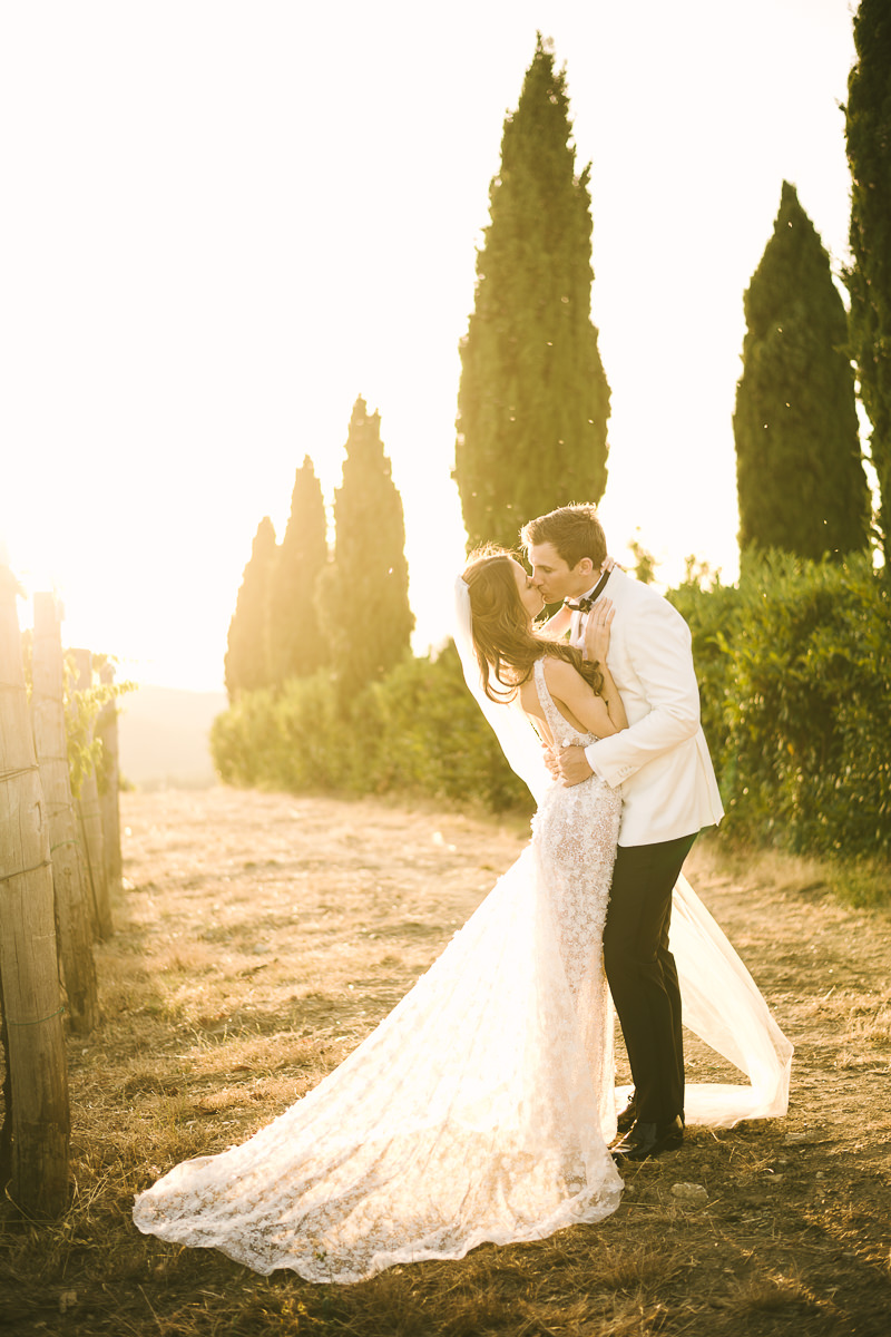 After it, the newlyweds and all their guests enjoyed a cheerful cocktail hour and had fun during the photo shoot. There’s an incredible vineyard in the farmhouse surroundings, where the golden hour light of sunset meets the green of the trees gifting the bride and groom with the best possible setting for their Tuscan wedding photos.