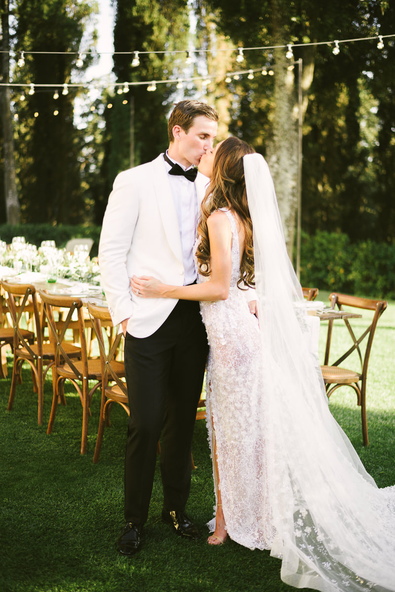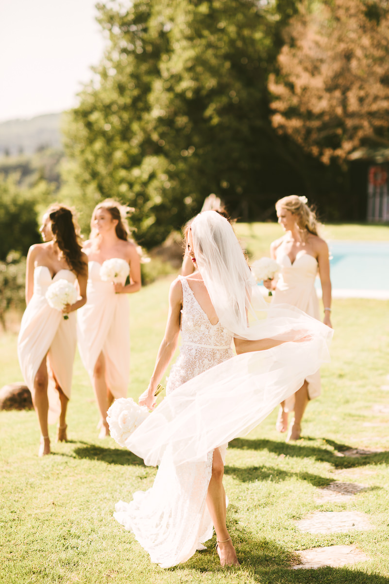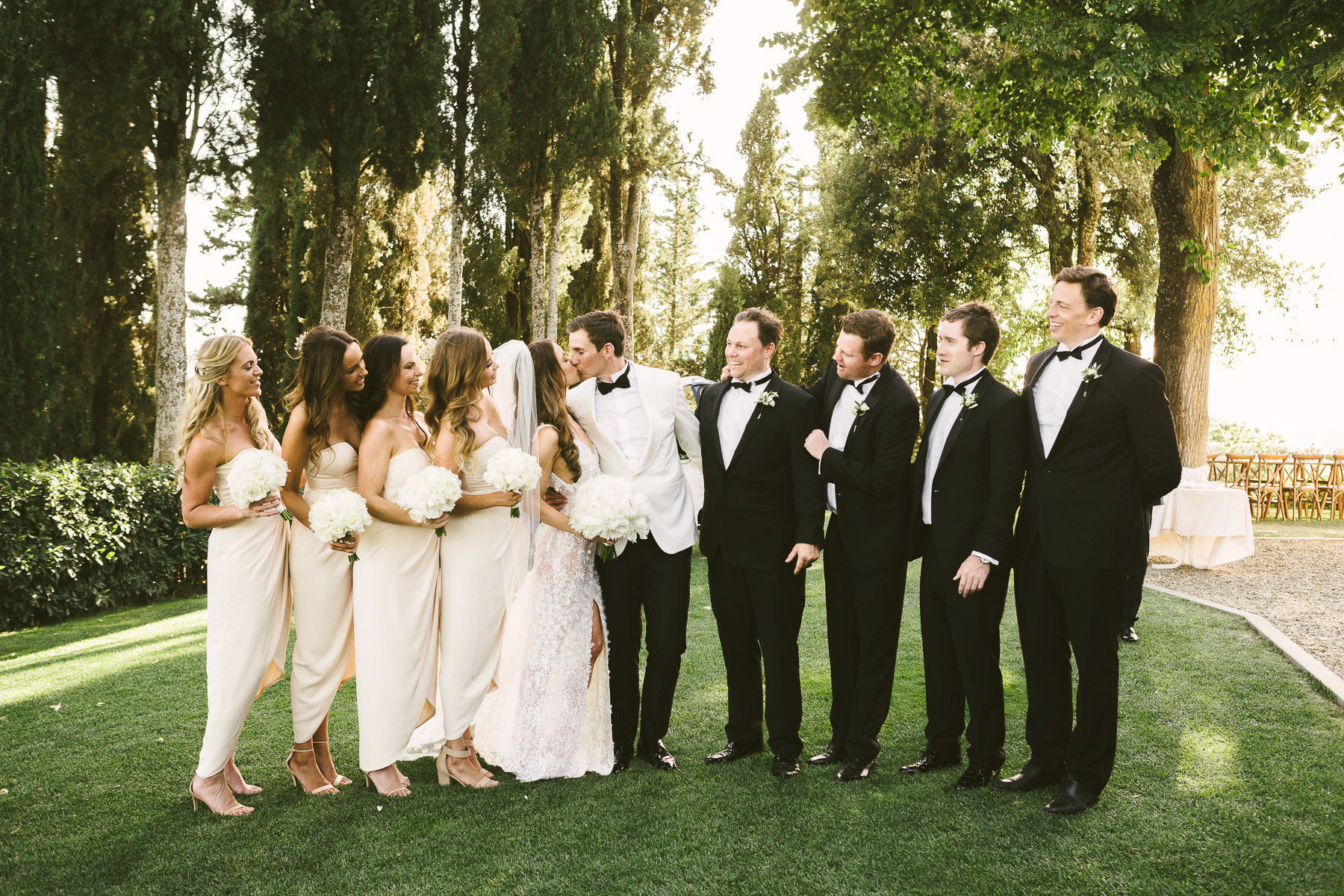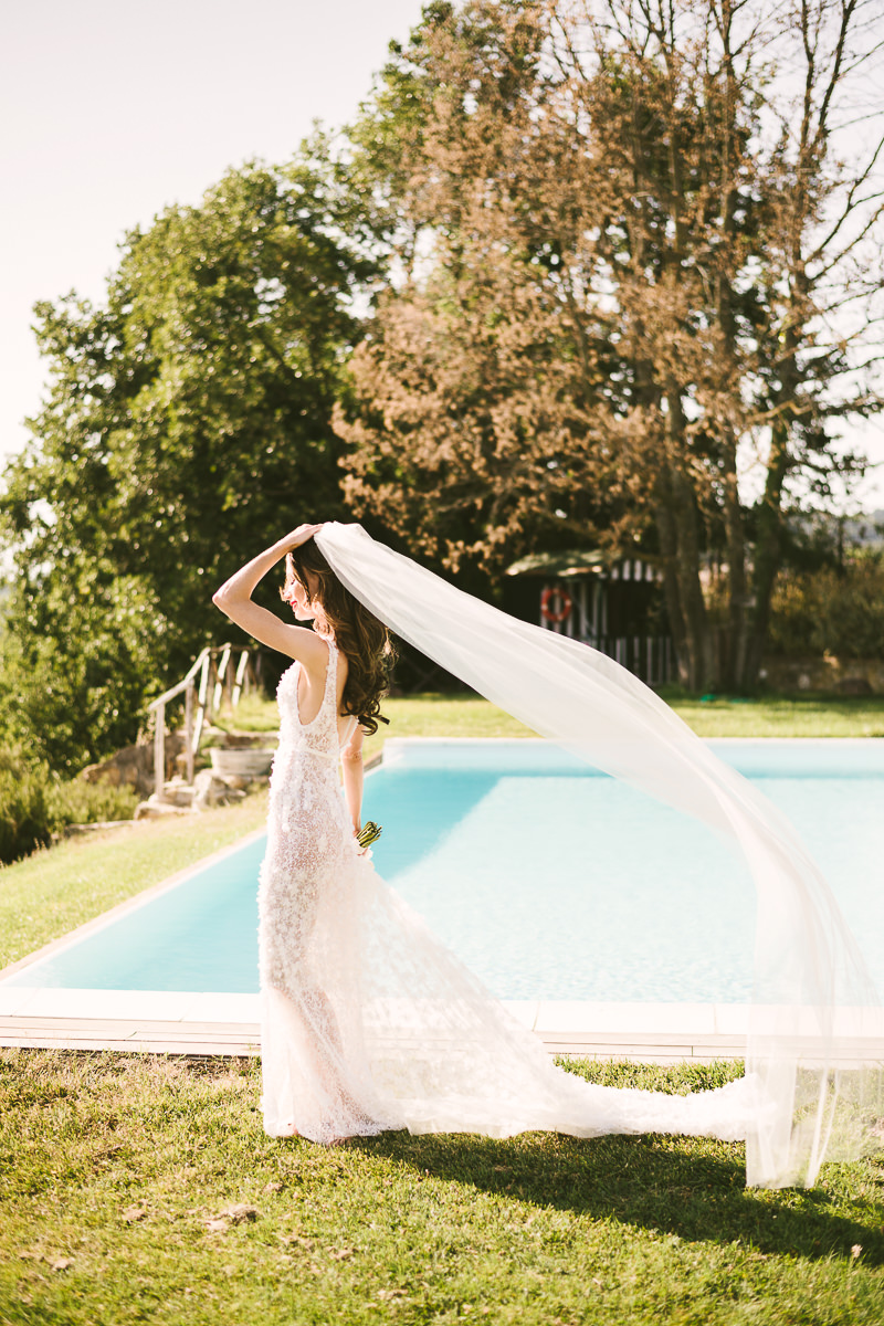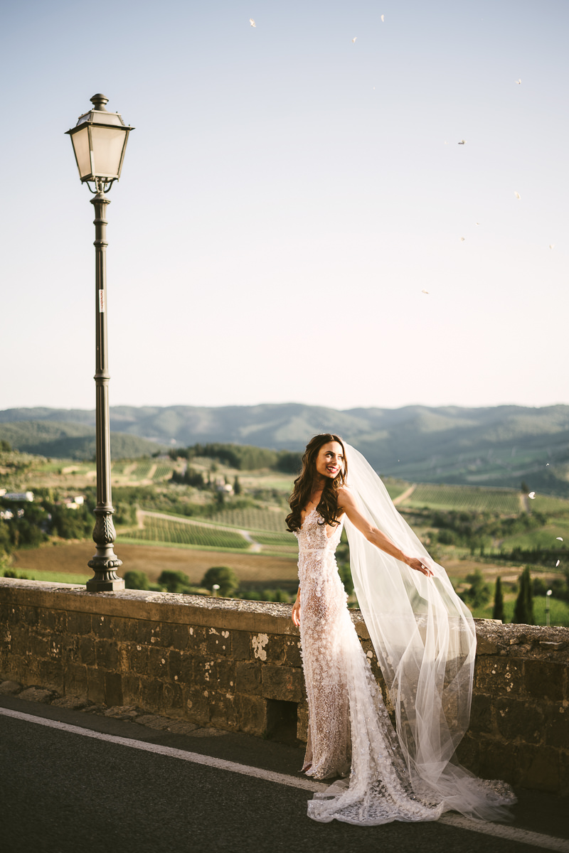 After it, the newlyweds and all their guests enjoyed a cheerful cocktail hour and had fun during the photo shoot. There’s an incredible vineyard in the farmhouse surroundings, where the golden hour light of sunset meets the green of the trees gifting the bride and groom with the best possible setting for their Tuscan wedding photos.