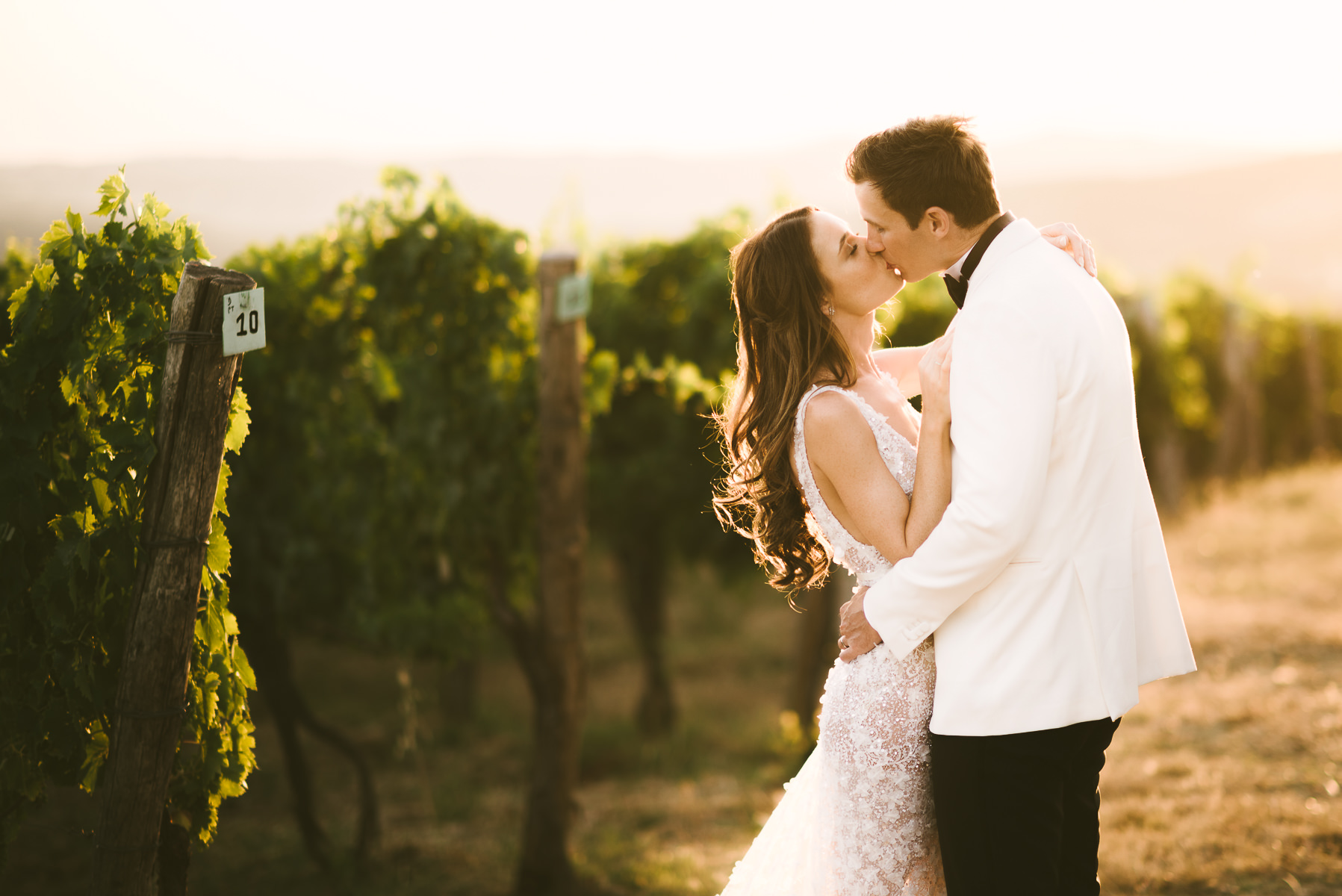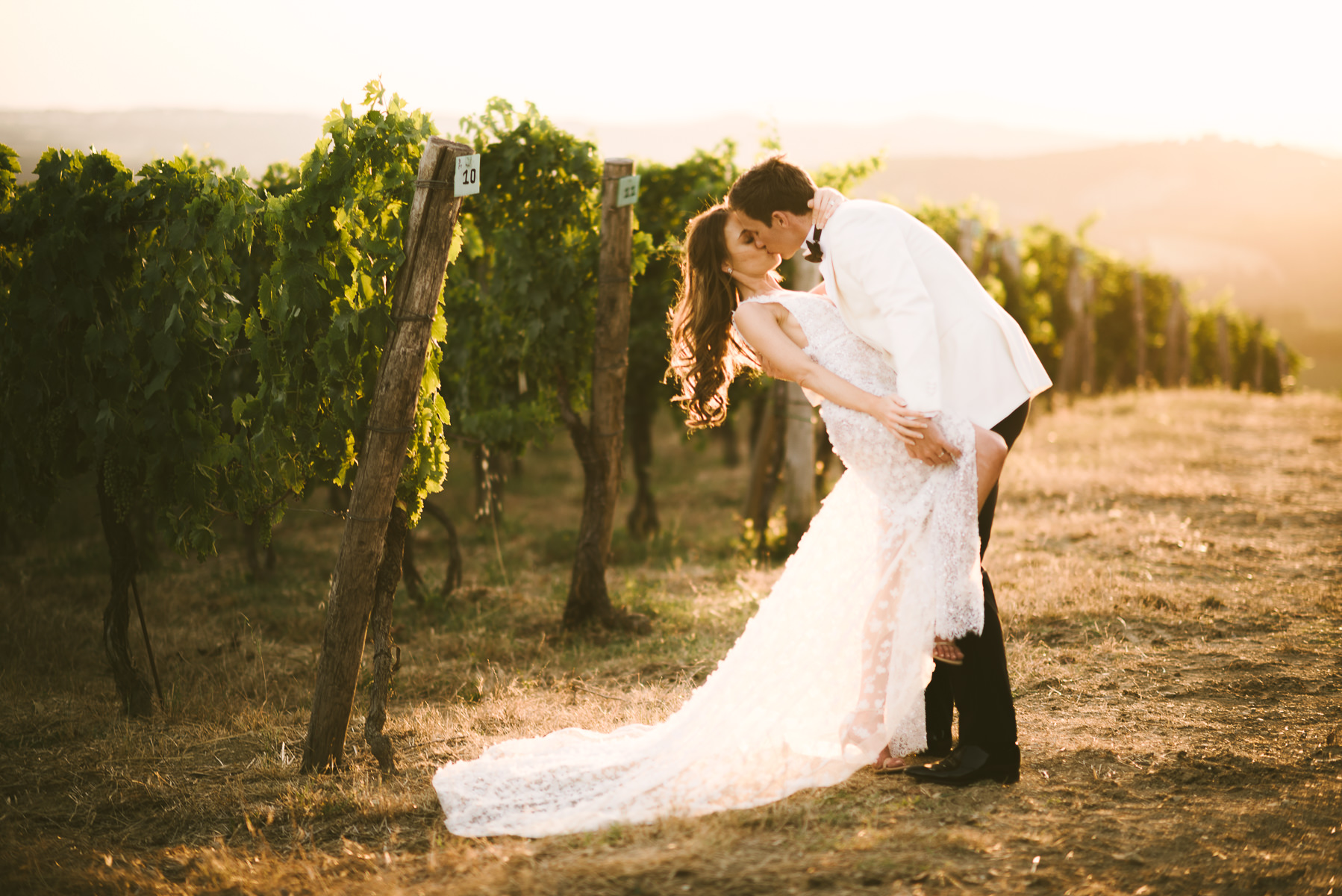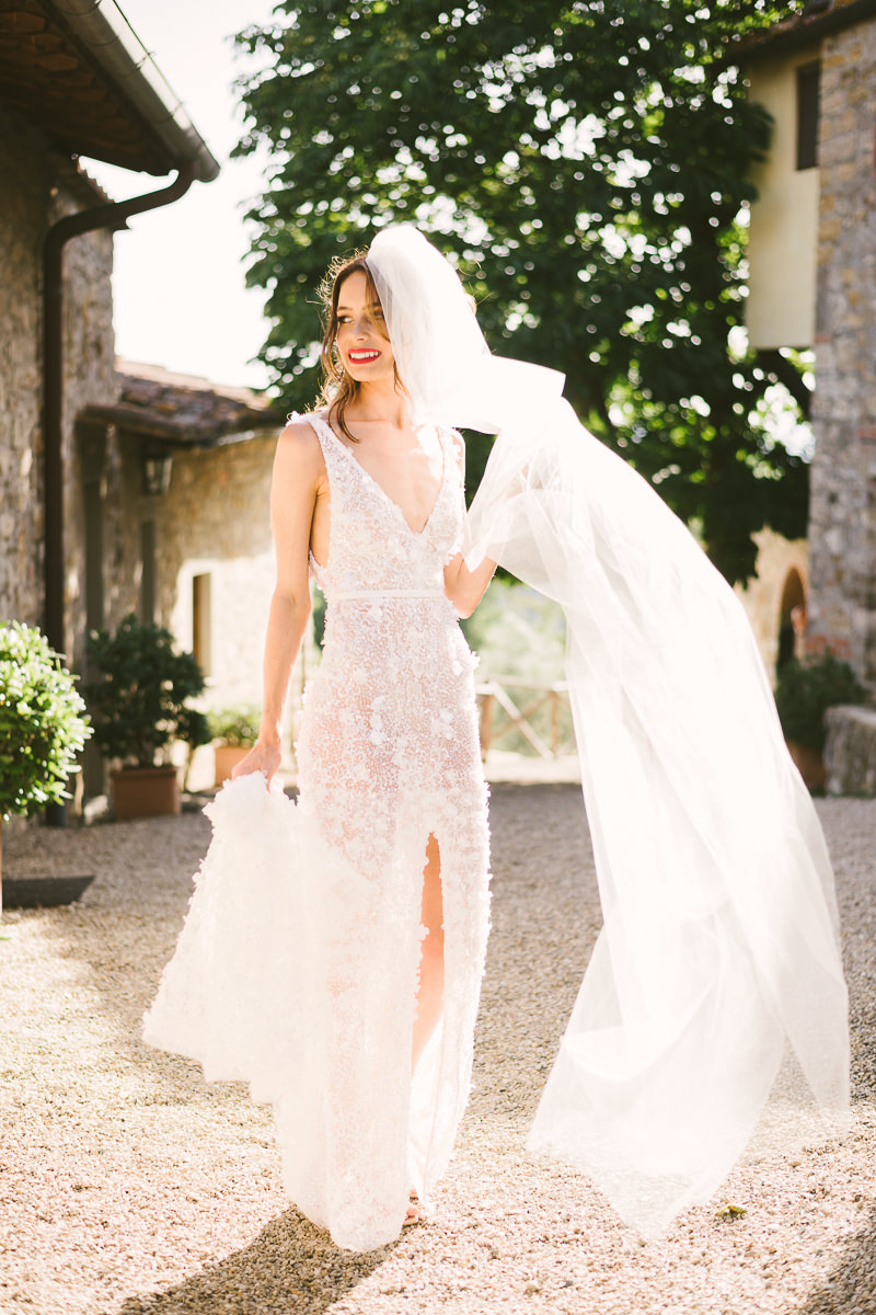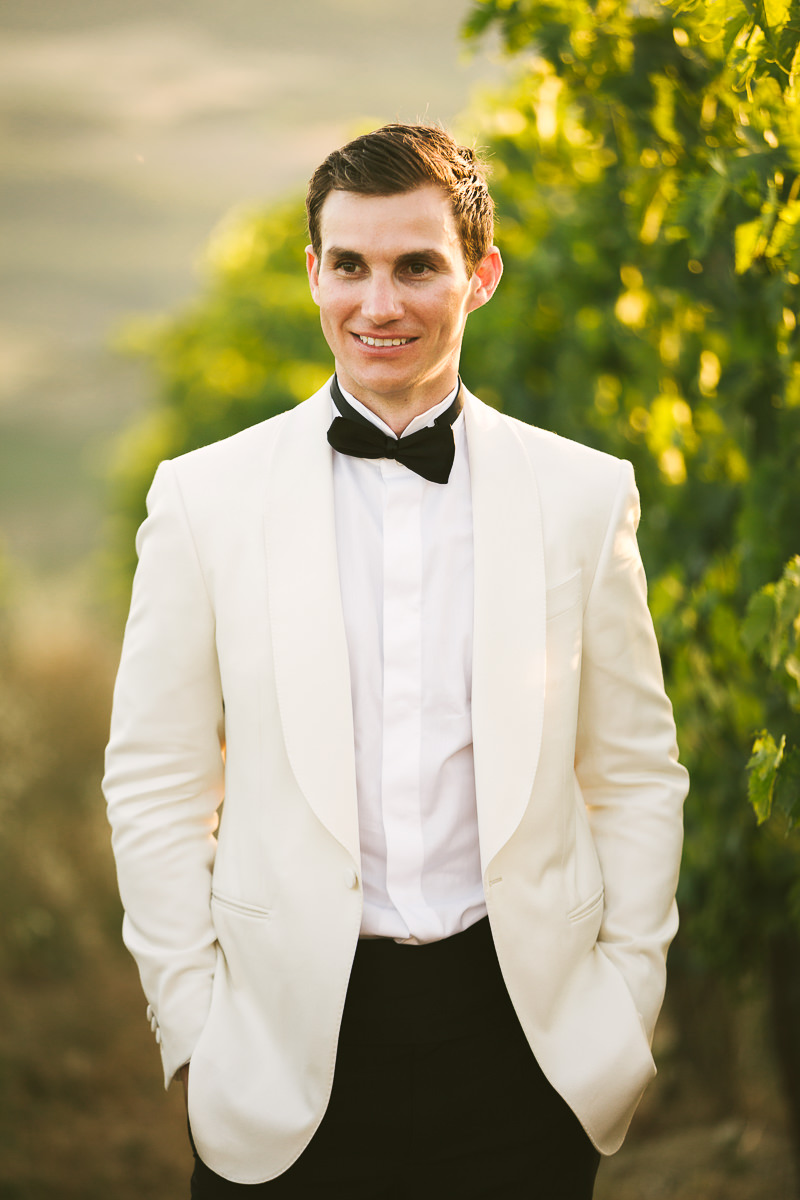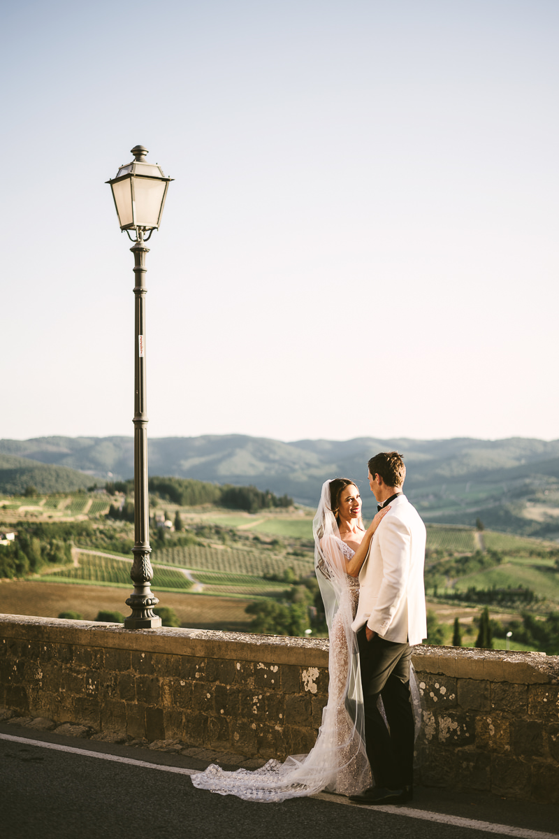 After it, the newlyweds and all their guests enjoyed a cheerful cocktail hour and had fun during the photo shoot. There’s an incredible vineyard in the farmhouse surroundings, where the golden hour light of sunset meets the green of the trees gifting the bride and groom with the best possible setting for their Tuscan wedding photos.