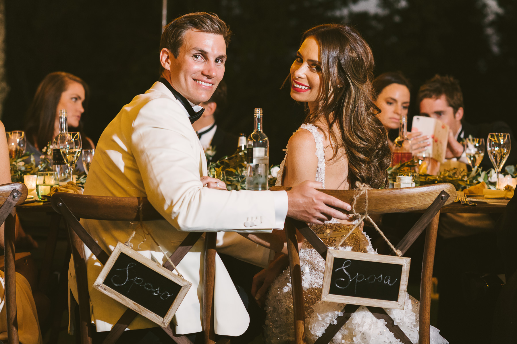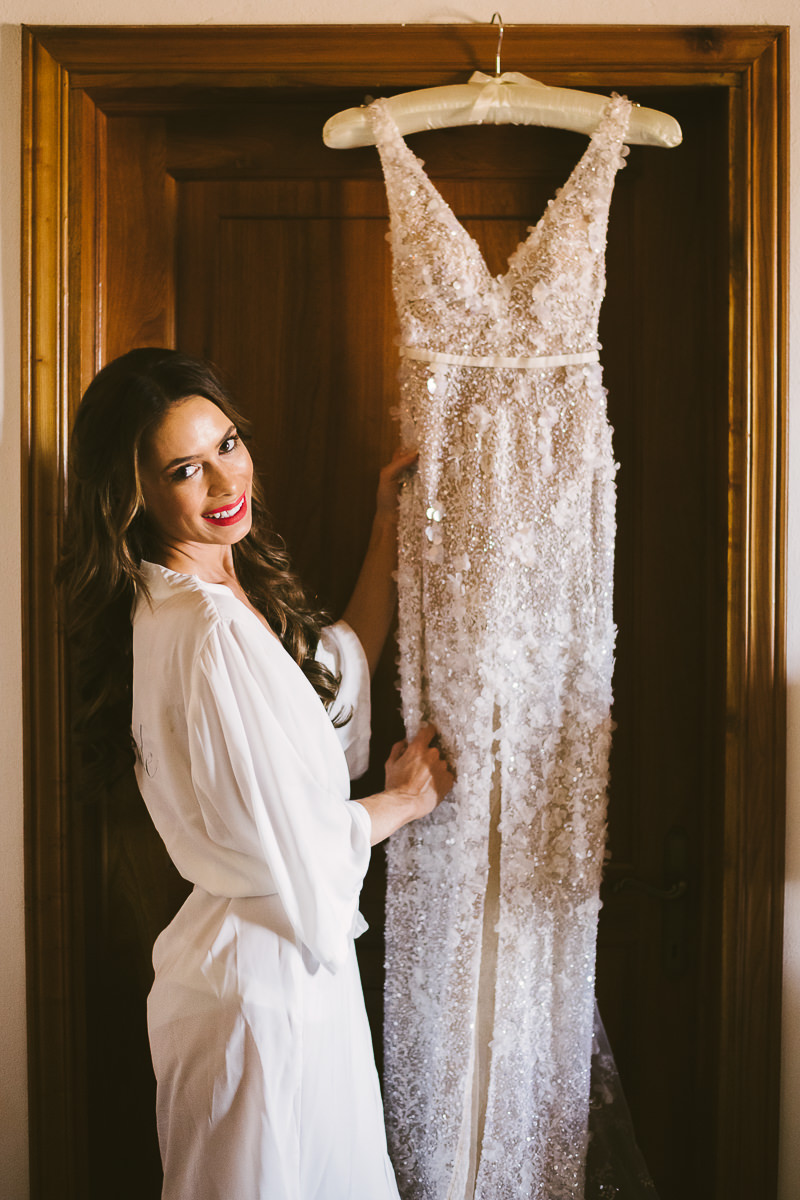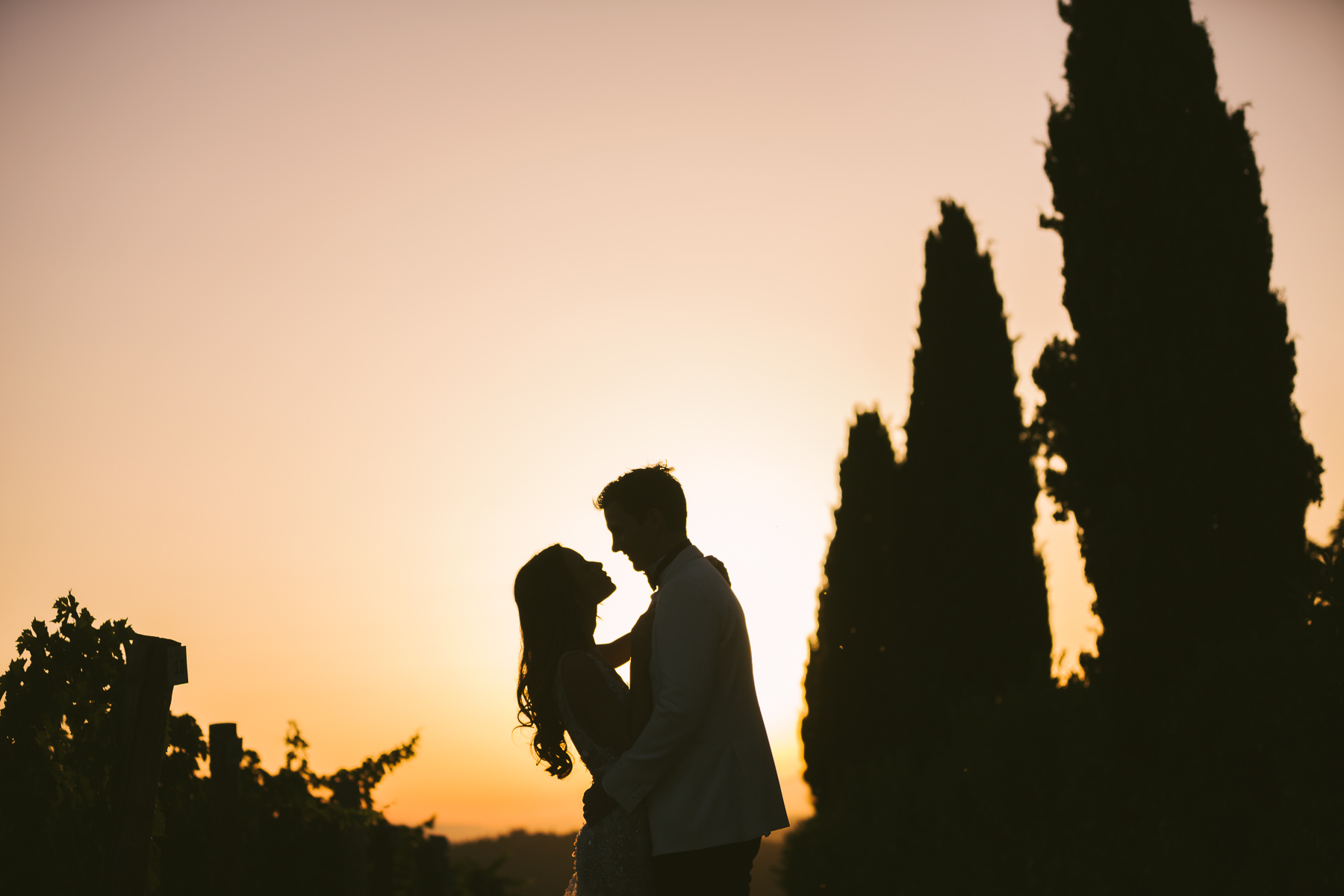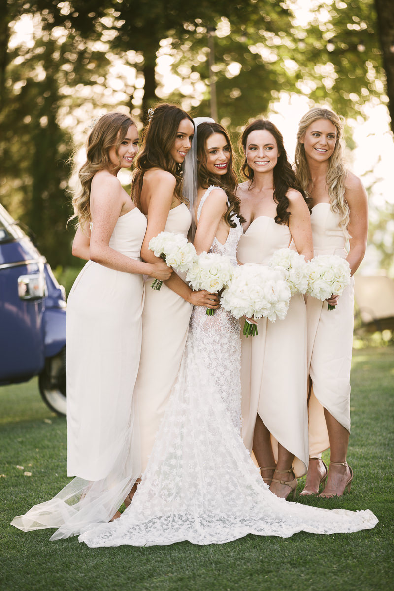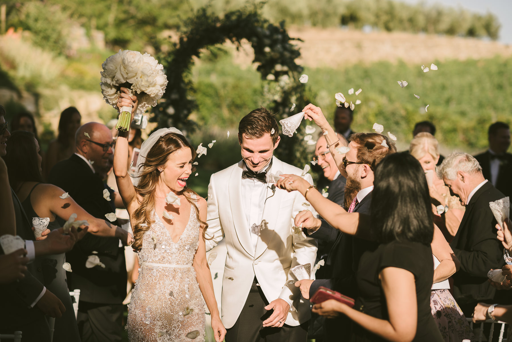 After it, the newlyweds and all their guests enjoyed a cheerful cocktail hour and had fun during the photo shoot. There’s an incredible vineyard in the farmhouse surroundings, where the golden hour light of sunset meets the green of the trees gifting the bride and groom with the best possible setting for their Tuscan wedding photos.