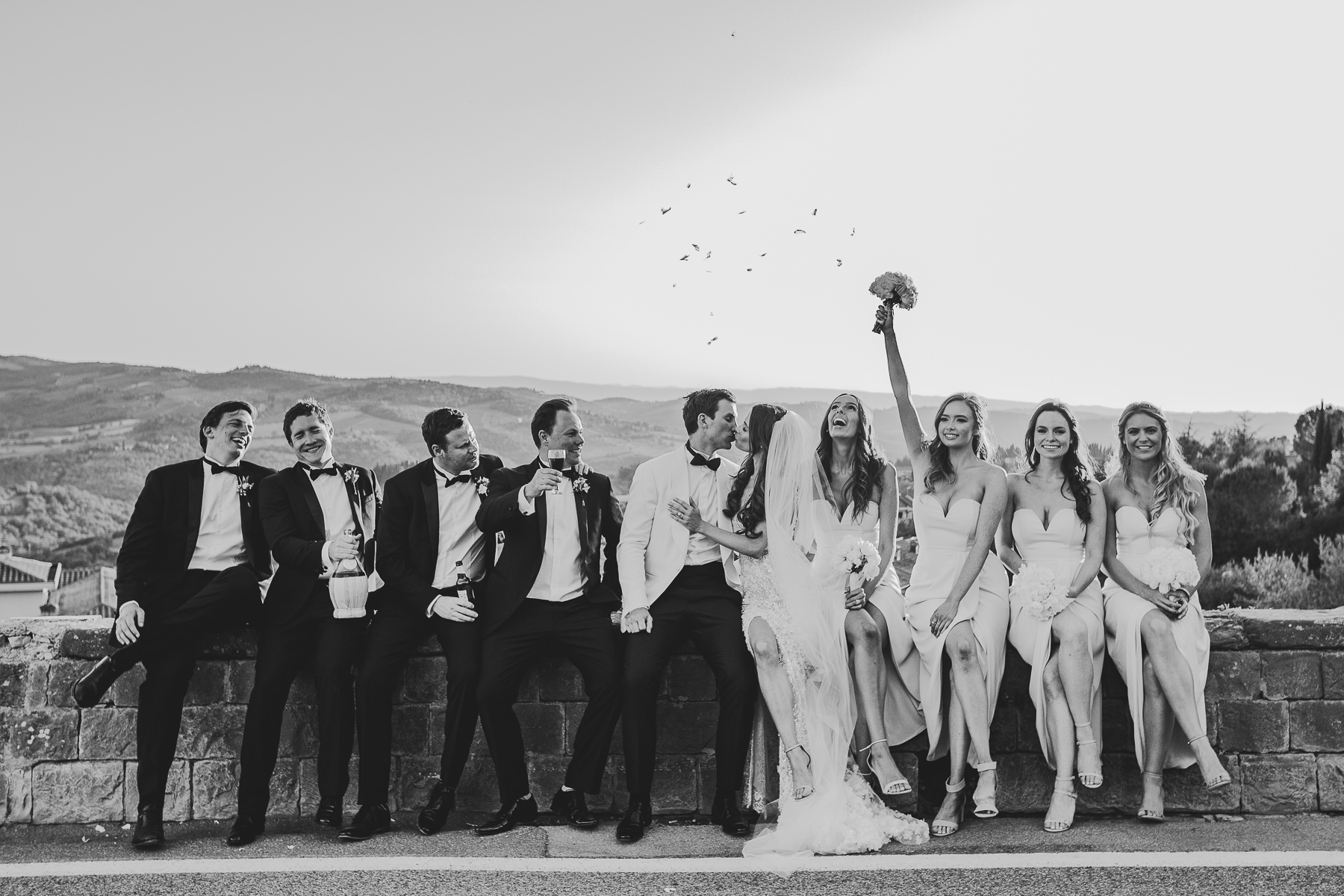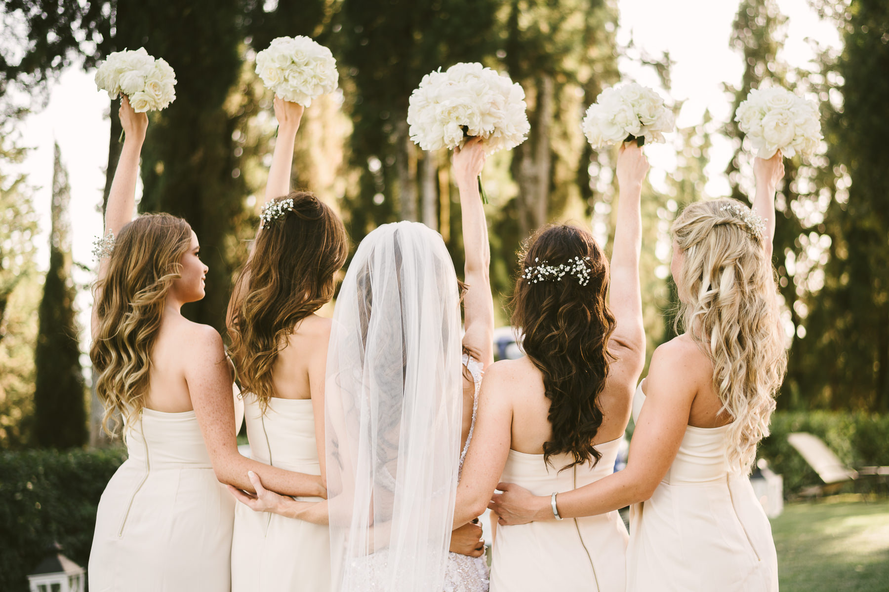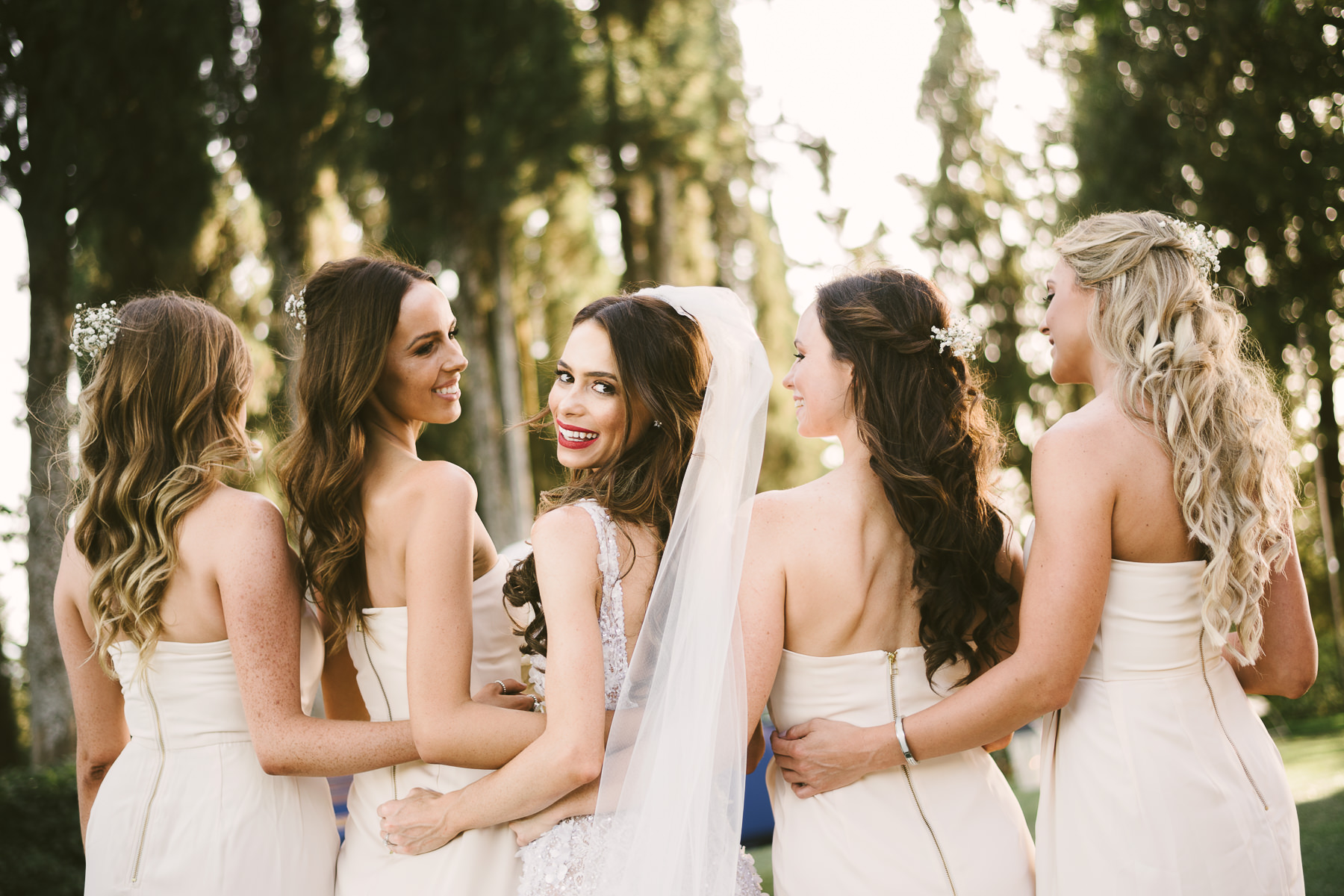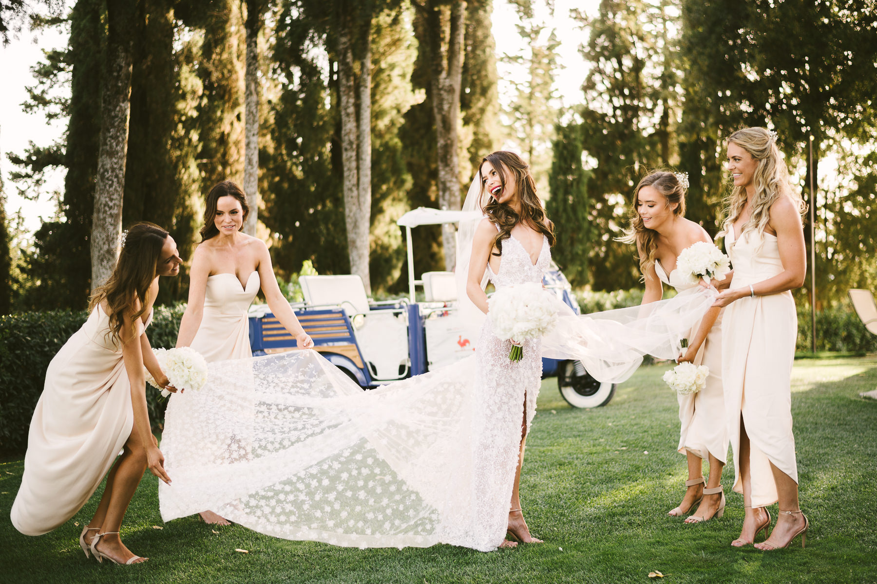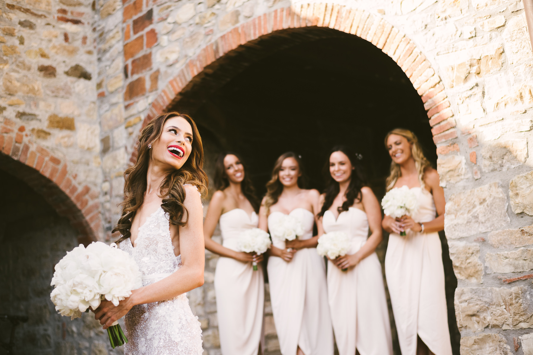 After it, the newlyweds and all their guests enjoyed a cheerful cocktail hour and had fun during the photo shoot. There’s an incredible vineyard in the farmhouse surroundings, where the golden hour light of sunset meets the green of the trees gifting the bride and groom with the best possible setting for their Tuscan wedding photos.