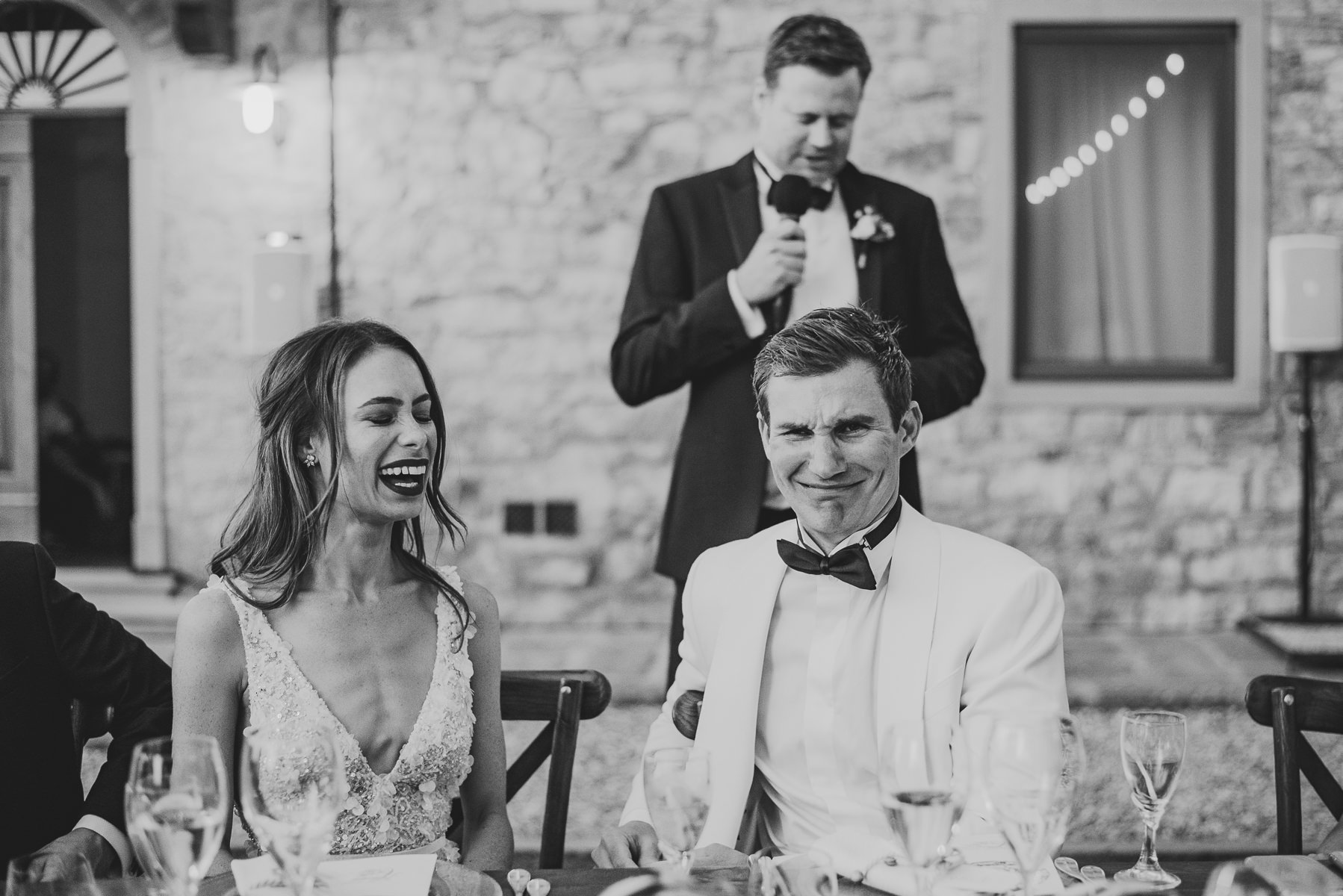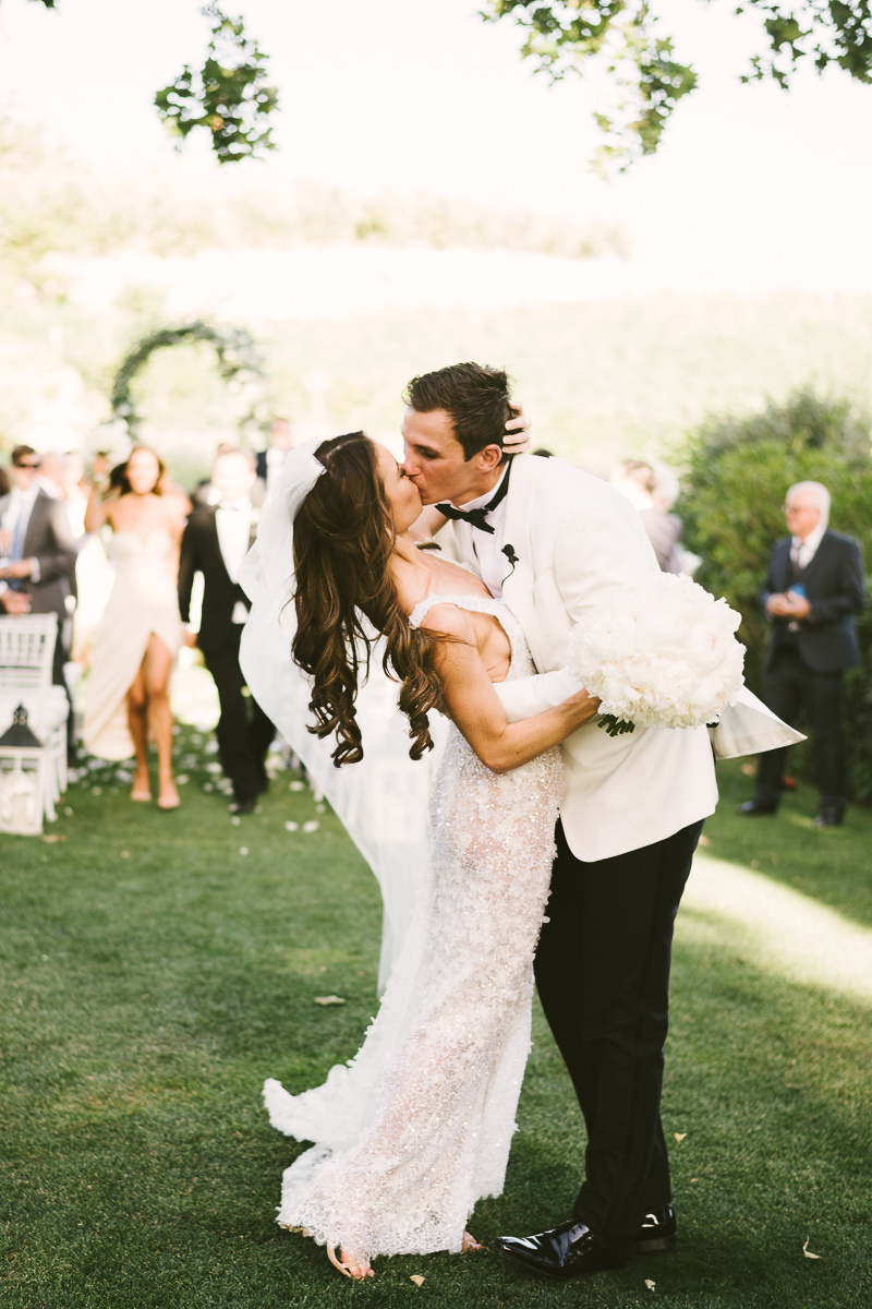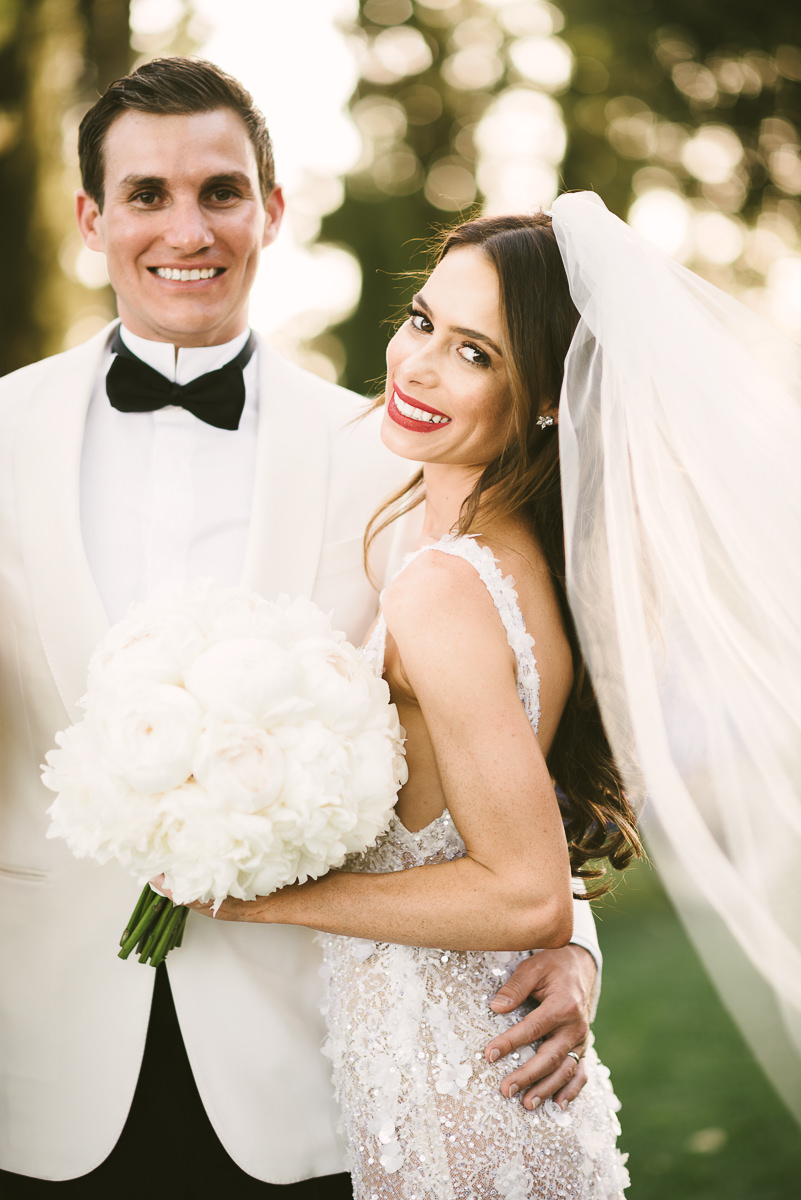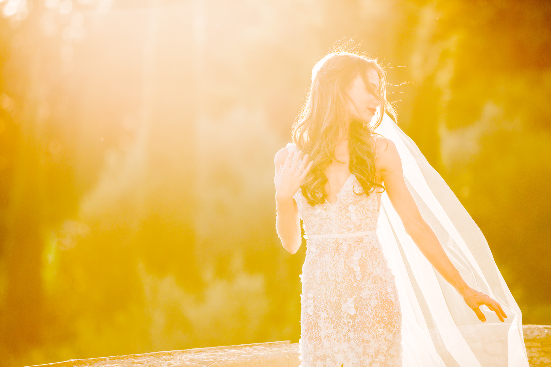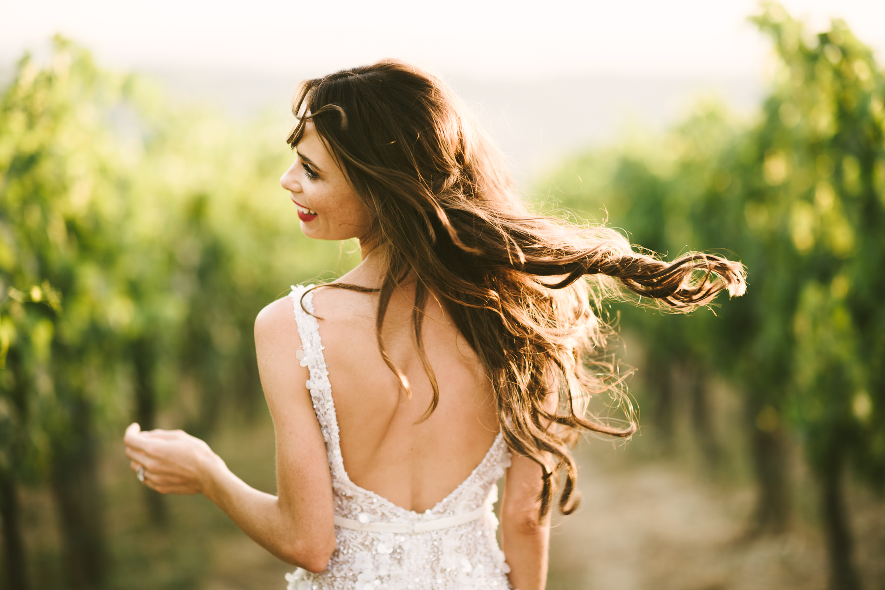 After it, the newlyweds and all their guests enjoyed a cheerful cocktail hour and had fun during the photo shoot. There’s an incredible vineyard in the farmhouse surroundings, where the golden hour light of sunset meets the green of the trees gifting the bride and groom with the best possible setting for their Tuscan wedding photos.