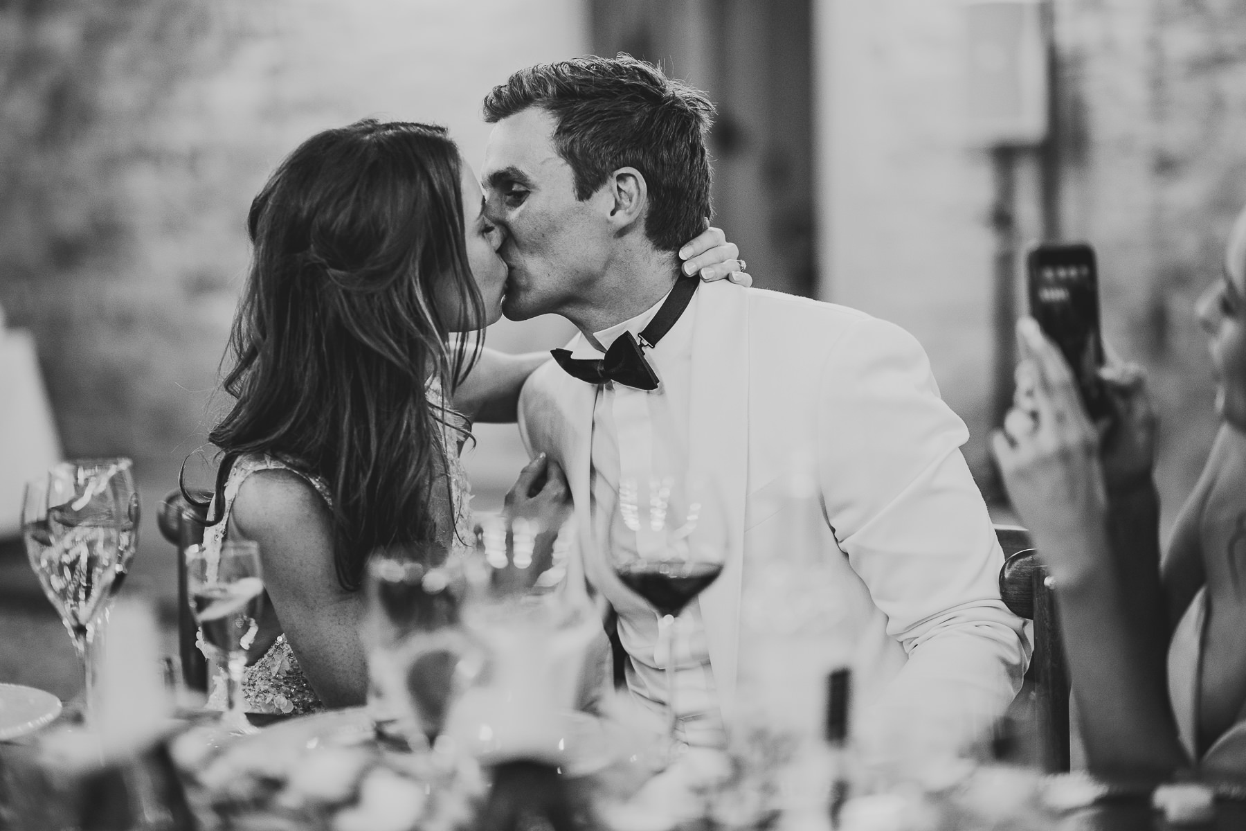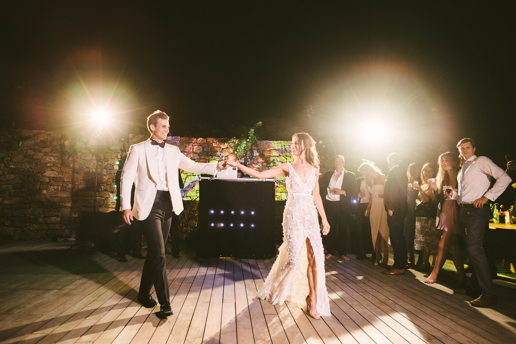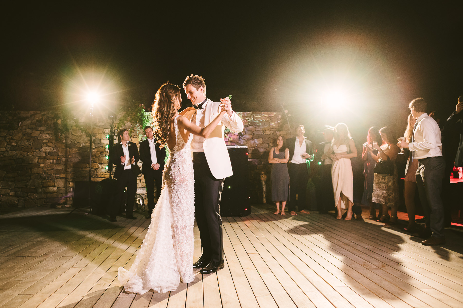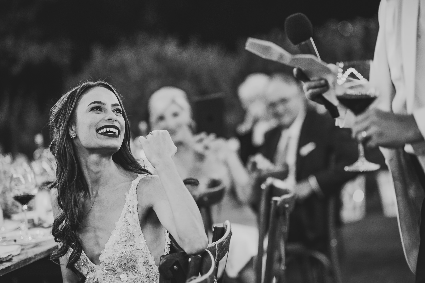 After it, the newlyweds and all their guests enjoyed a cheerful cocktail hour and had fun during the photo shoot. There’s an incredible vineyard in the farmhouse surroundings, where the golden hour light of sunset meets the green of the trees gifting the bride and groom with the best possible setting for their Tuscan wedding photos.