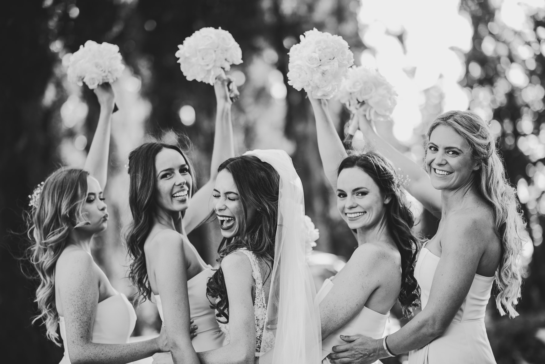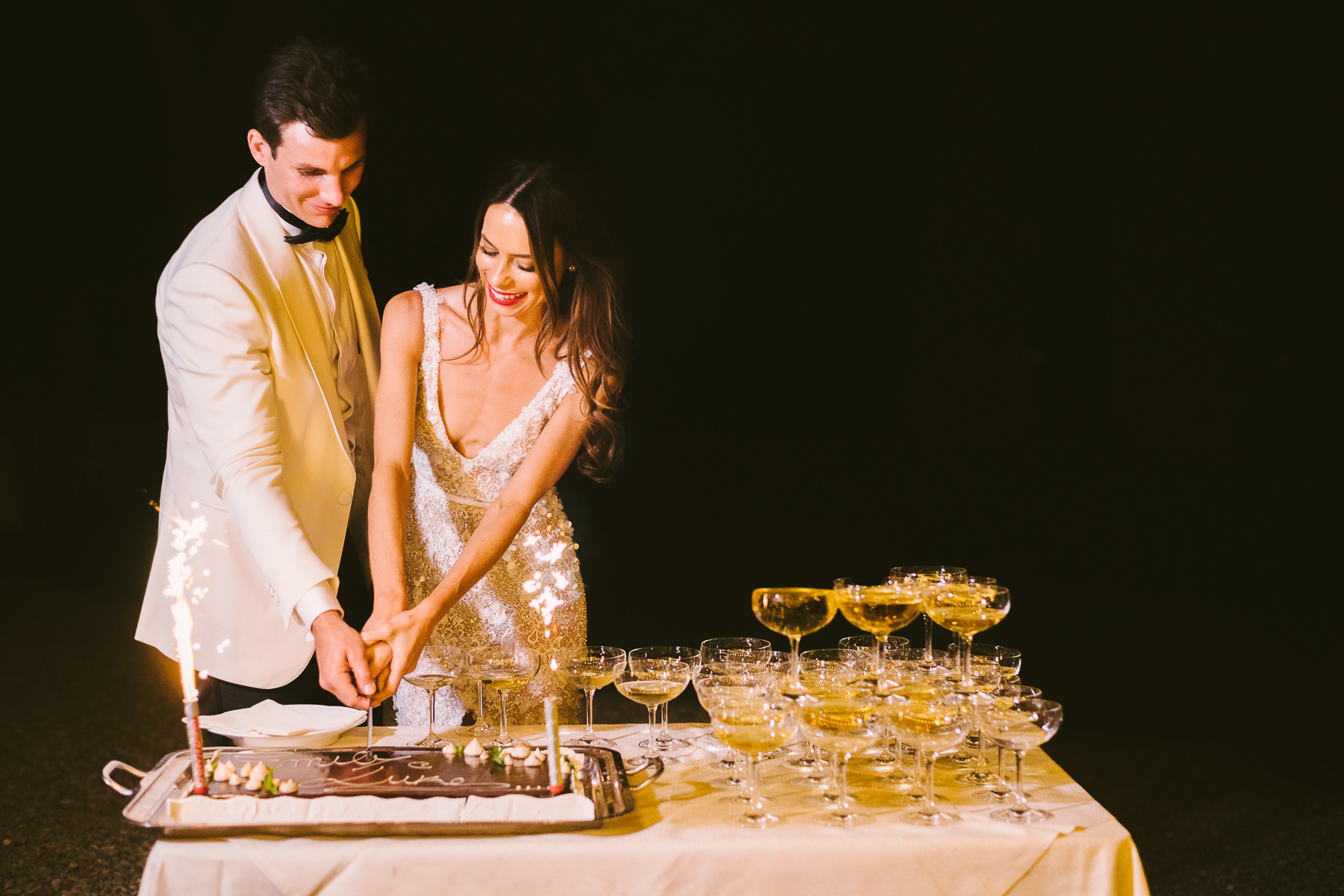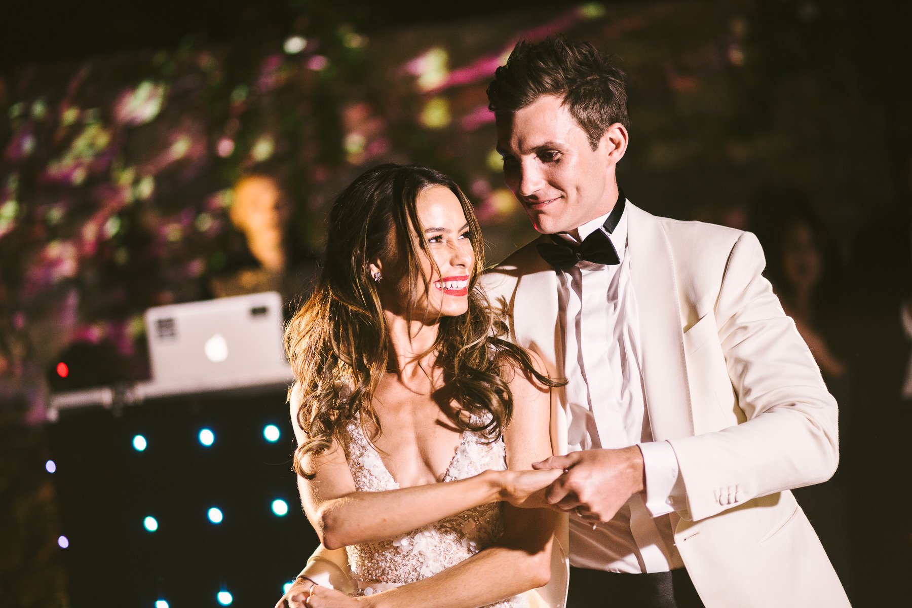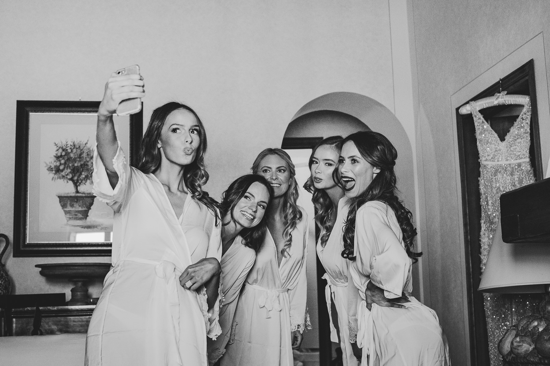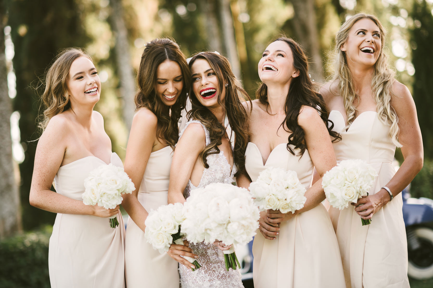 After it, the newlyweds and all their guests enjoyed a cheerful cocktail hour and had fun during the photo shoot. There’s an incredible vineyard in the farmhouse surroundings, where the golden hour light of sunset meets the green of the trees gifting the bride and groom with the best possible setting for their Tuscan wedding photos.