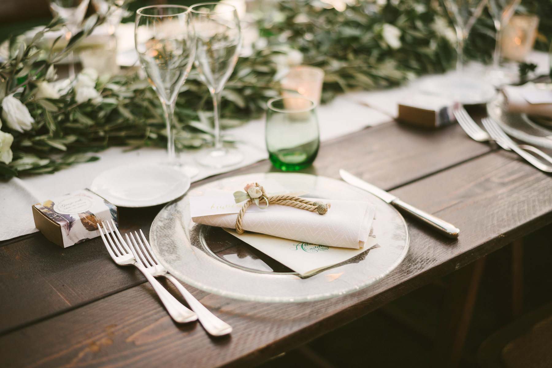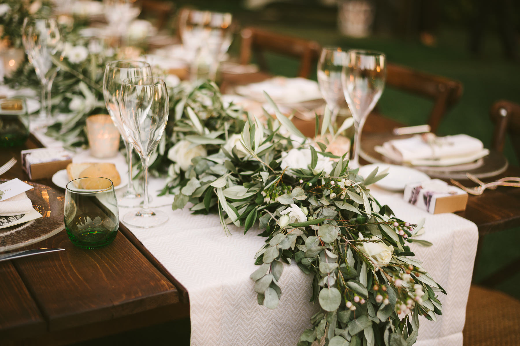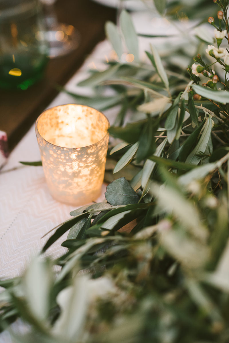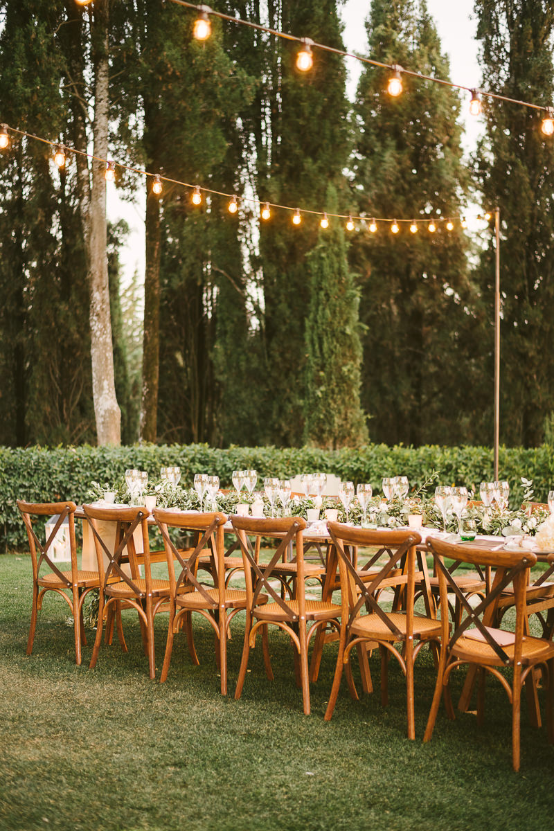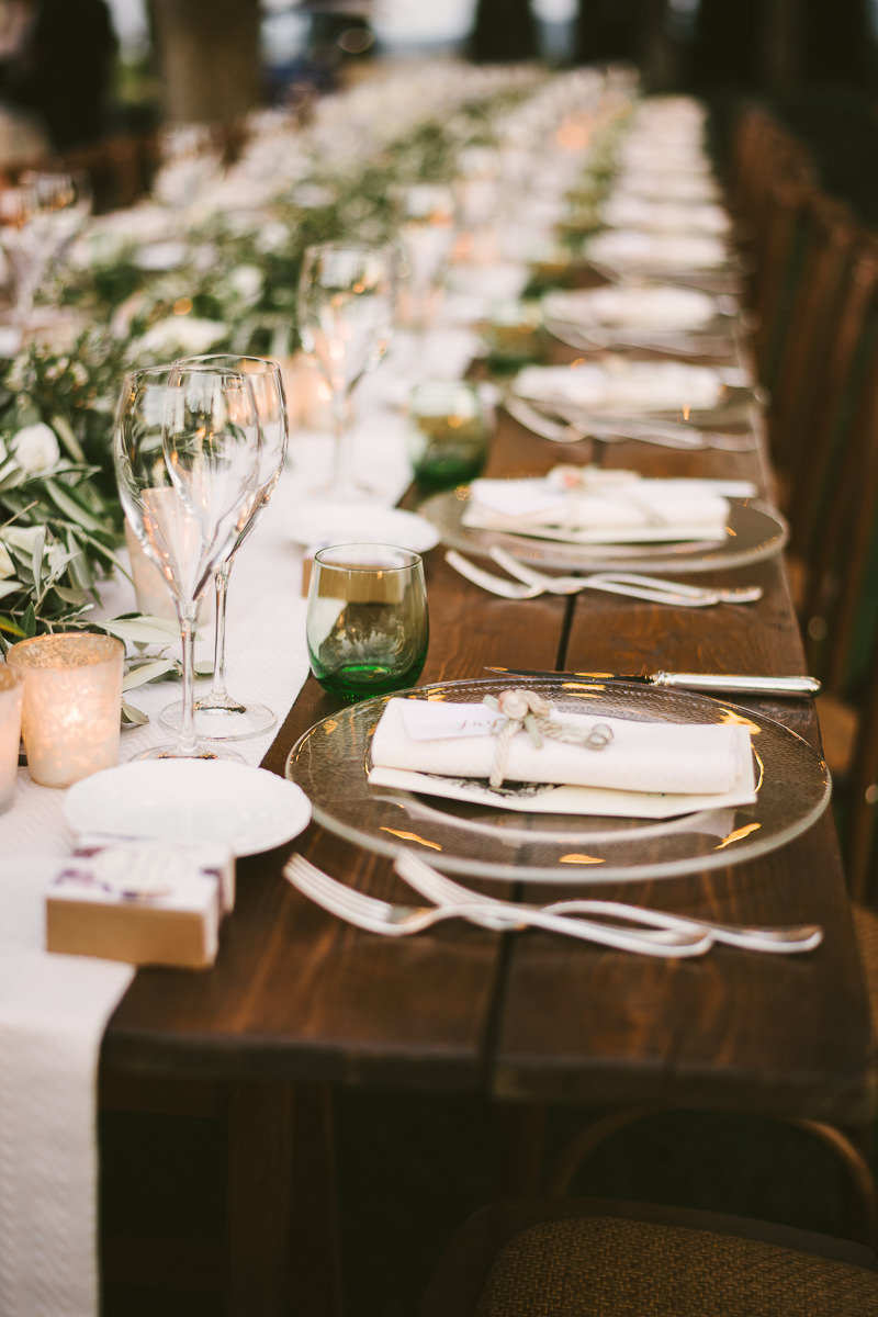 And what’s the perfect finishing touch to an exclusive wedding like Emily and Luke’s? Of course a delicious dinner on a country chic shared wooden table, adorned with touches of green and white, enlightened by the warmth of candles and by strings of lights that look like romantic fireflies.