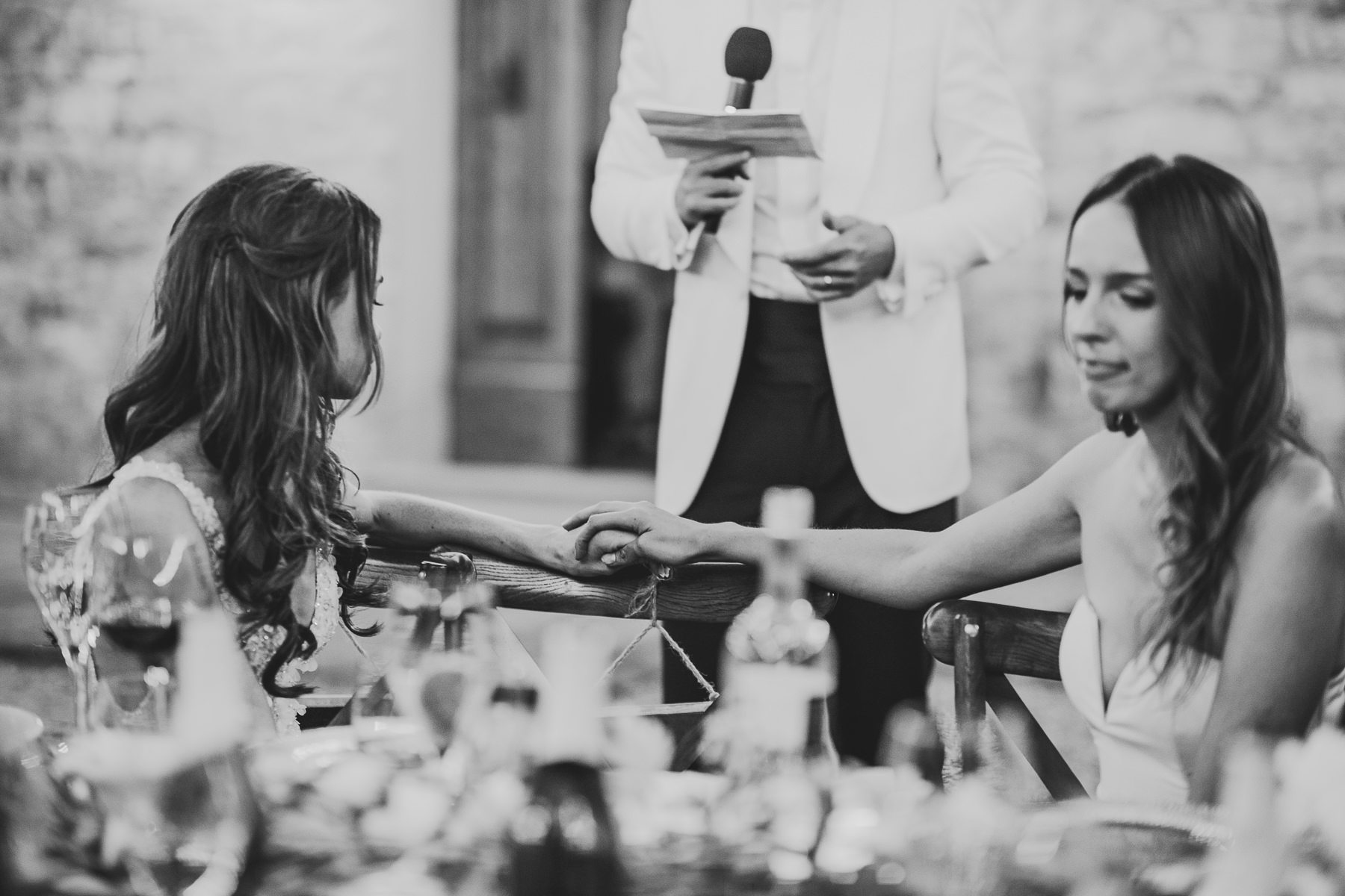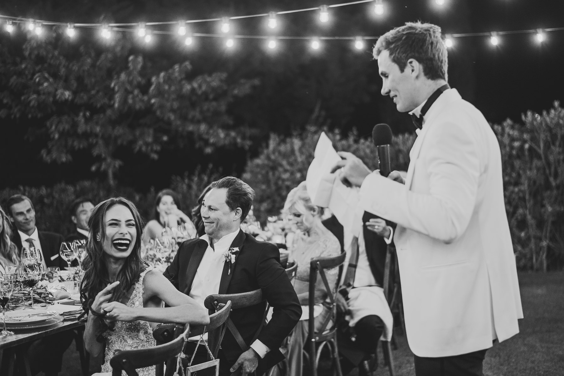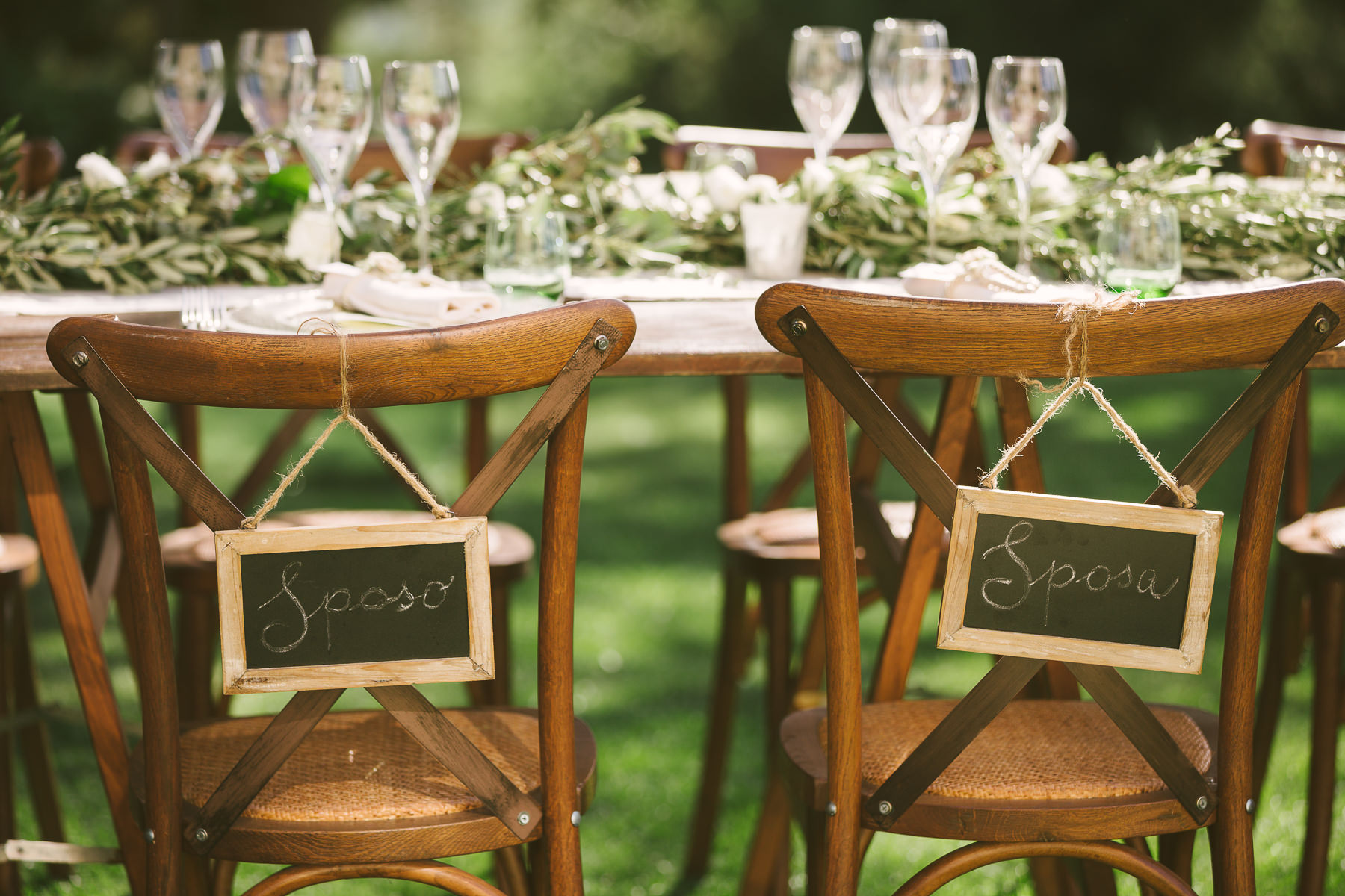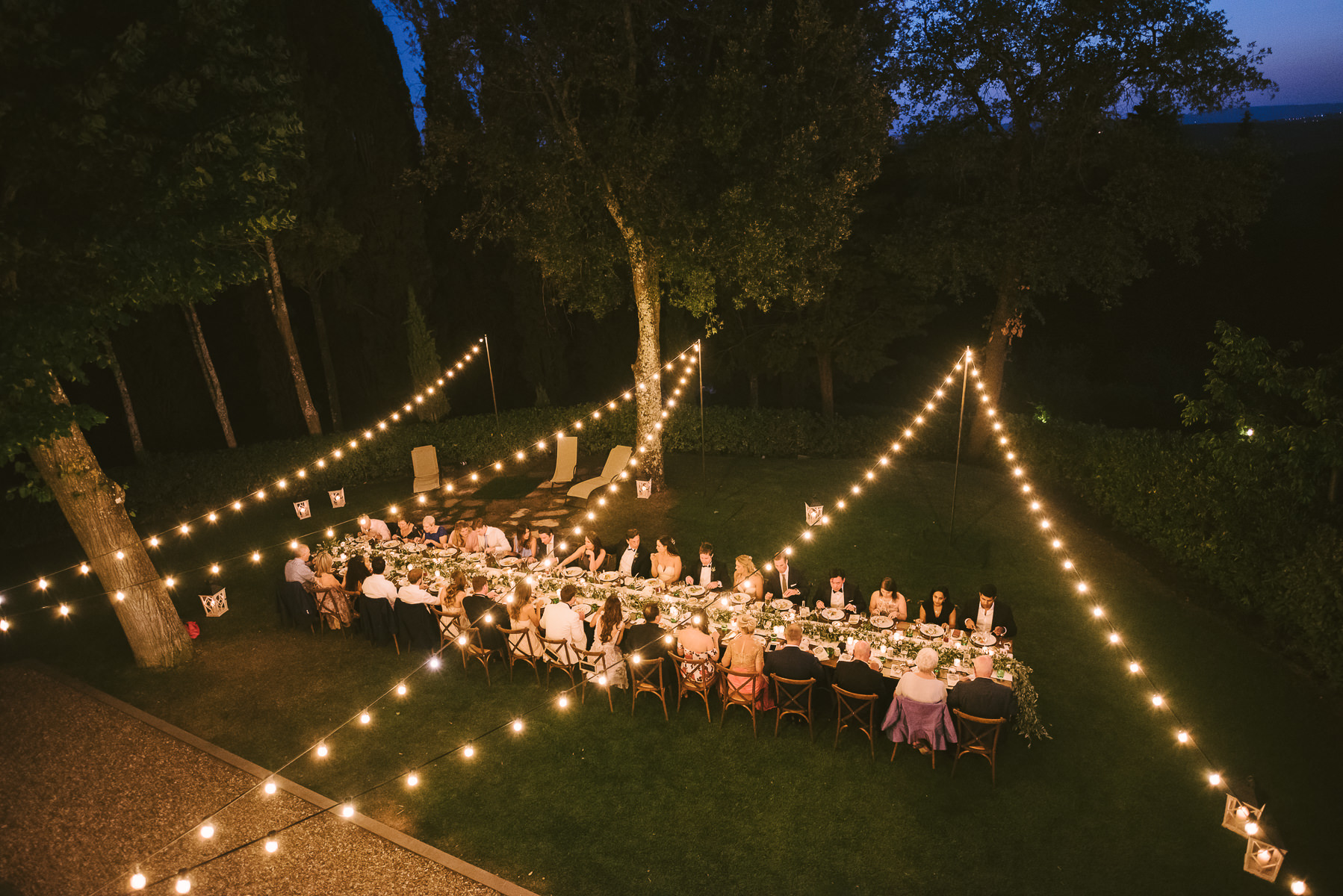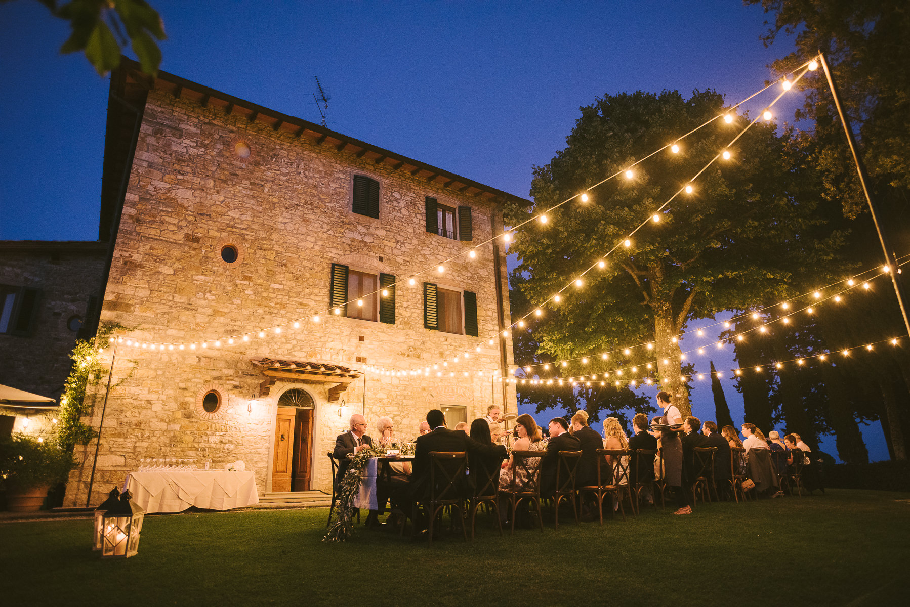 And what’s the perfect finishing touch to an exclusive wedding like Emily and Luke’s? Of course a delicious dinner on a country chic shared wooden table, adorned with touches of green and white, enlightened by the warmth of candles and by strings of lights that look like romantic fireflies.