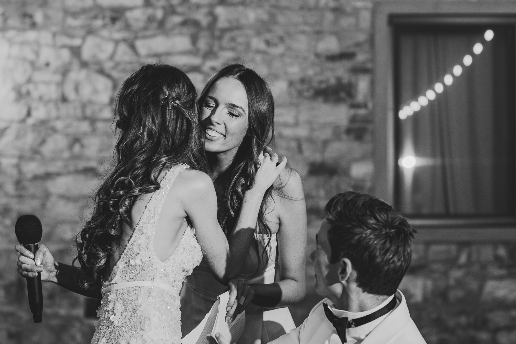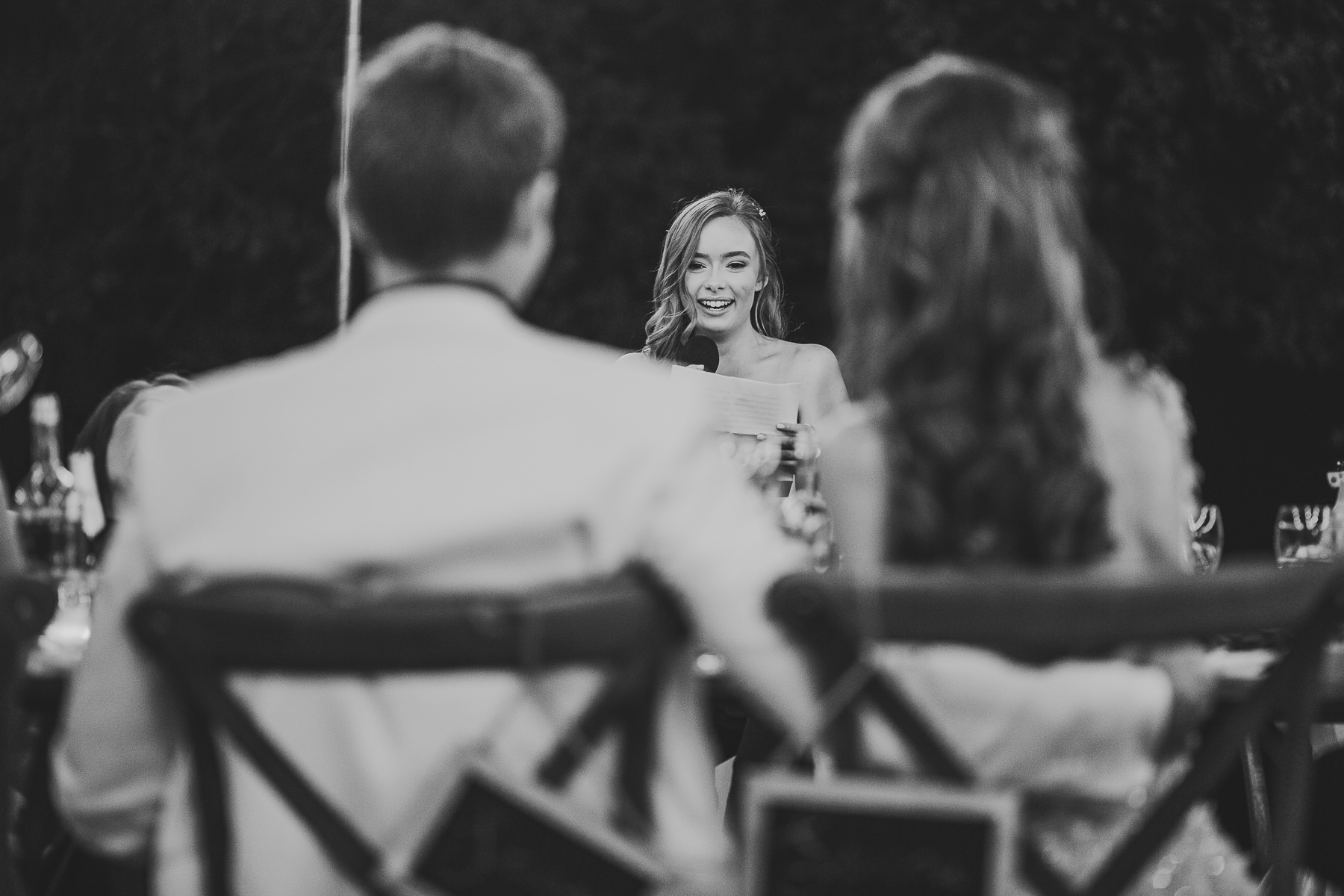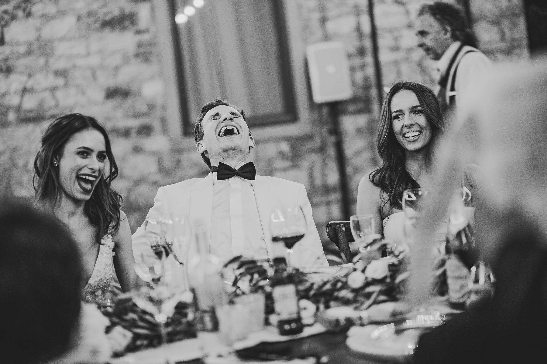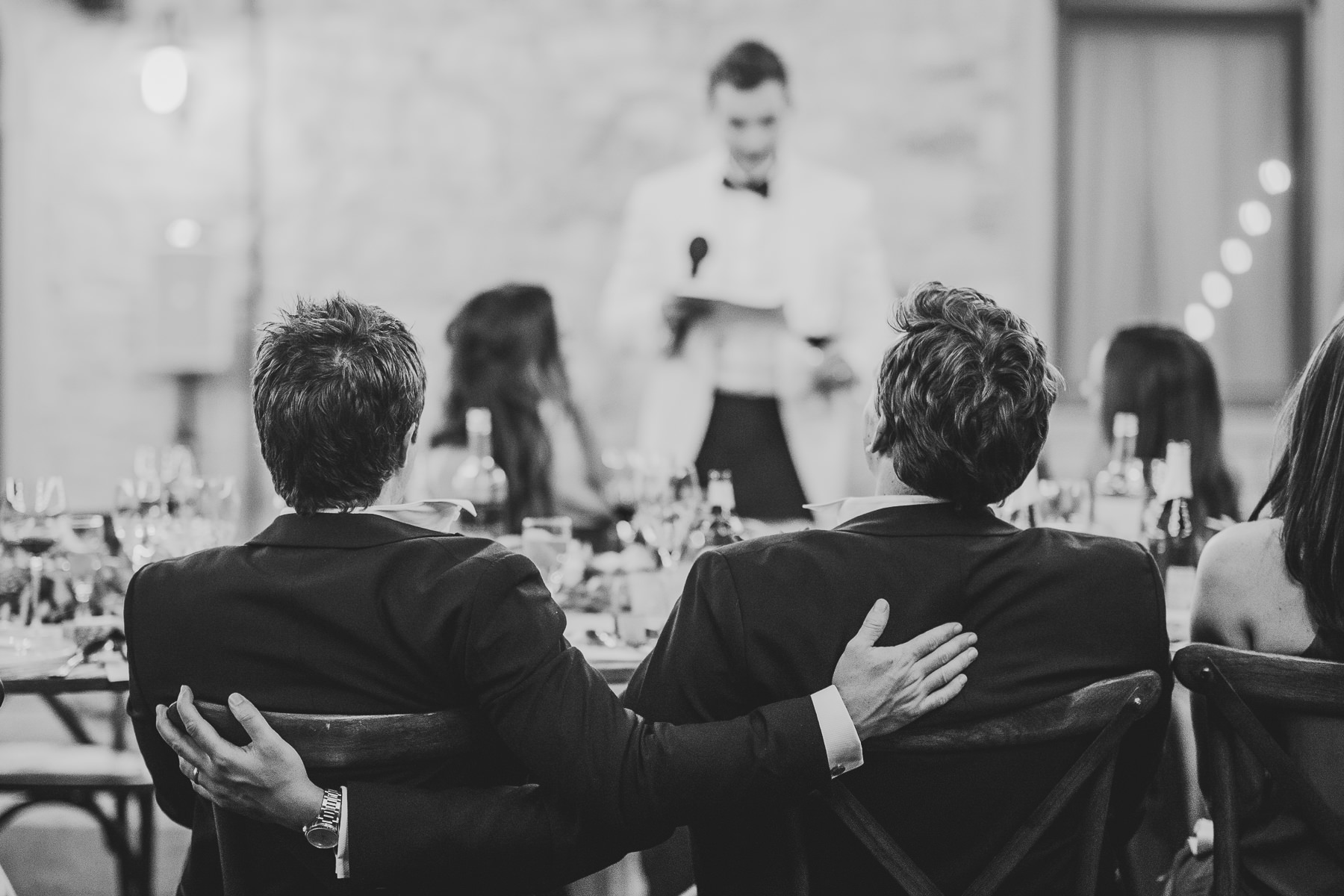 And what’s the perfect finishing touch to an exclusive wedding like Emily and Luke’s? Of course a delicious dinner on a country chic shared wooden table, adorned with touches of green and white, enlightened by the warmth of candles and by strings of lights that look like romantic fireflies.