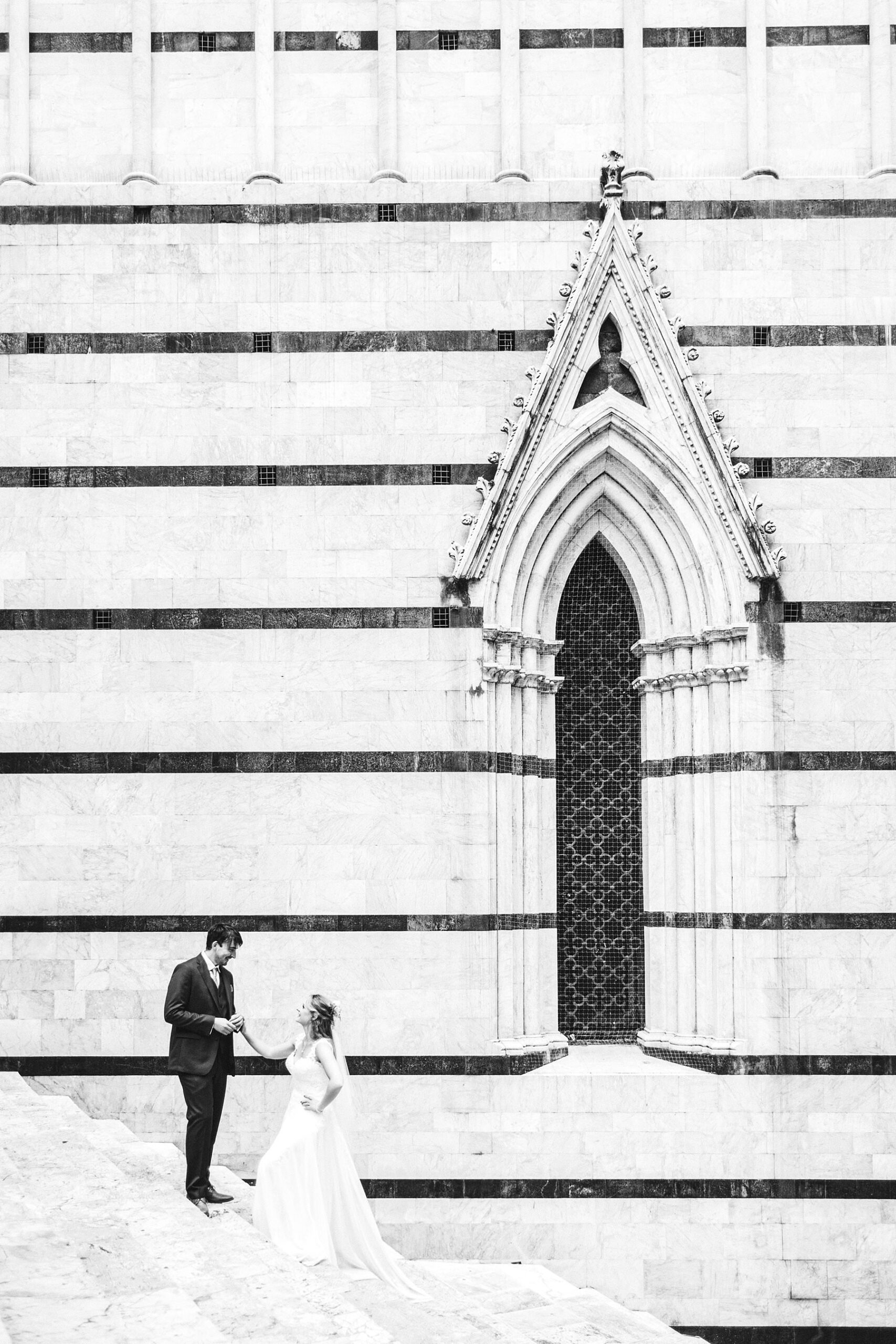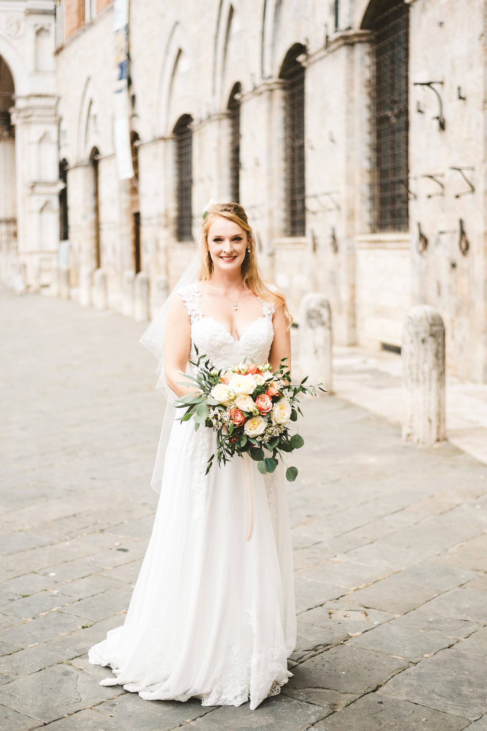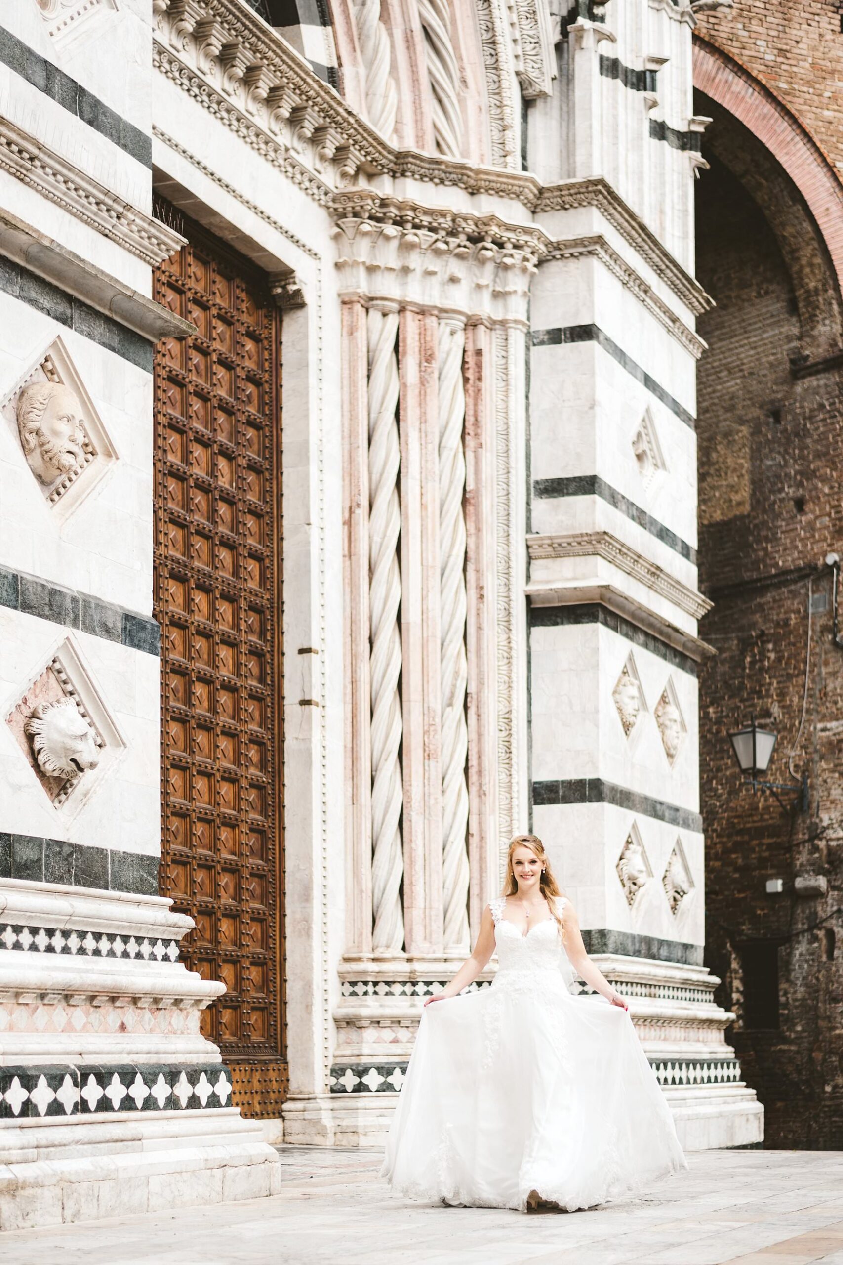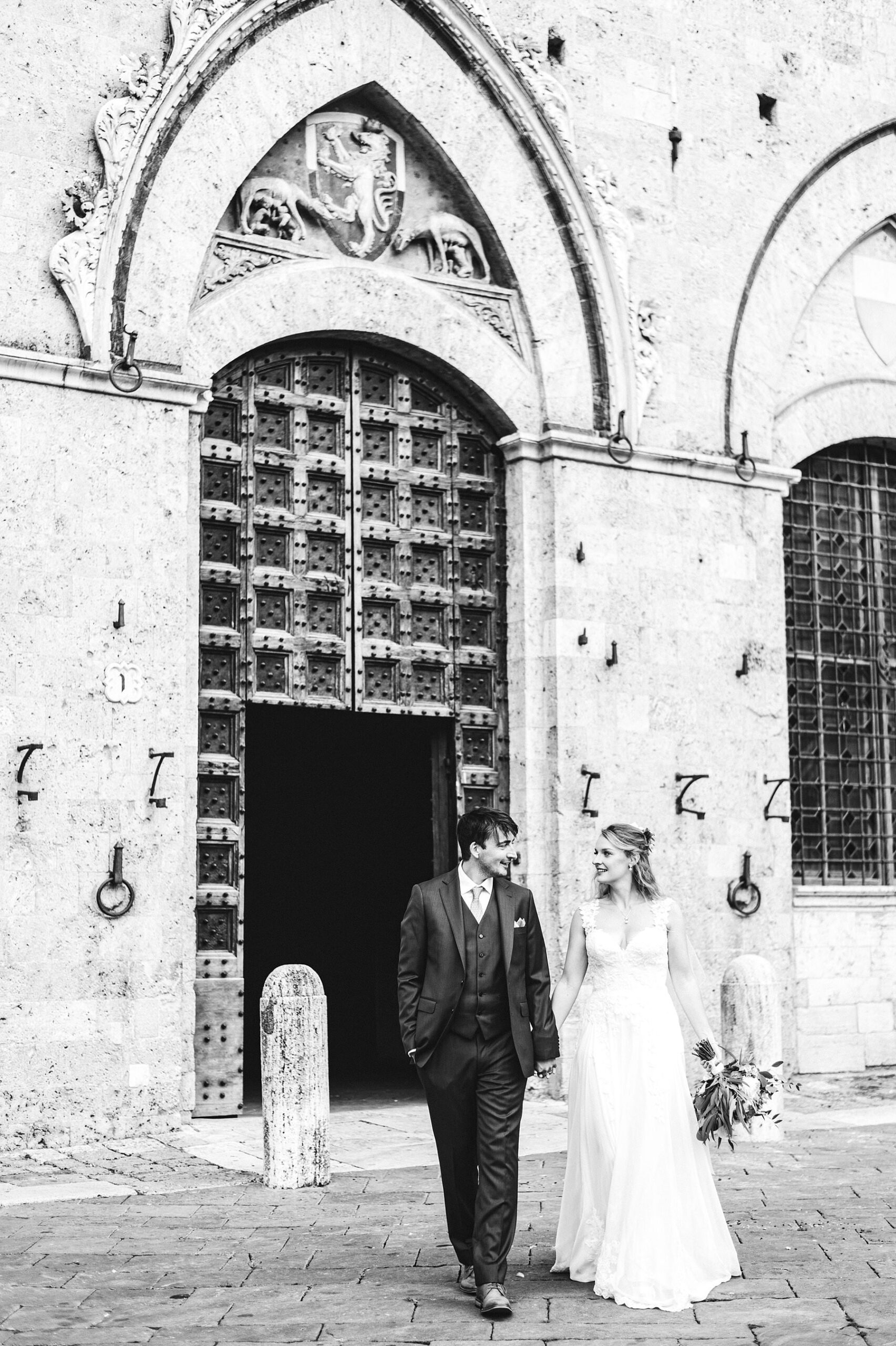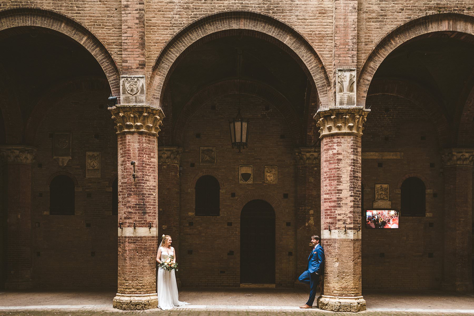 We started at Palazzo Coli Bizzarrini – a historic residence whose architecture and incredible frescoes take you back to the Renaissance – where the bride and groom got ready in two different rooms. Chris then reached the Town Hall and waited for Poppy in the Concistoro Hall – where I captured the emotional first look. After the ceremony, we took photos in all the most iconic places in Siena, including Piazza del Campo and the Duomo.