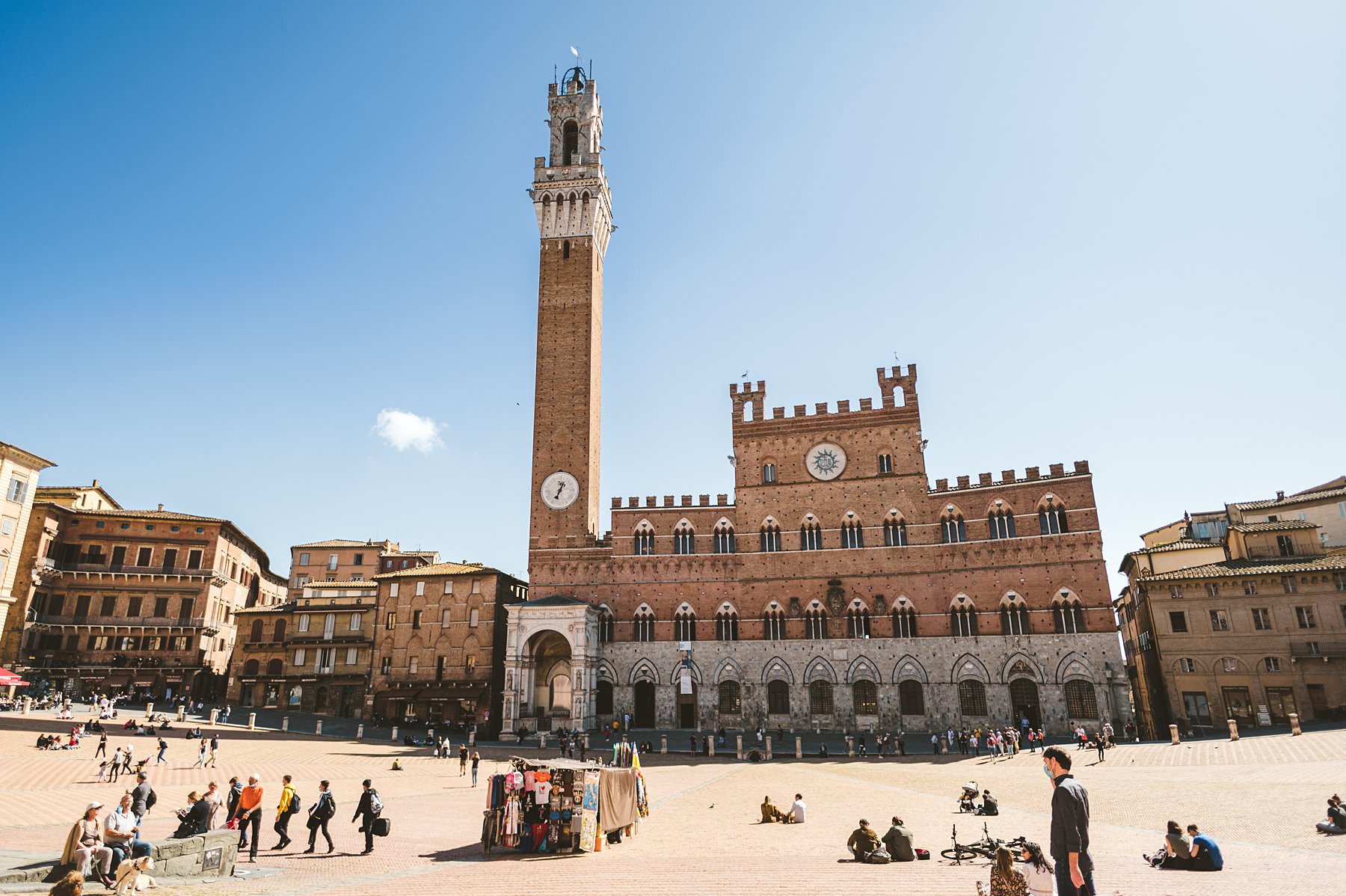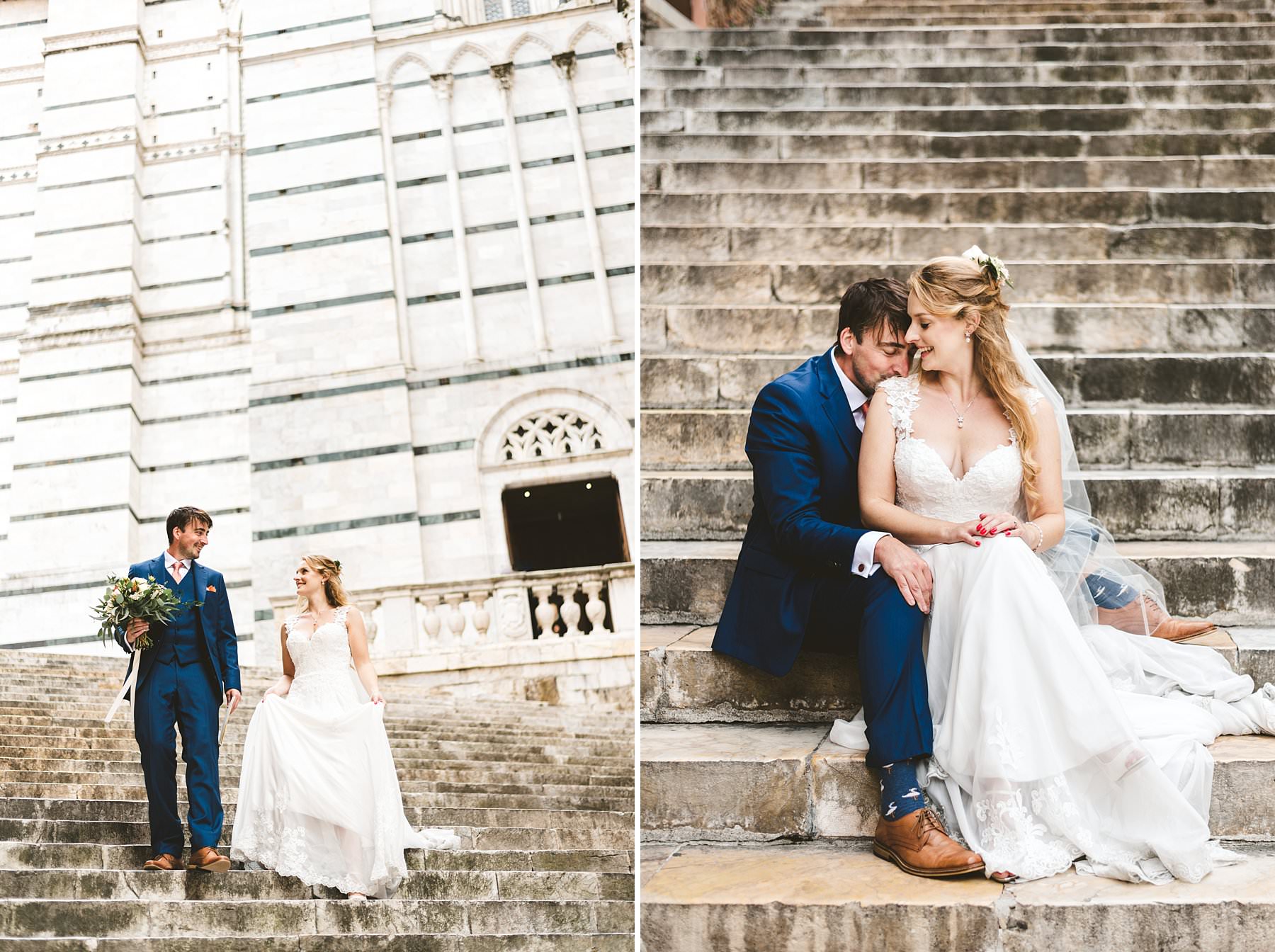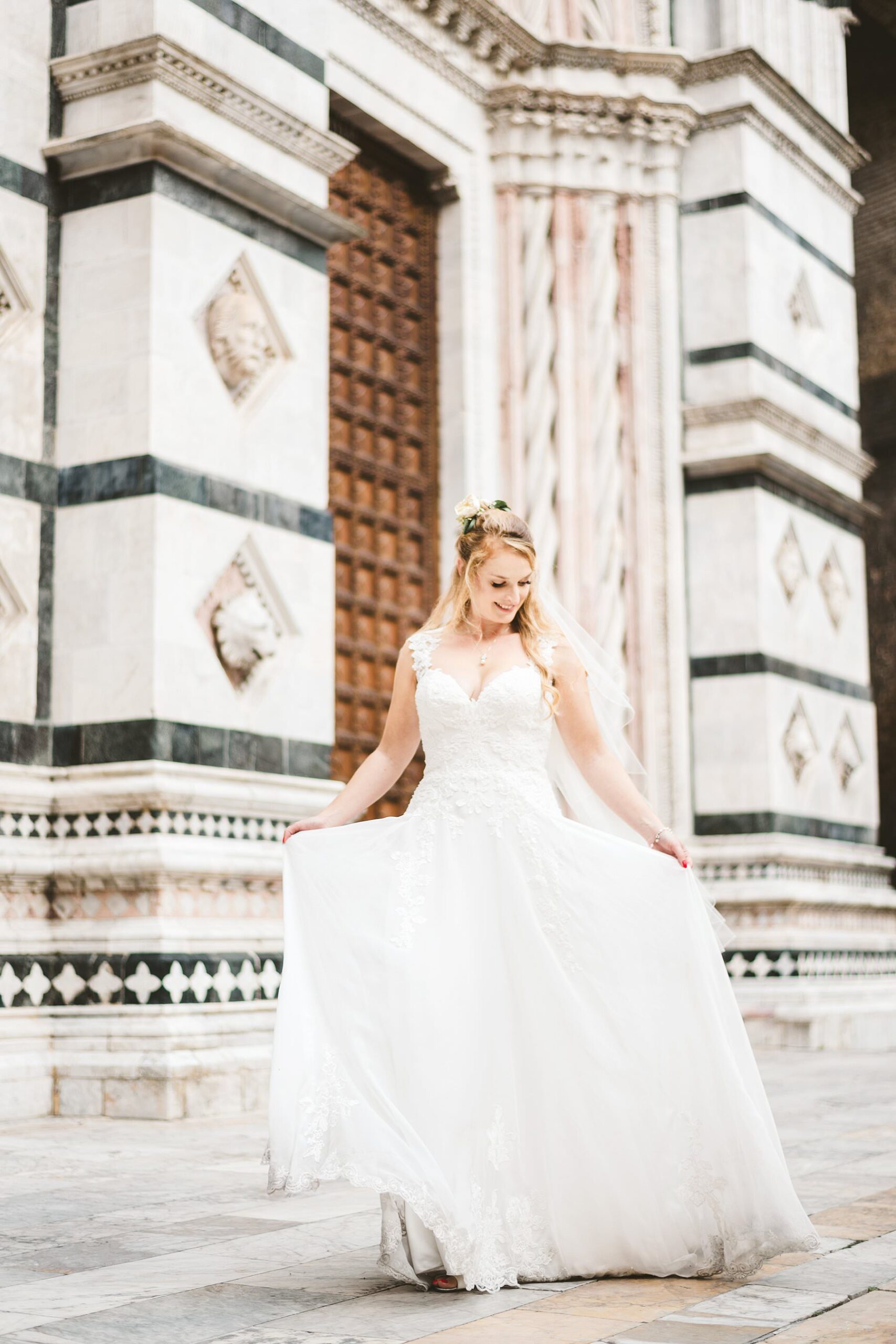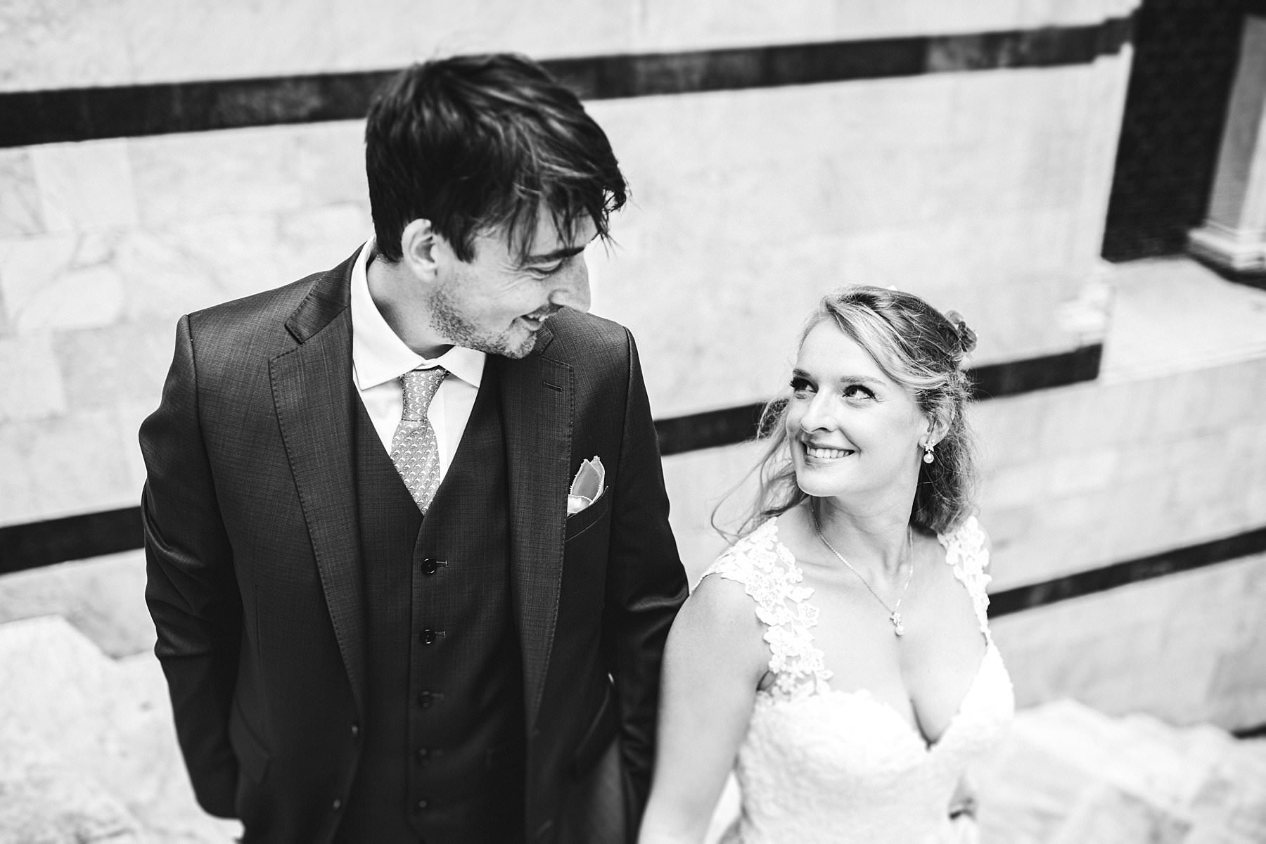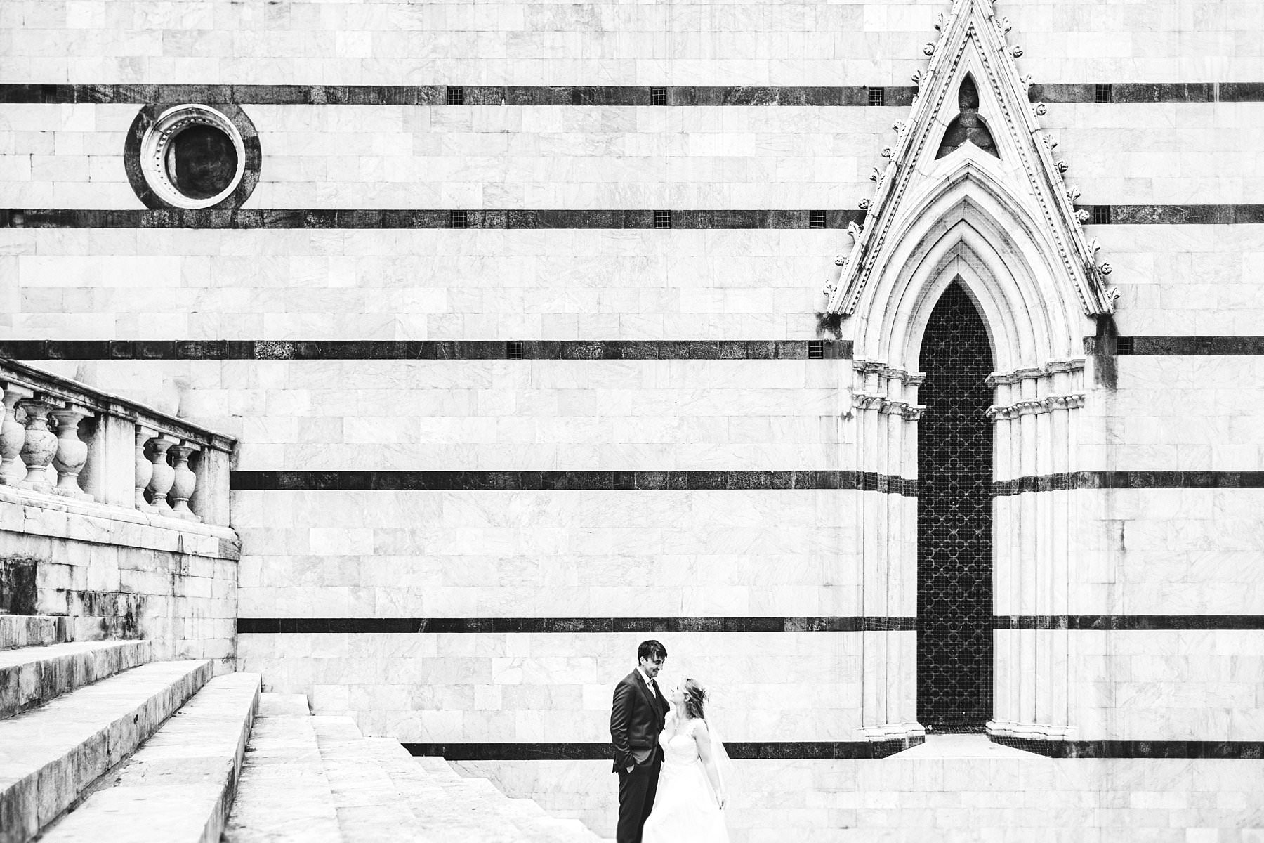 We started at Palazzo Coli Bizzarrini – a historic residence whose architecture and incredible frescoes take you back to the Renaissance – where the bride and groom got ready in two different rooms. Chris then reached the Town Hall and waited for Poppy in the Concistoro Hall – where I captured the emotional first look. After the ceremony, we took photos in all the most iconic places in Siena, including Piazza del Campo and the Duomo.