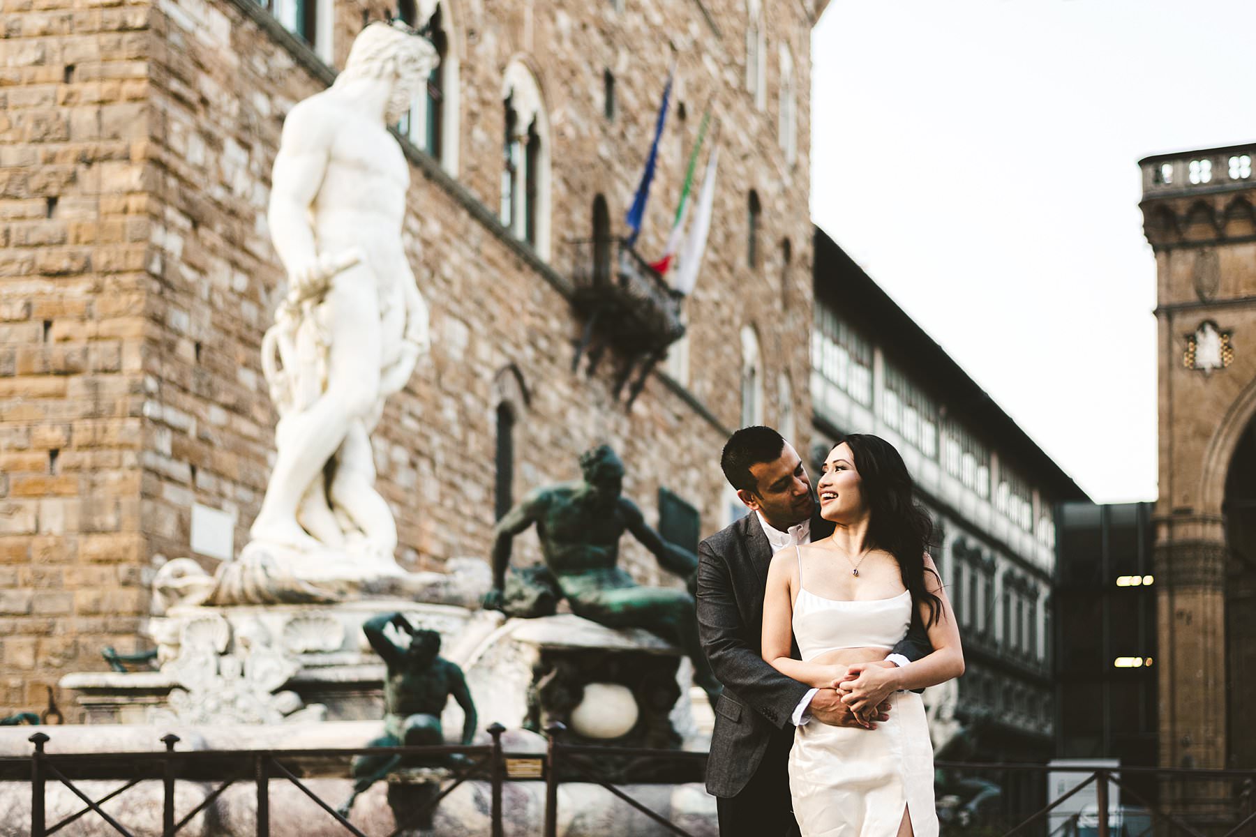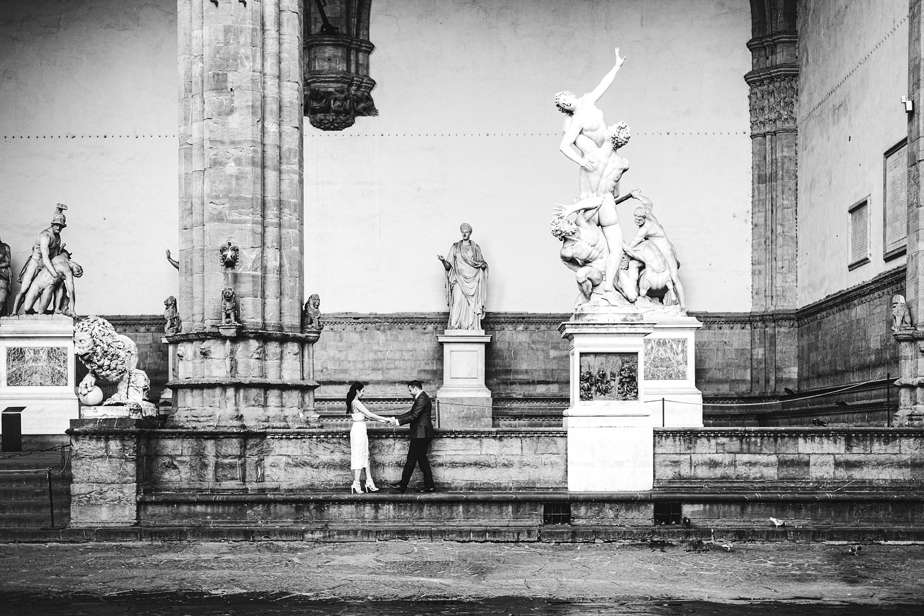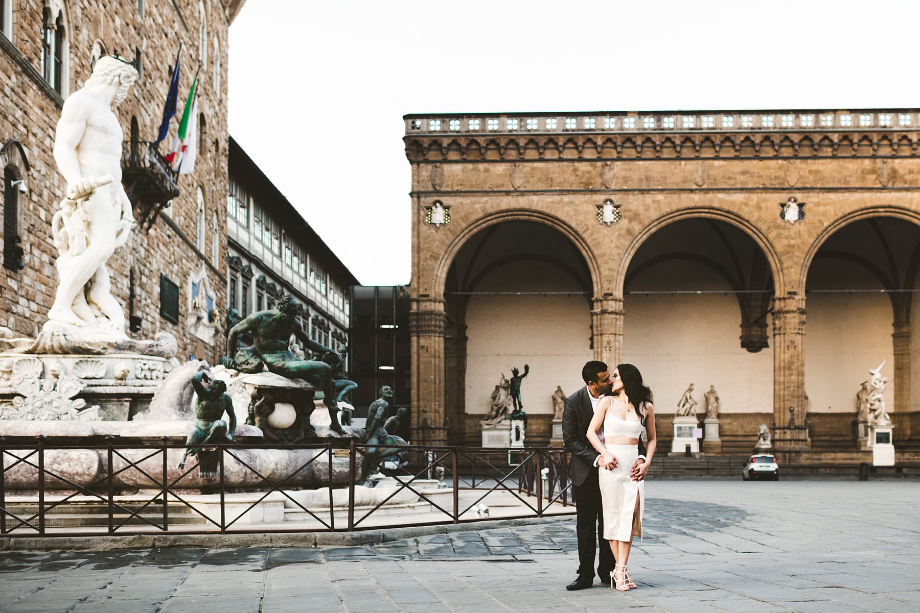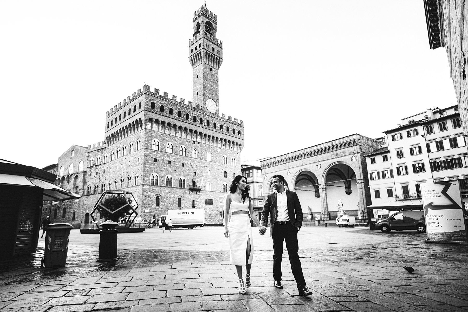 Beautiful couple walk tour sunrise early morning photo session in Florence at Piazza della Signoria near Palazzo Vecchio and Uffizi. Photo by the Italian elegant creative and modern engagement couple portrait photographer in Tuscany based Florence Gabriele Fani.