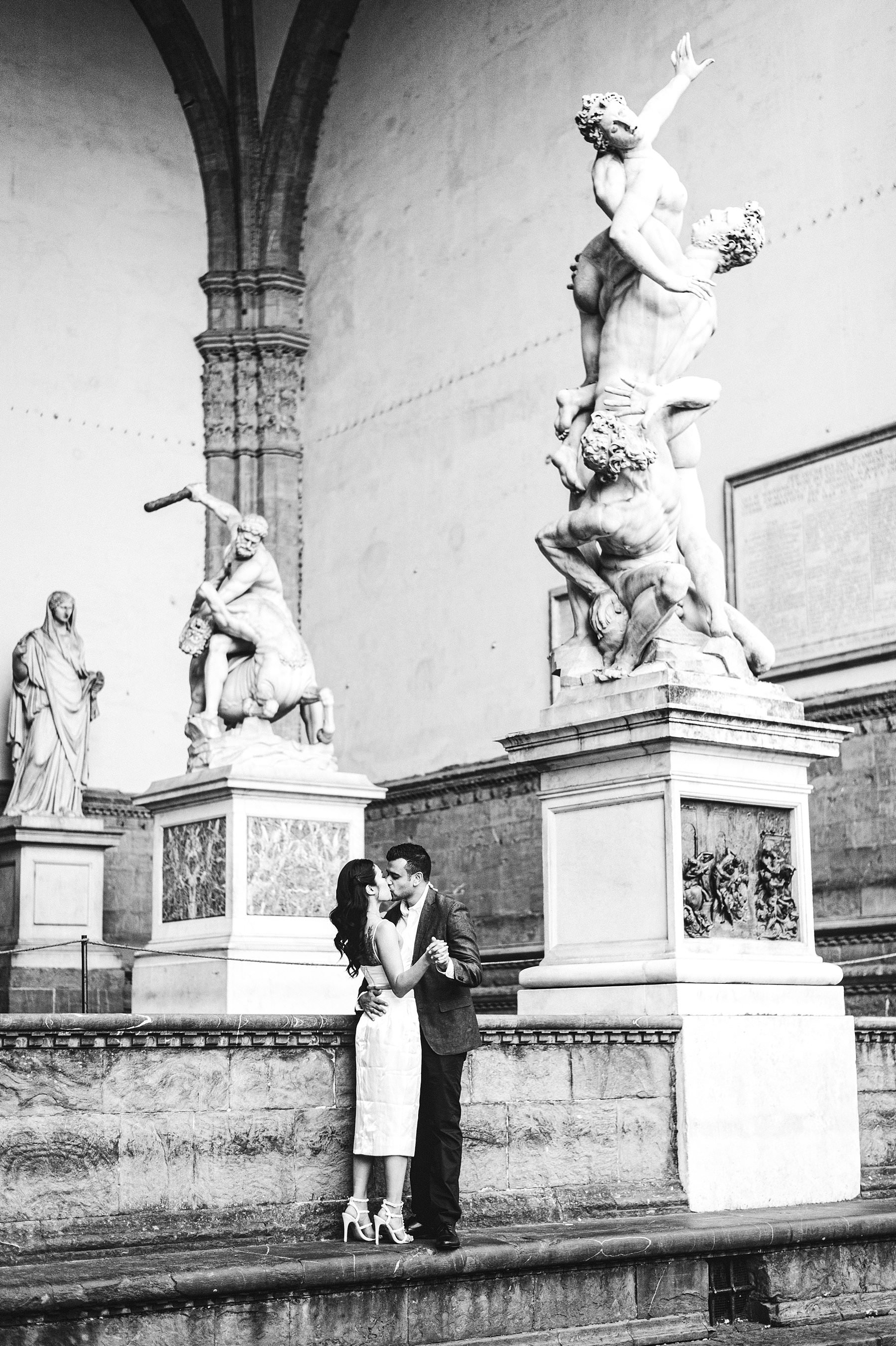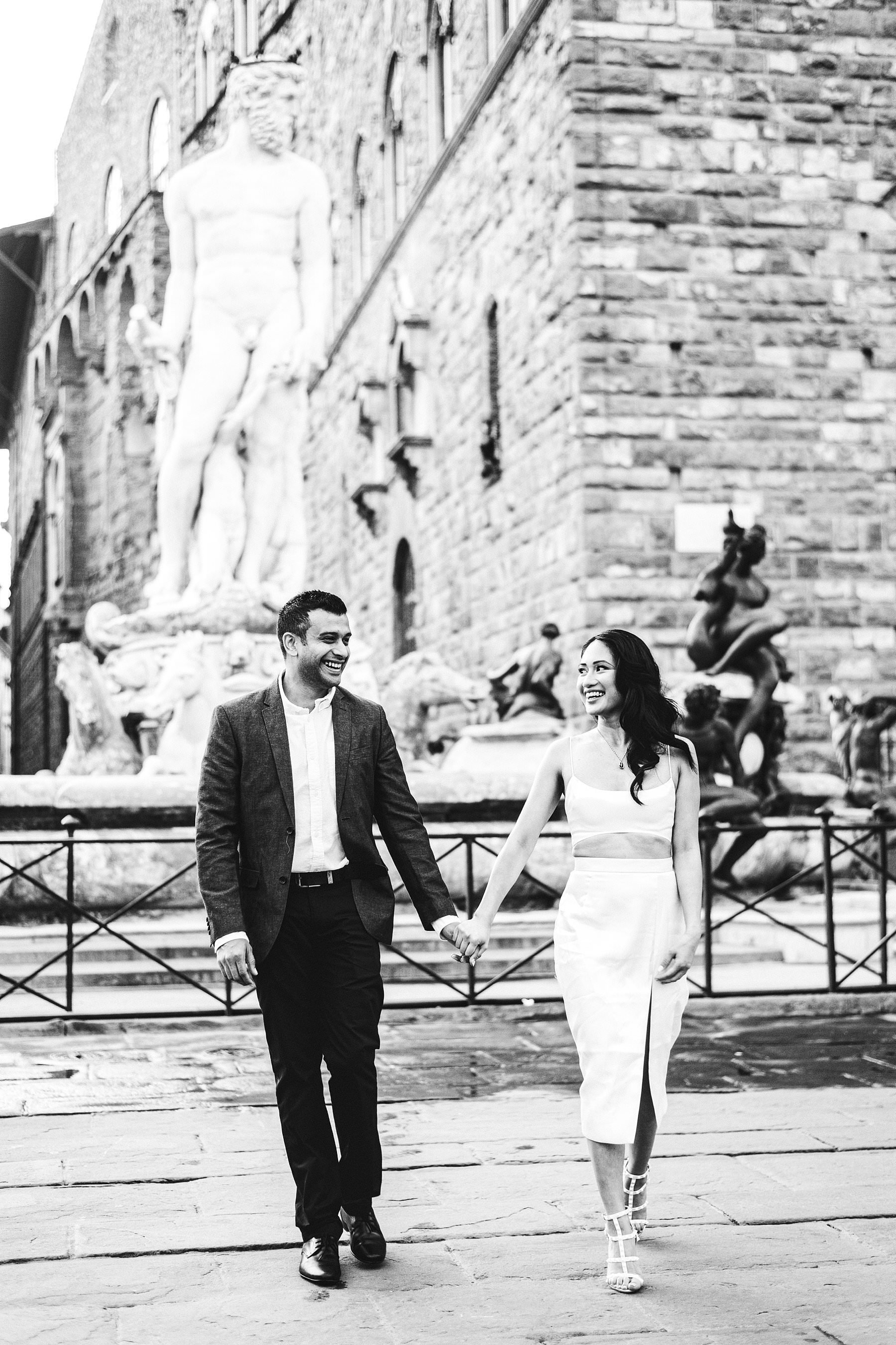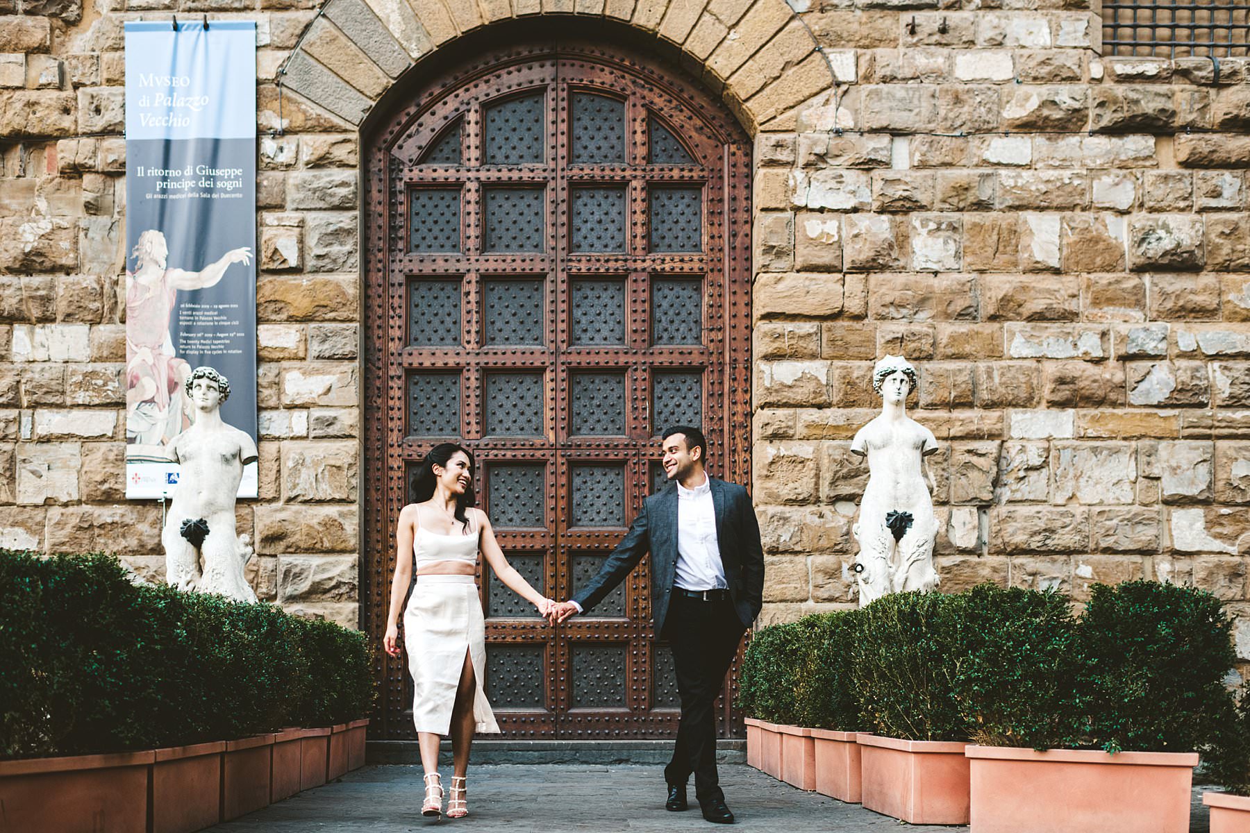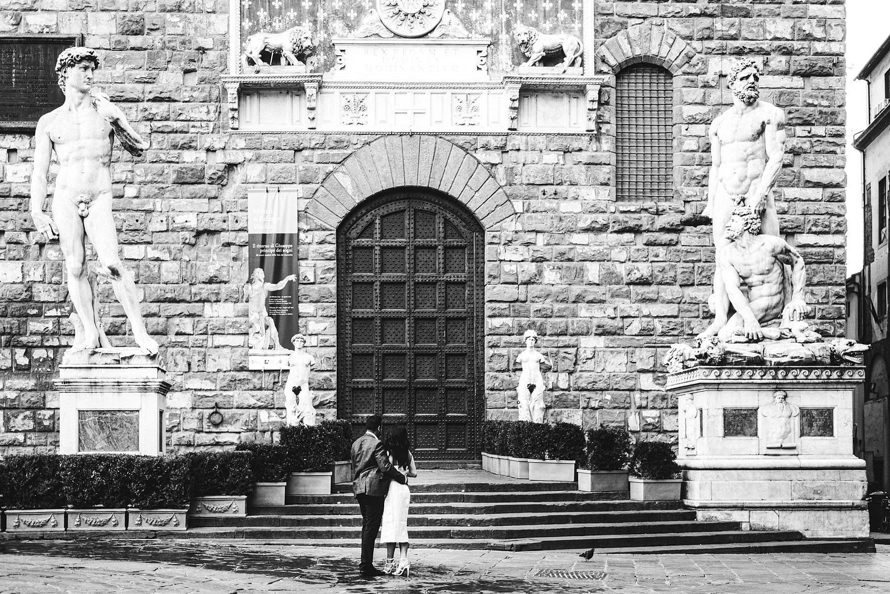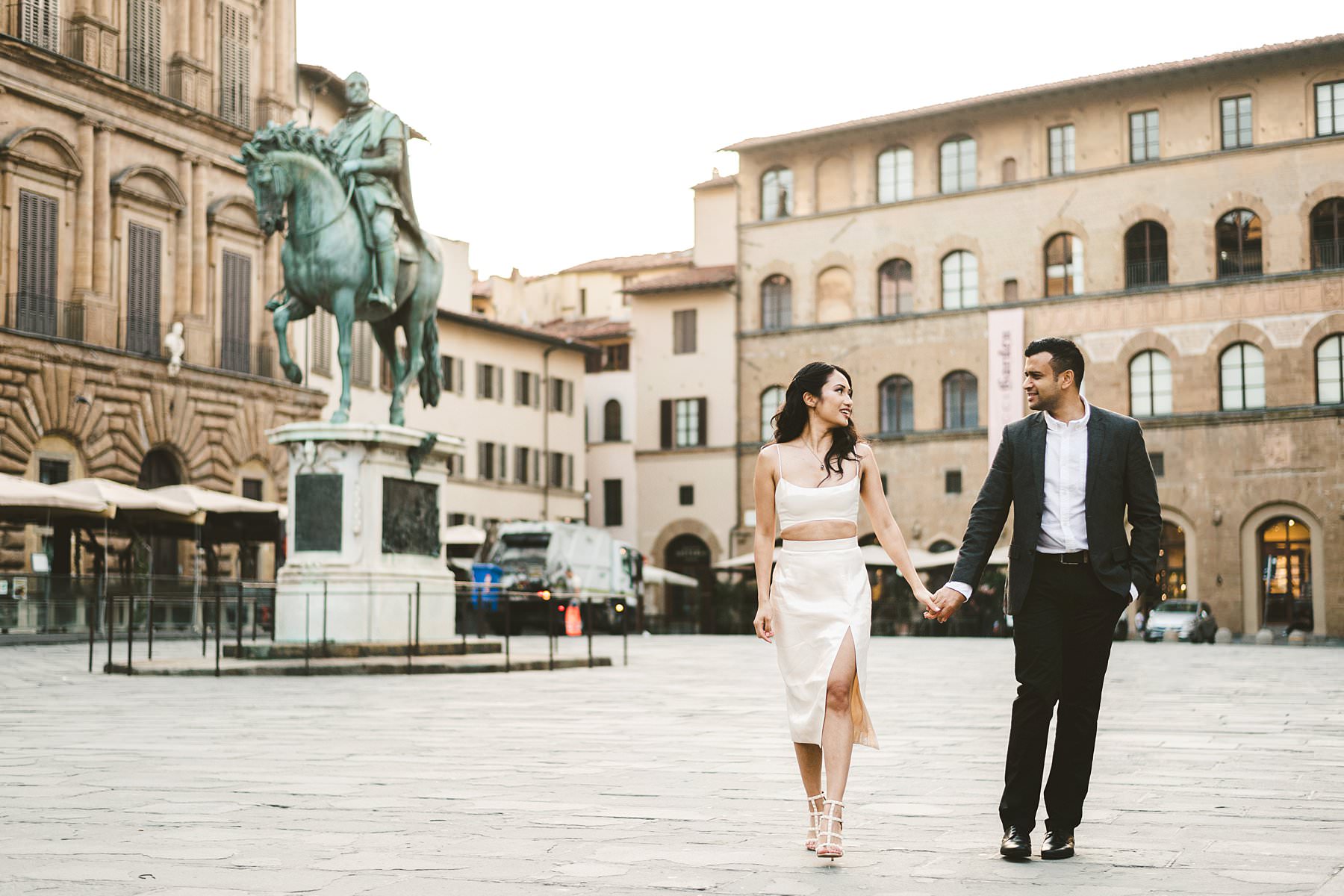Beautiful couple walk tour sunrise early morning photo session in Florence at Piazza della Signoria near Palazzo Vecchio and Uffizi. Photo by the Italian elegant creative and modern engagement couple portrait photographer in Tuscany based Florence Gabriele Fani.
