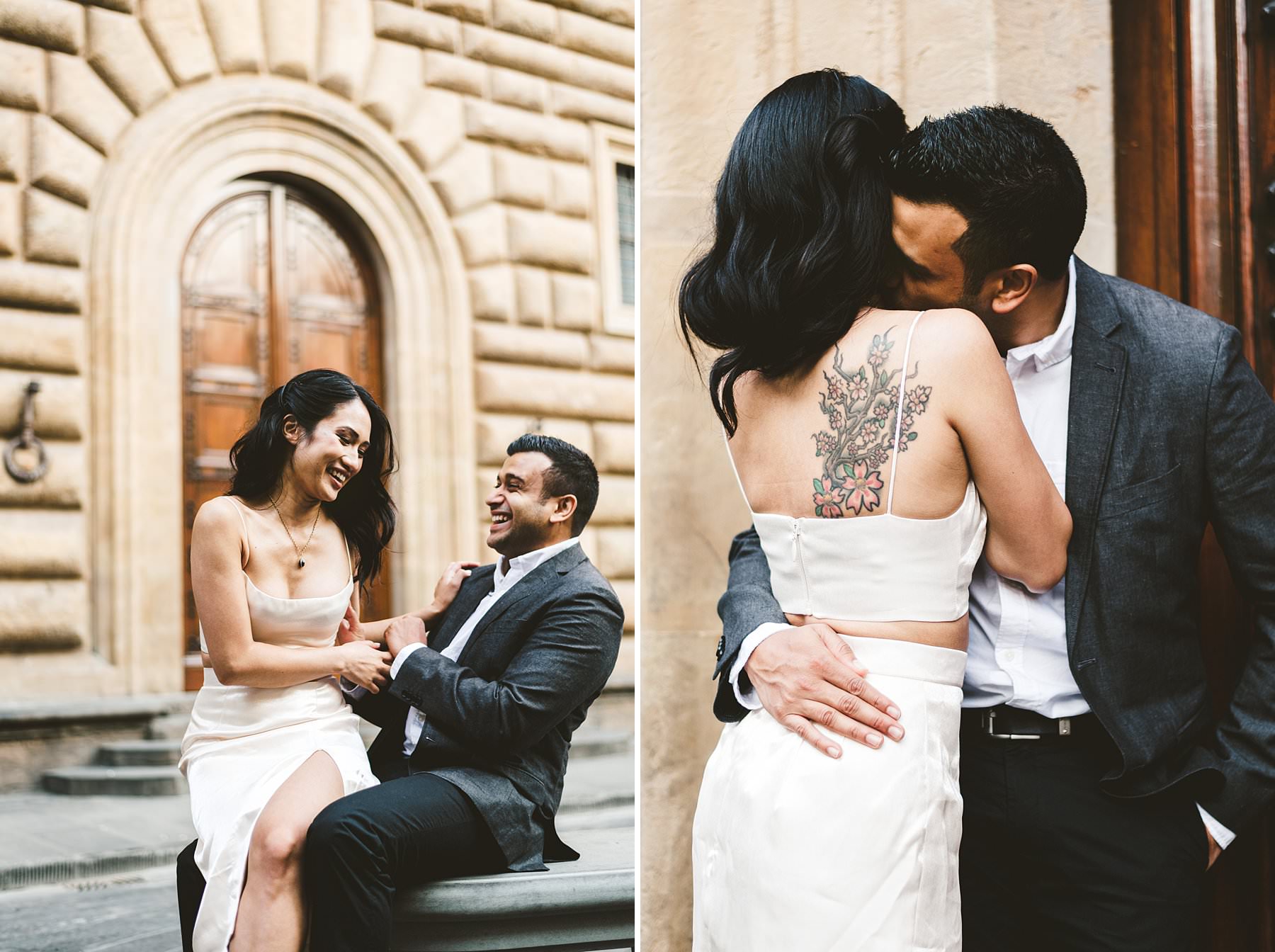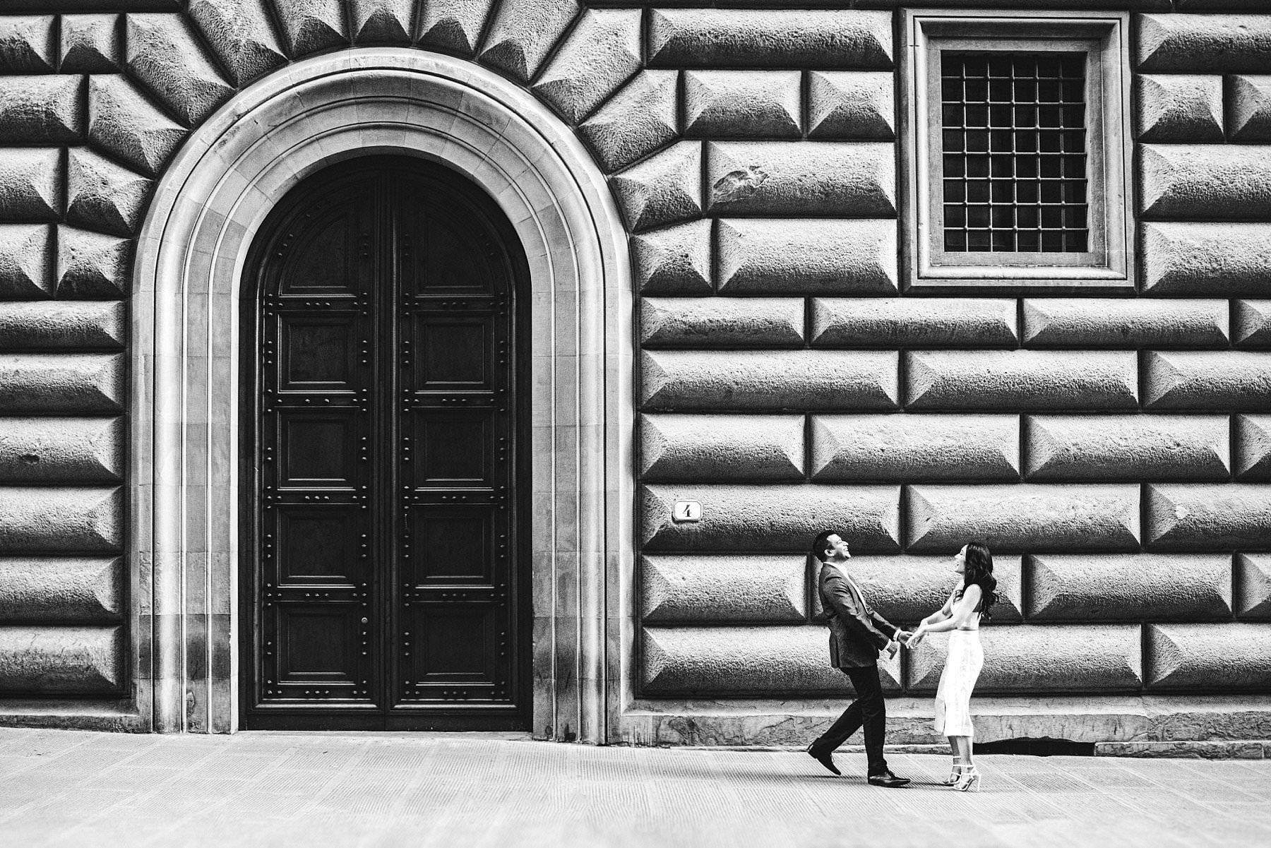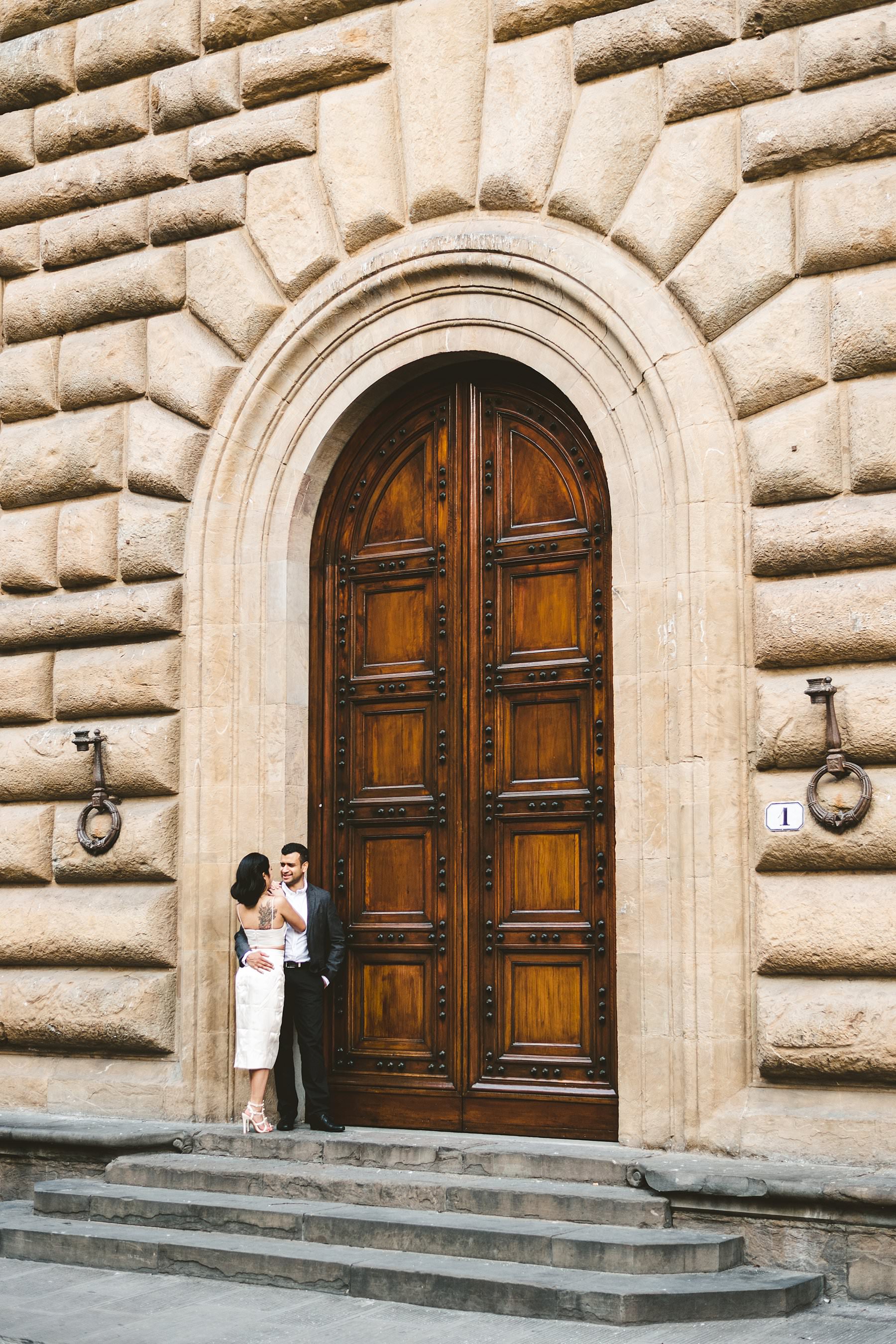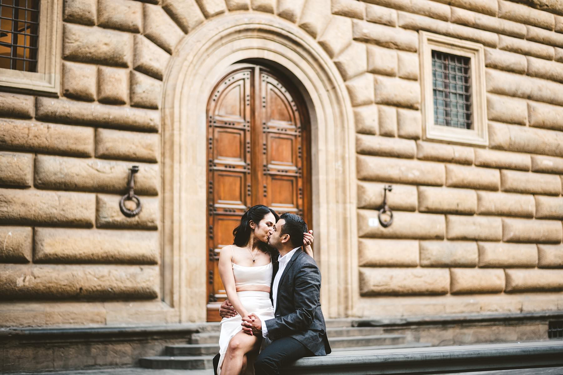 Lovely couple vacation prewedding photo session in Florence near Palazzo Gondi and Piazza della Signoria. Photo by the Italian elegant creative and modern engagement couple portrait photographer in Tuscany based Florence Gabriele Fani.