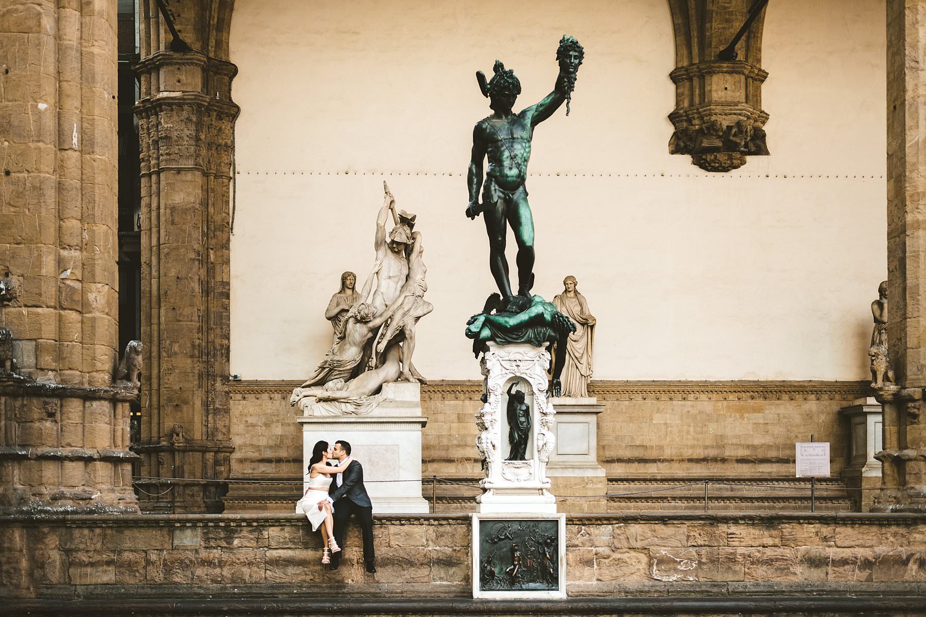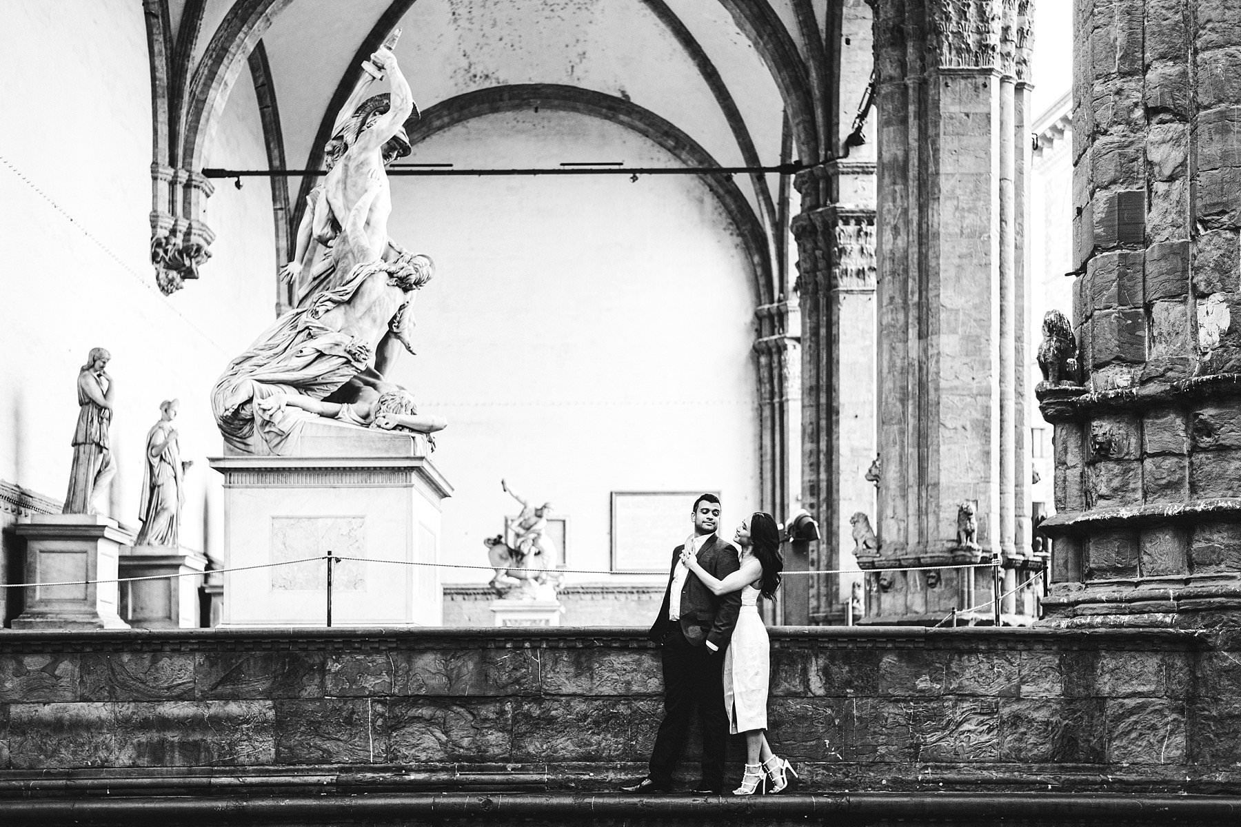 Creative and modern early morning sunrise couple portrait engagement photo session in the heart of Florence at Piazza della Signoria. Photo by the Italian elegant creative and modern engagement couple portrait photographer in Tuscany based Florence Gabriele Fani.