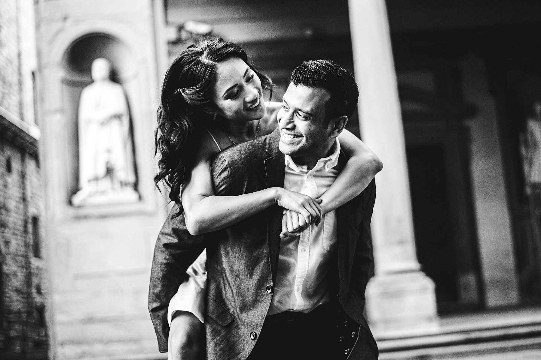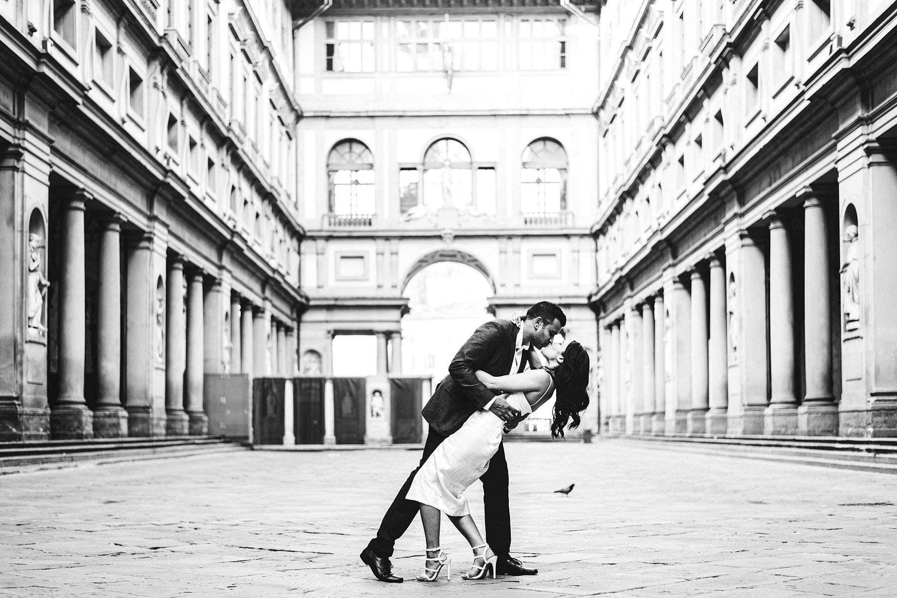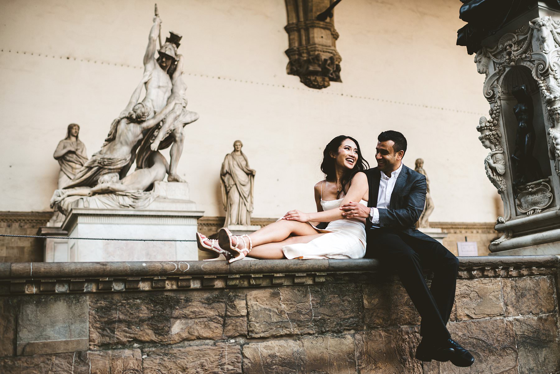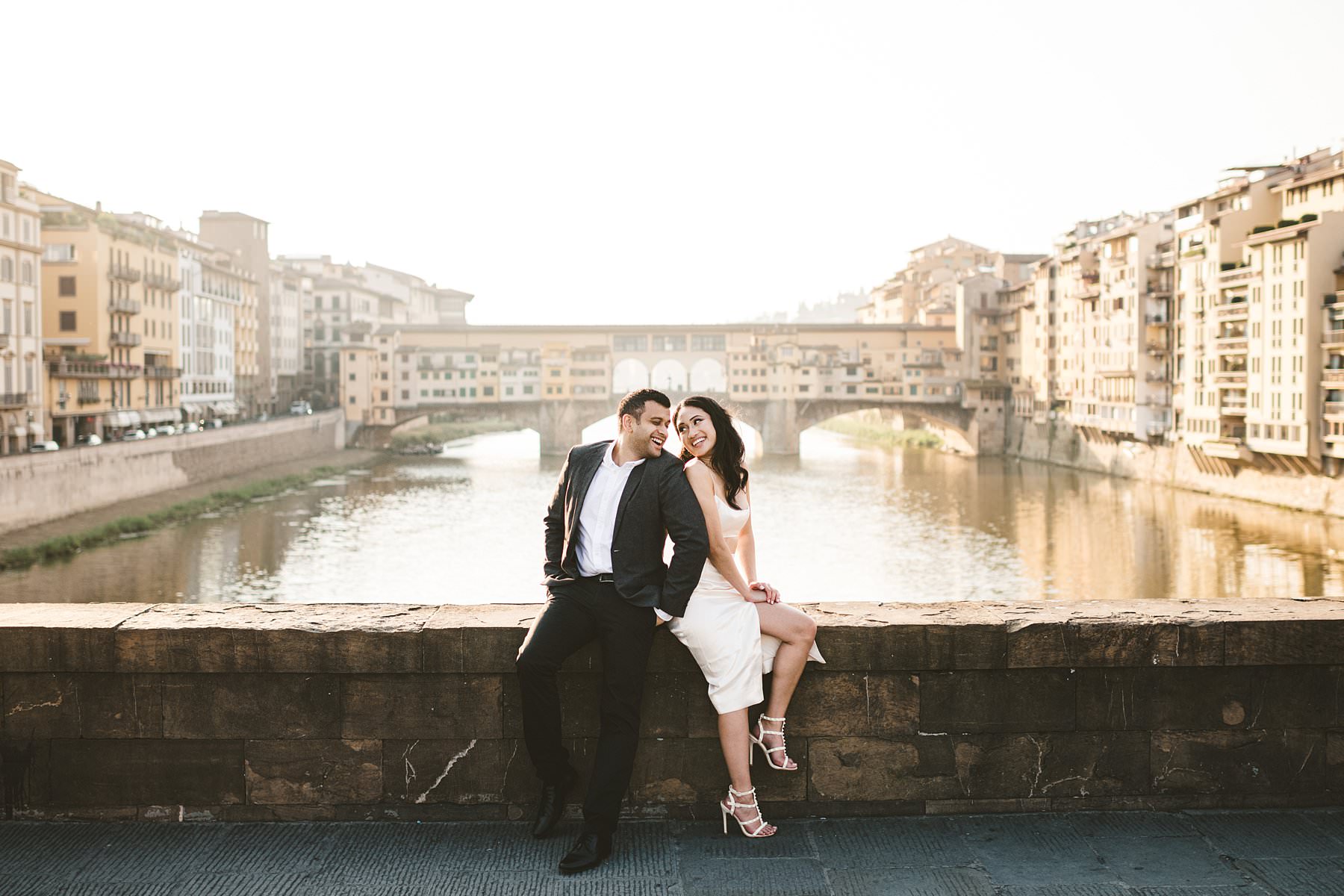 Early morning sunrise pre-wedding engagement photo shoot to celebrate the love in a breathtaking location in Florence, the cradle of Renaissance. We met in a desert Florence on a very early August morning, and fully enjoyed its charm while taking sunrise photos in its most scenic spots. Piazza della Signoria, Uffizi, Ponte Vecchio and Piazzale Michelangelo: the soon-to-be bride and groom were free to express their feelings all over the city, away from prying eyes, cherishing every second of the session. And, equally important, they got to use the sunrise photos to create personalized wedding invitations! Photo by the Italian elegant creative and modern engagement couple portrait photographer in Tuscany based Florence Gabriele Fani.