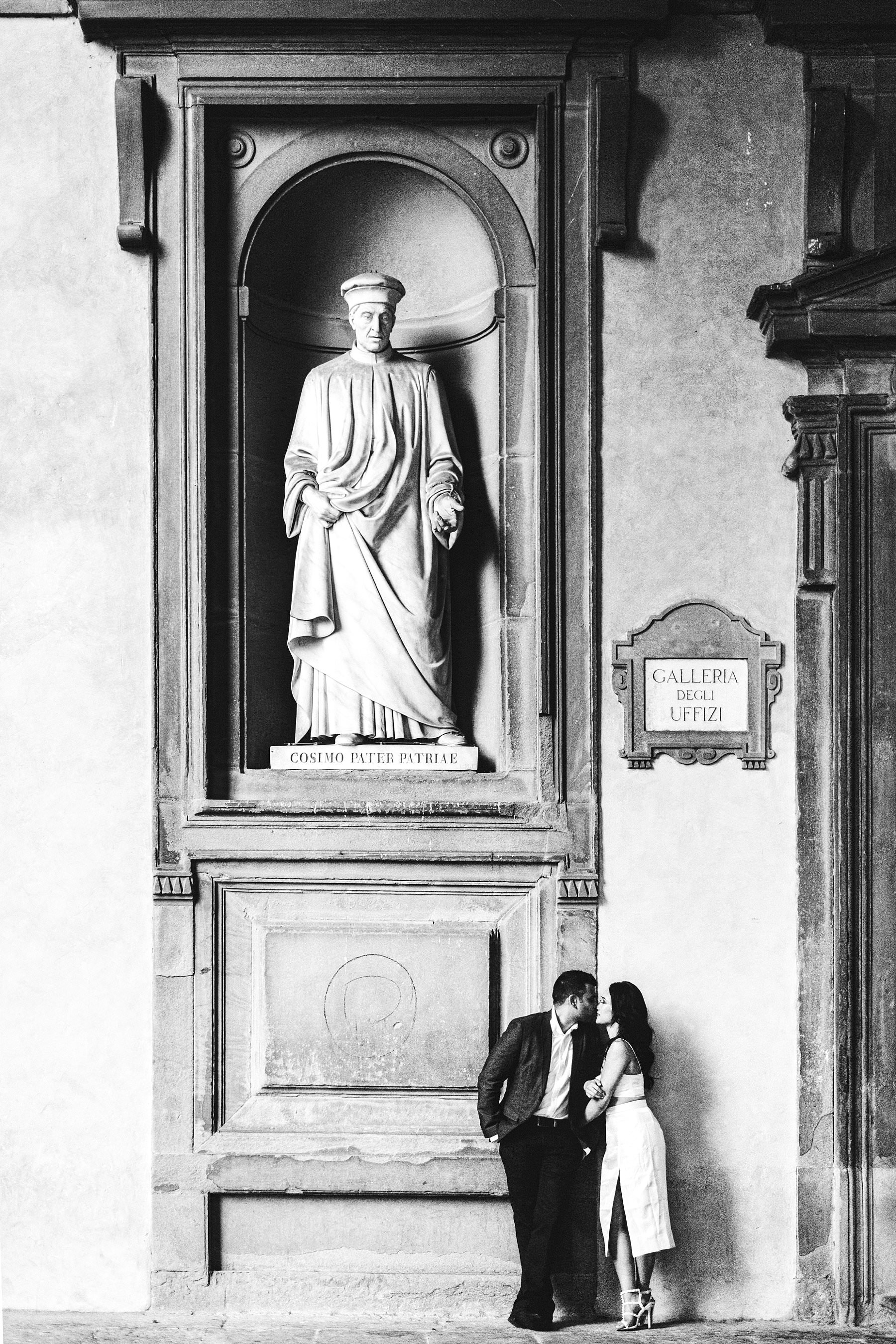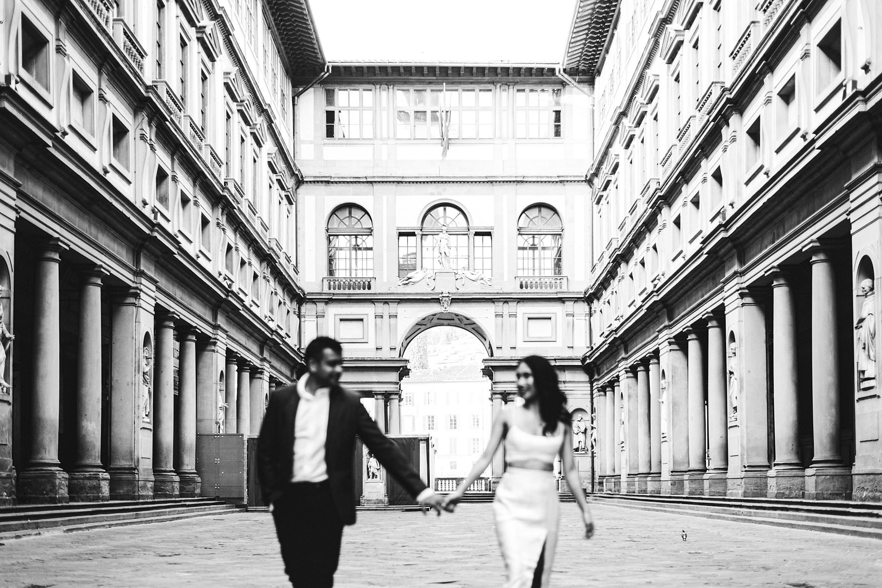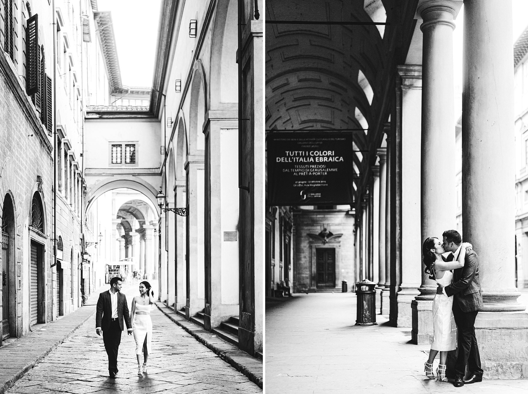 Lovely early morning engagement pre-wedding candid photo in Florence at Uffizi arch gallery. Photo by the Italian elegant creative and modern engagement couple portrait photographer in Tuscany based Florence Gabriele Fani.