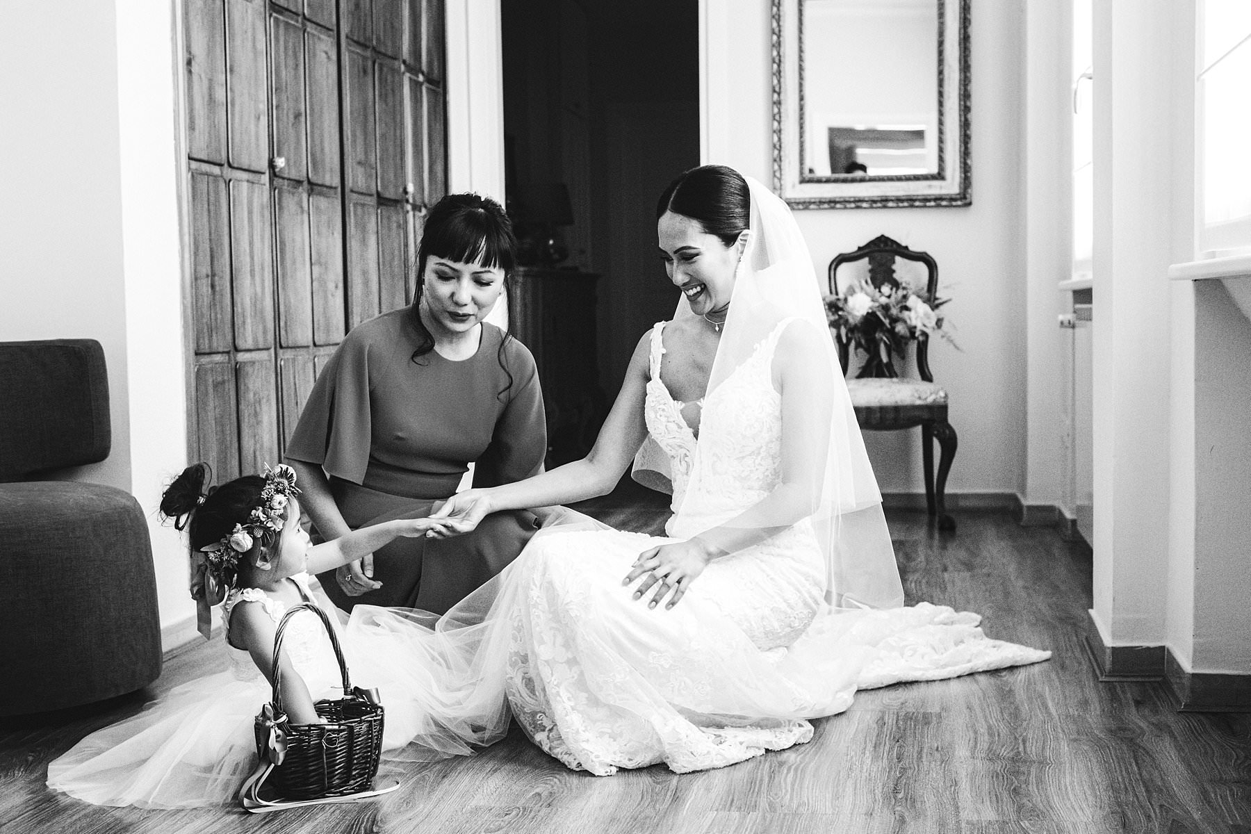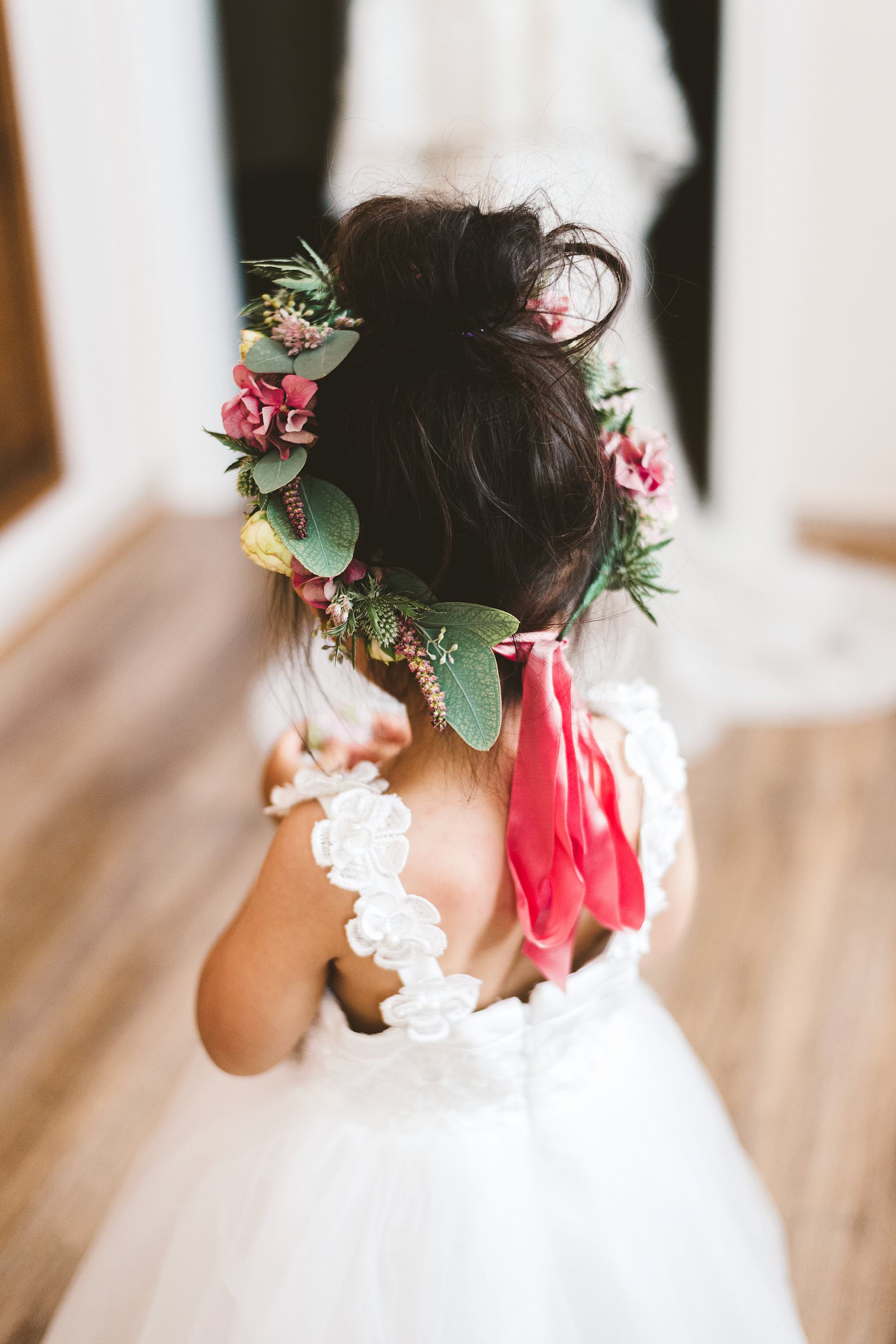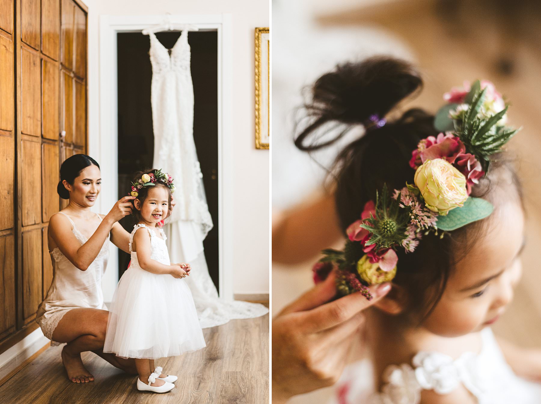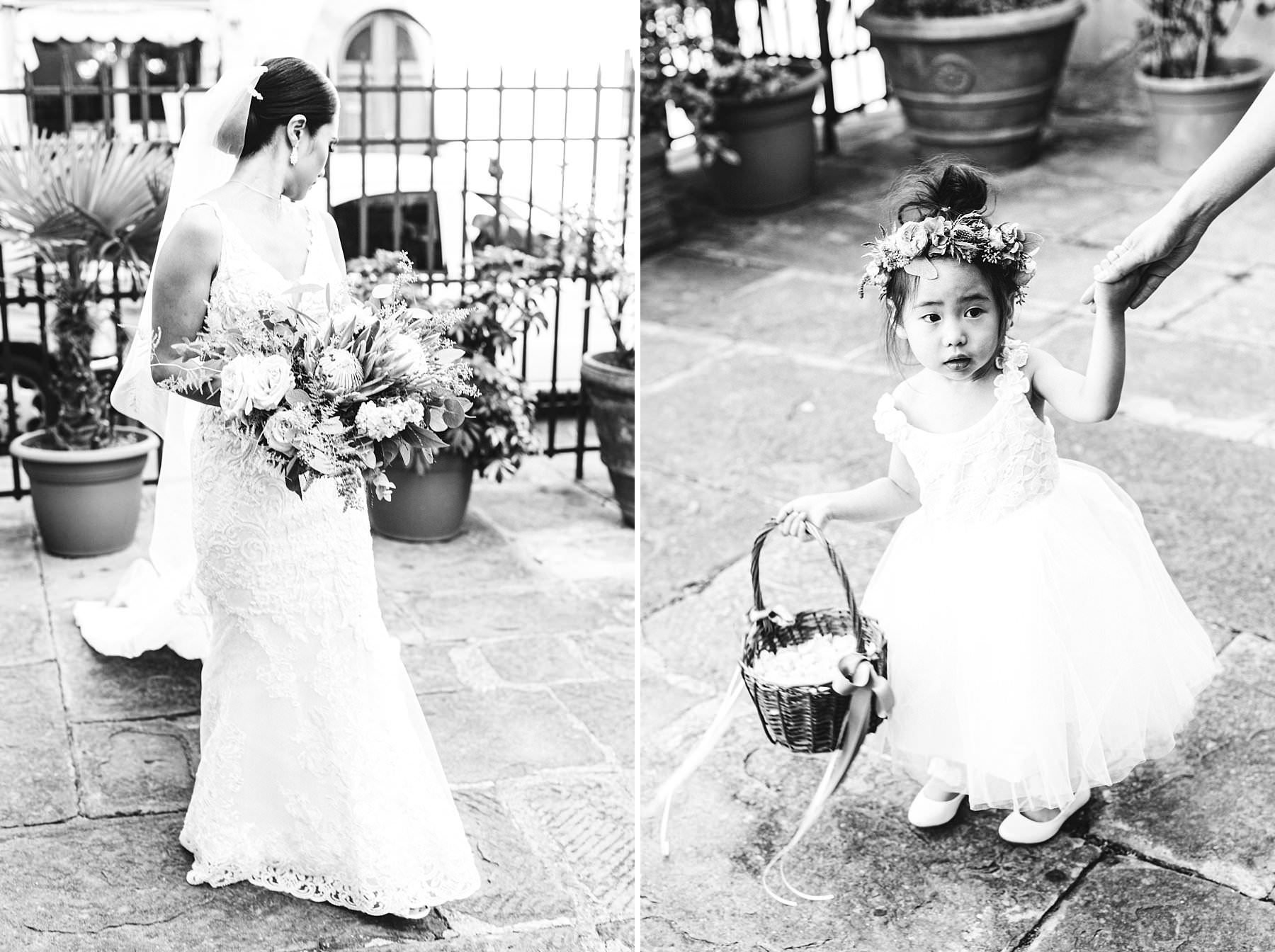 Intimate destination wedding in Florence. Bride Liza with beautiful flower girl preparation. Flowers by Jardin Divers. Photo by the Italian elegant creative and modern destination wedding photographer in Tuscany based Florence Gabriele Fani.