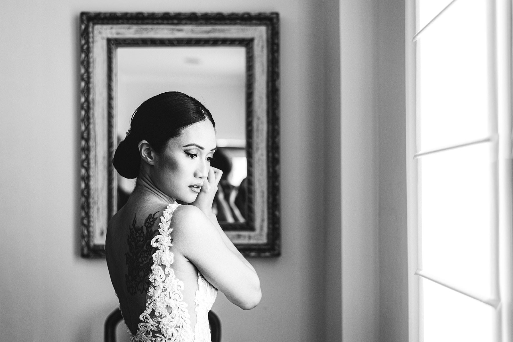 Gorgeous bride Liza in her luxury and beautiful Martina Liana wedding gown during getting ready. Intimate destination wedding in Florence. Photo by the Italian elegant creative and modern destination wedding photographer in Tuscany based Florence Gabriele Fani.
