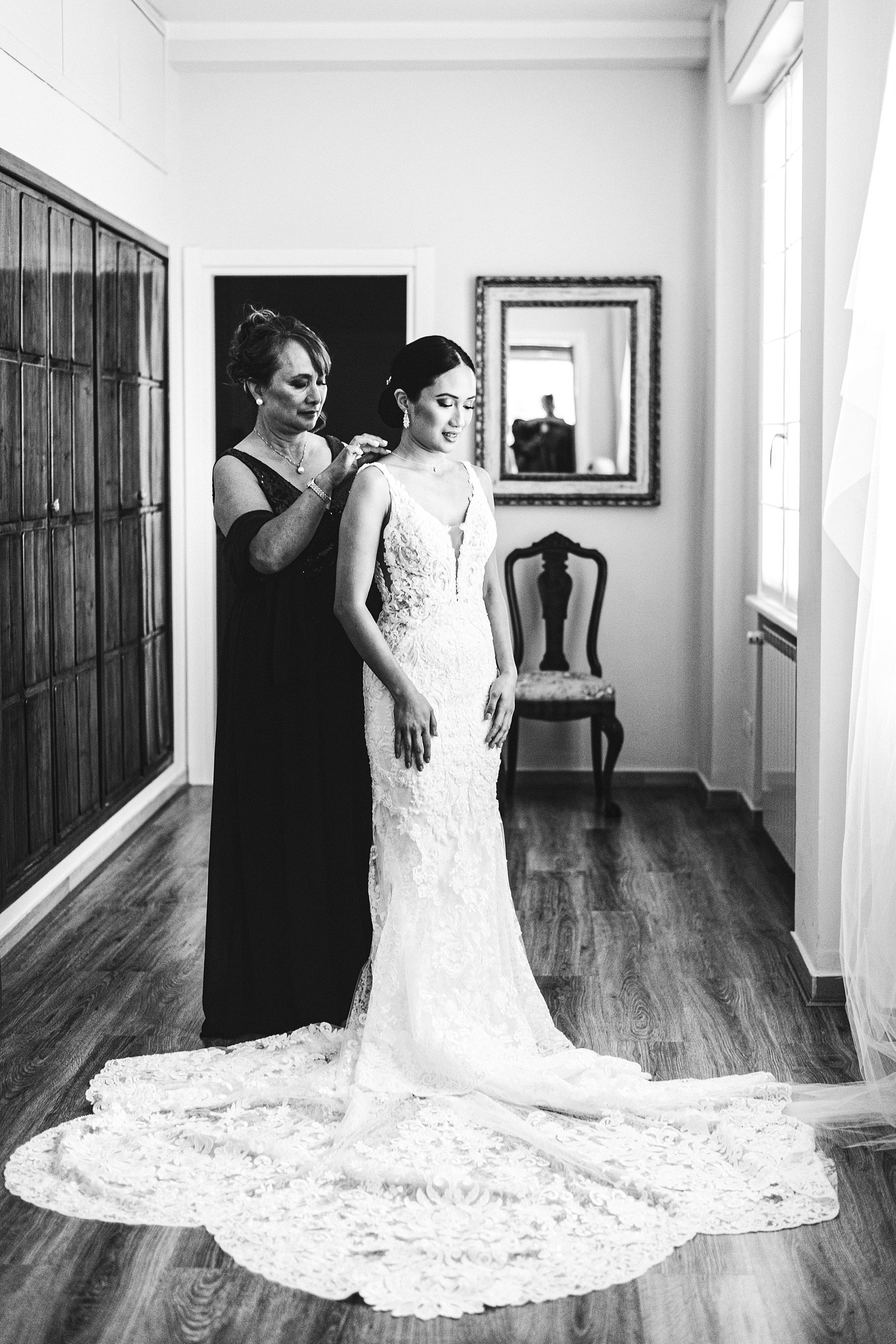 Beautiful moment with mom and bride Liza in her luxury Martina Liana wedding gown during getting ready. Intimate destination wedding in Florence. Photo by the Italian elegant creative and modern destination wedding photographer in Tuscany based Florence Gabriele Fani.