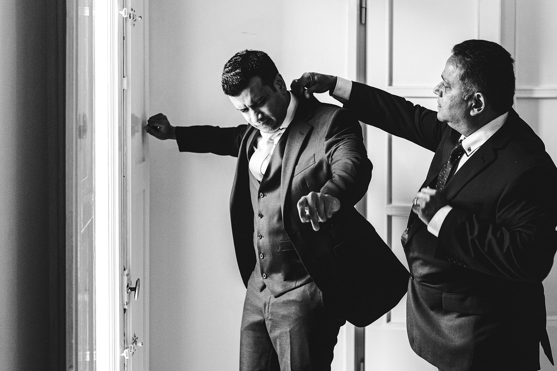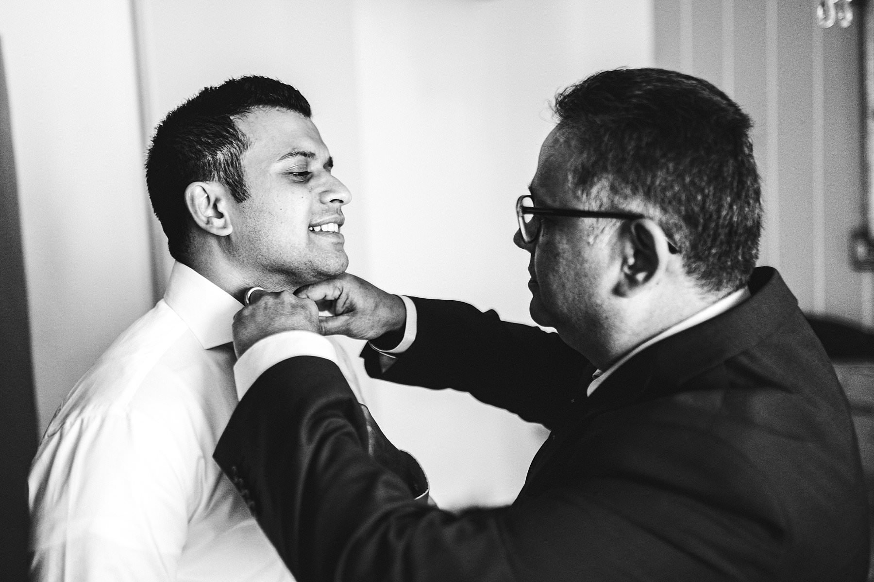 Groom with dad during preparation before the catholic wedding ceremony. Photo by Lorenzo Patoia for the Italian elegant creative and modern destination wedding photographer in Tuscany based Florence Gabriele Fani.
