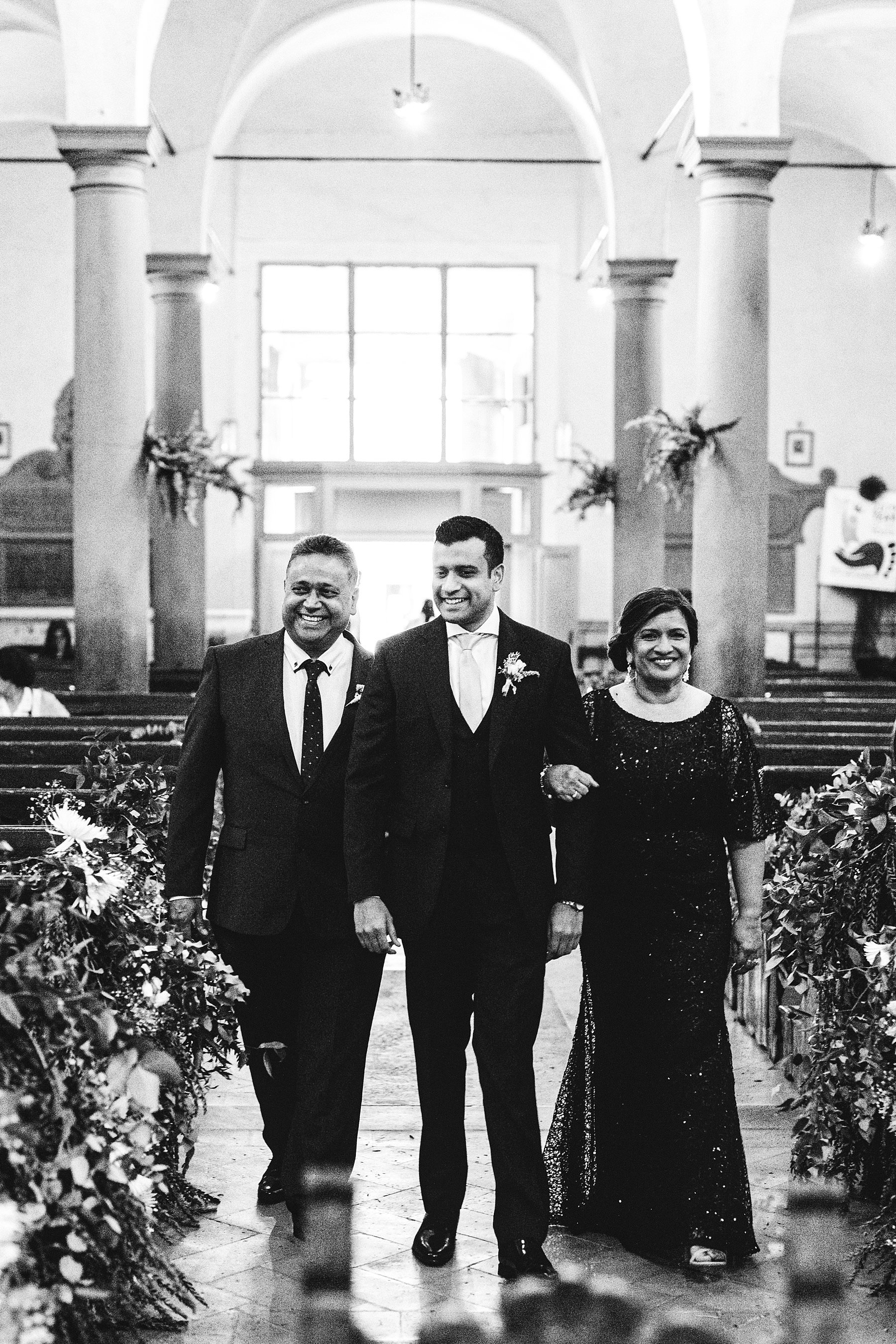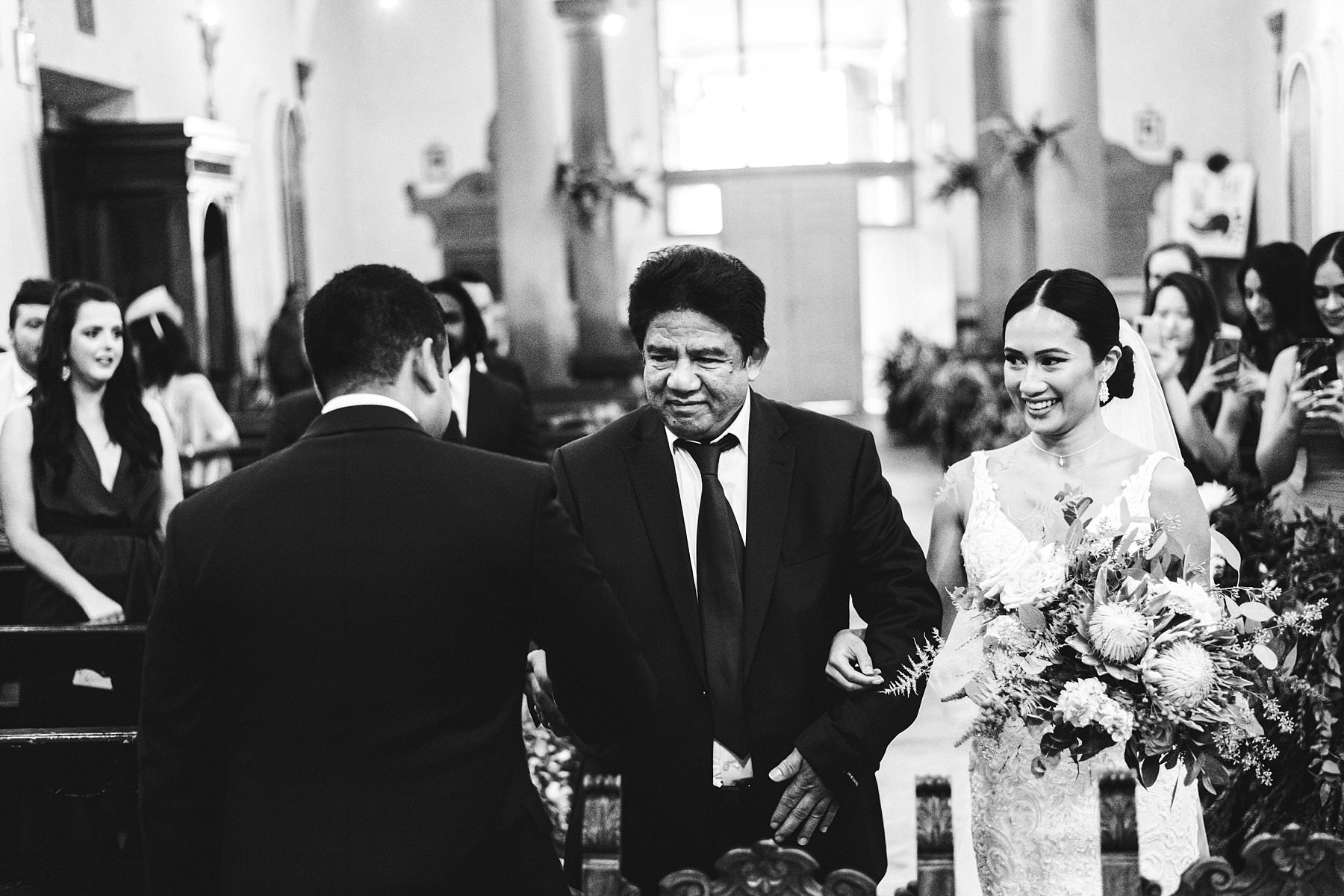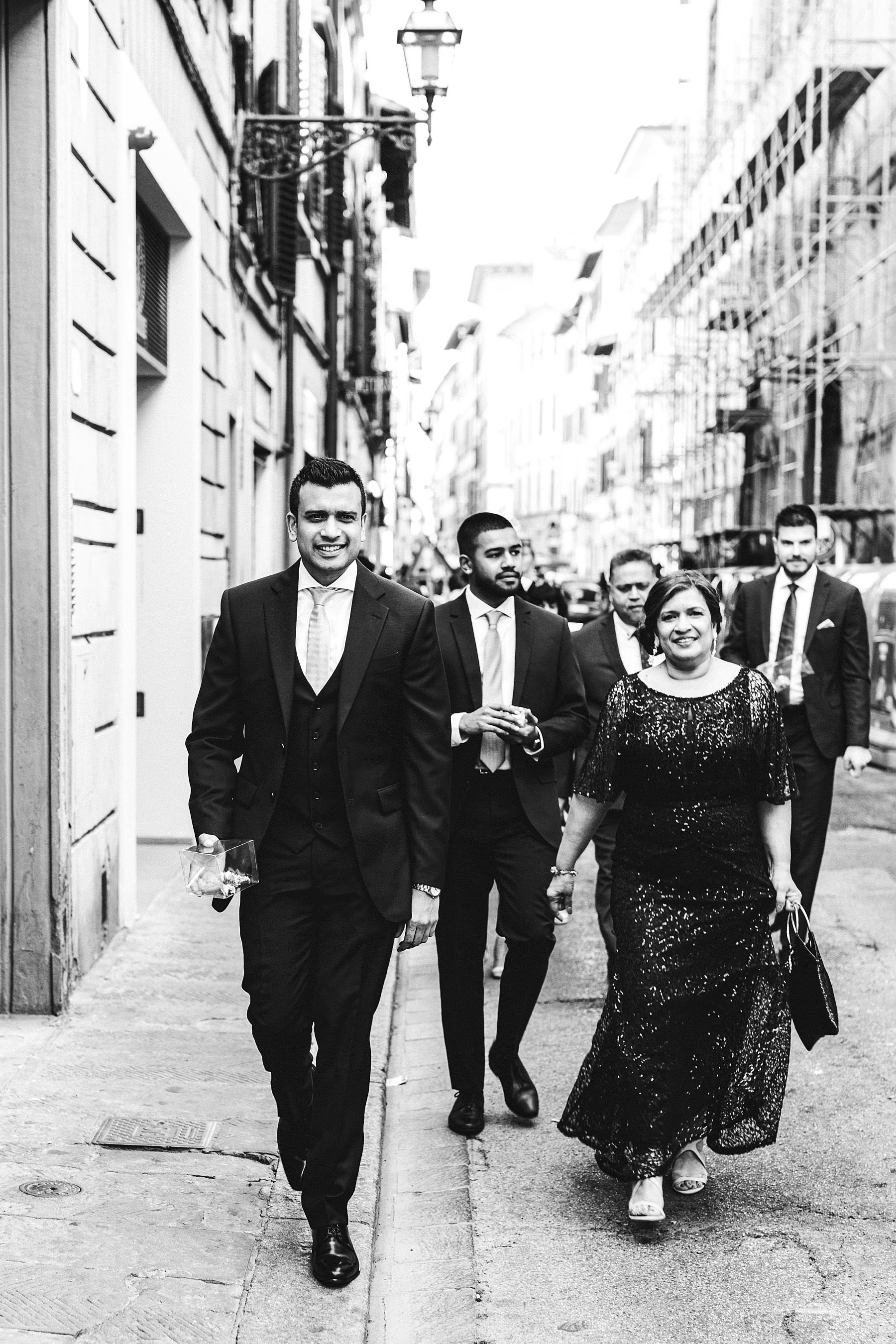 Lovely reportage wedding shoot with elegant bride Liza while walks down the aisle at San Barnaba Church in Florence in her Martina Liana luxury gown. Groom Justin is welcoming the father of his future spouse. Intimate destination wedding in Florence. Photo by the Italian elegant creative and modern destination wedding photographer in Tuscany based Florence Gabriele Fani.