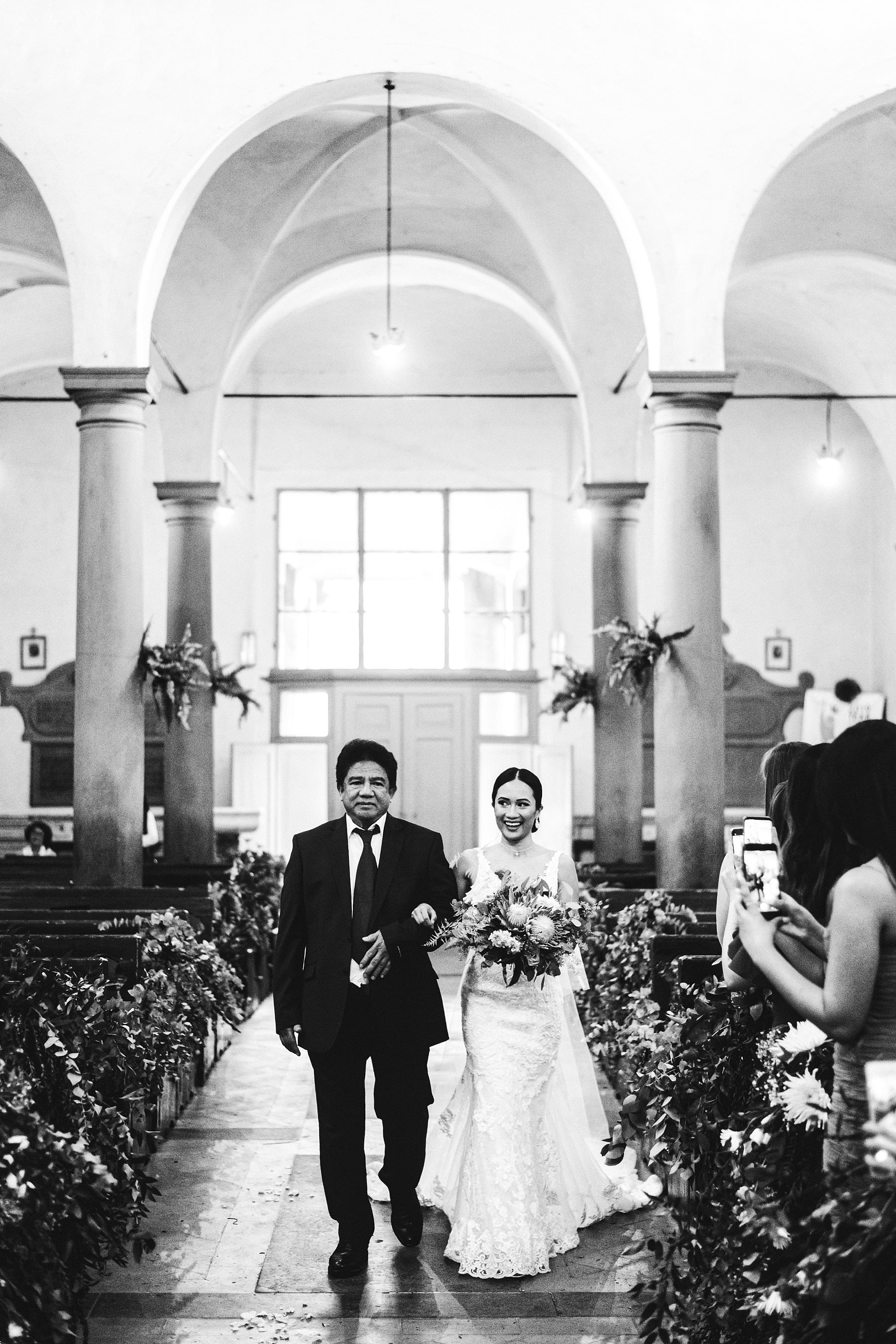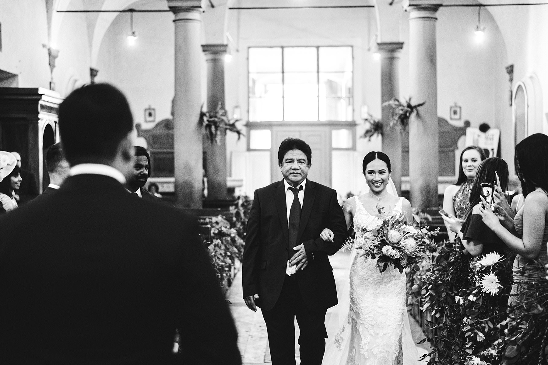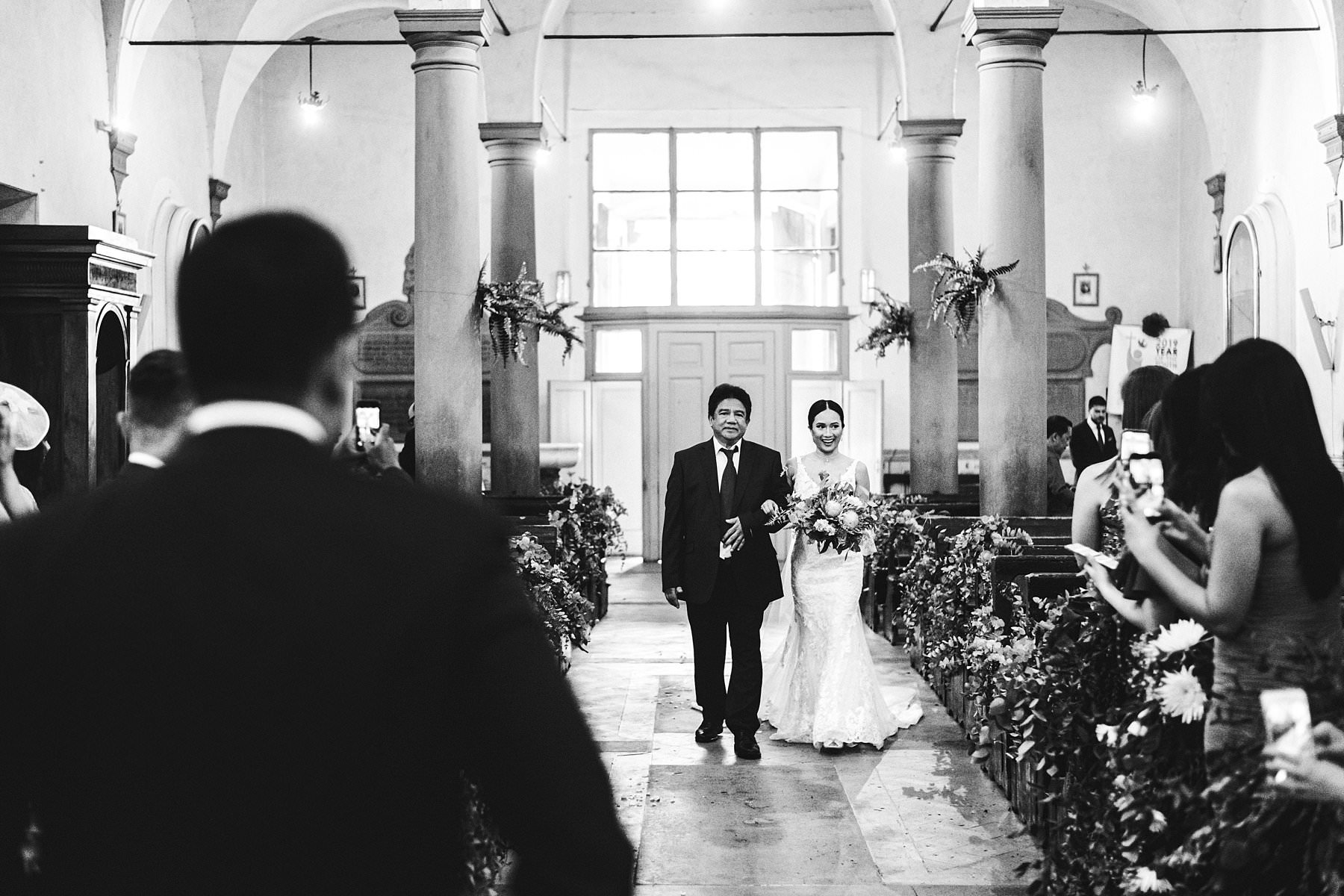 Emotional bride Liza walks down the aisle at San Barnaba Church in Florence in her Martina Liana luxury gown. Intimate destination wedding in Florence. Photo by the Italian elegant creative and modern destination wedding photographer in Tuscany based Florence Gabriele Fani.
