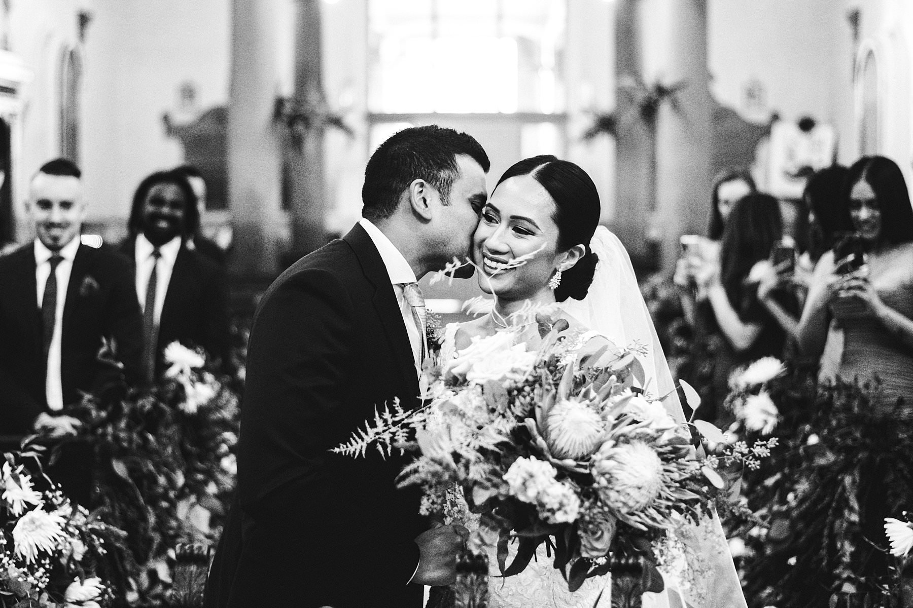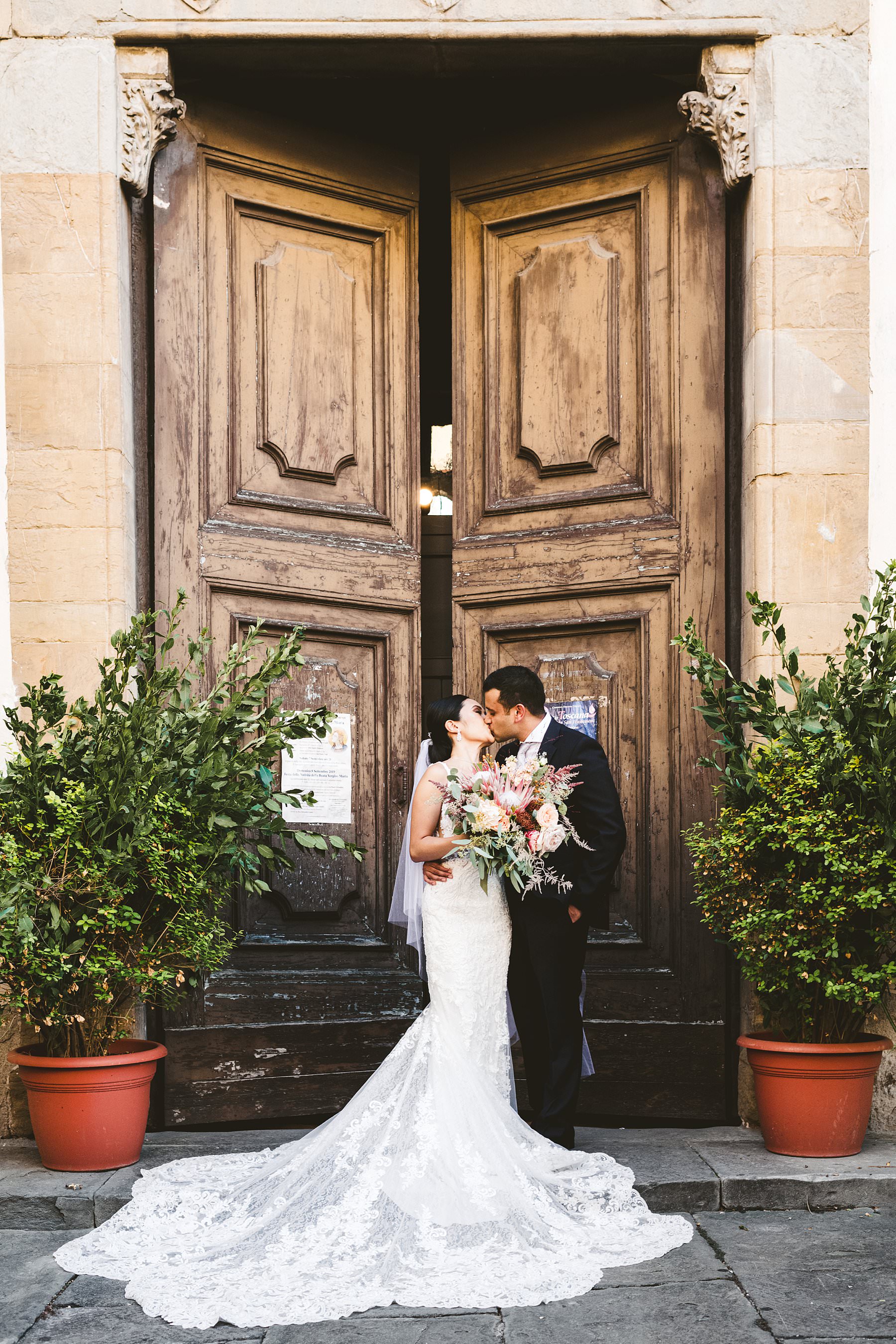 Lovely kiss of bride and groom after the bride walks of the aisle at San Barnaba Church. Intimate destination wedding in Florence. Photo by the Italian elegant creative and modern destination wedding photographer in Tuscany based Florence Gabriele Fani.