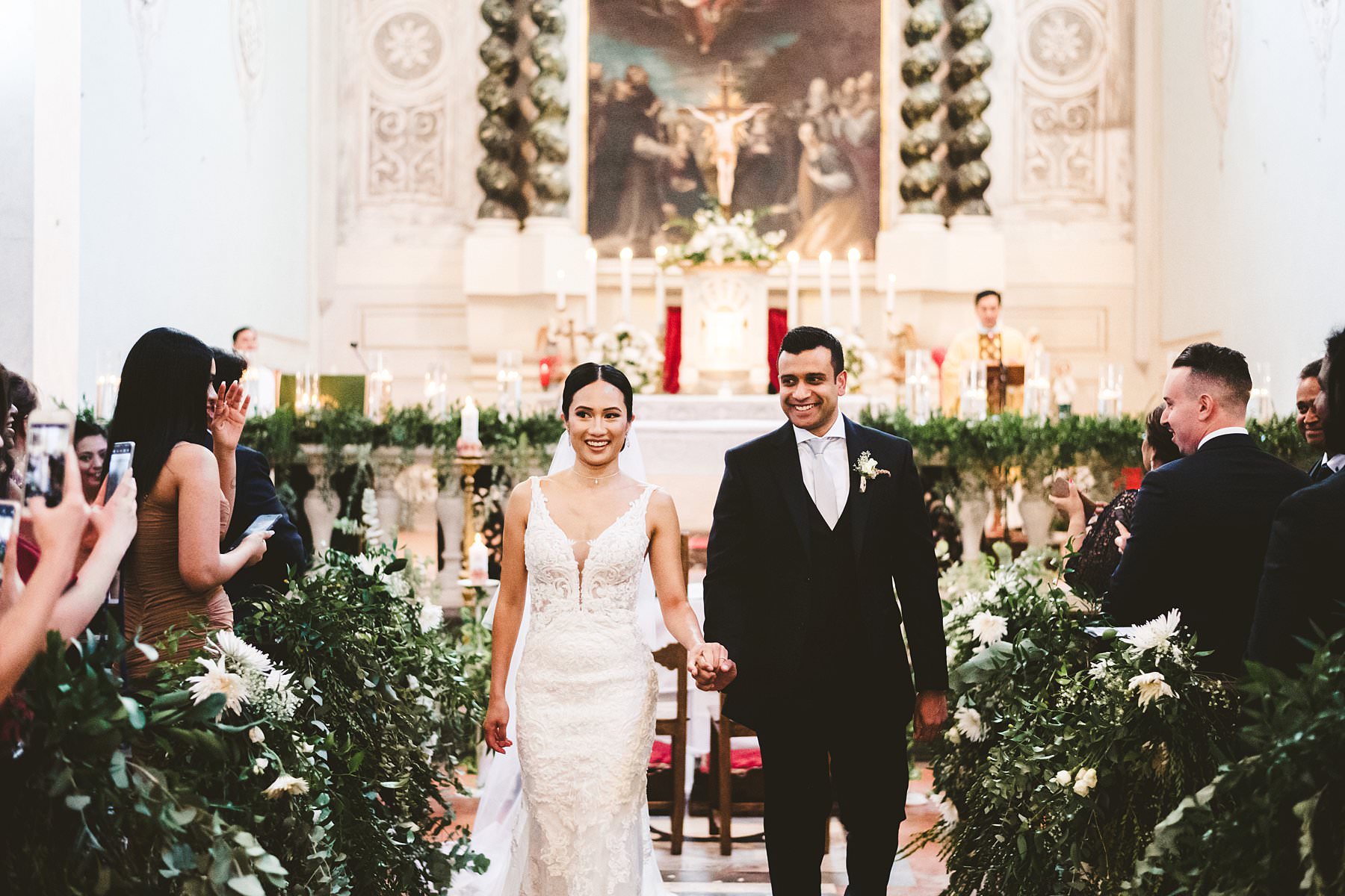 Lovely bride and groom walk out the San Barnaba Church after their wedding ceremony. Intimate destination wedding in Florence. Photo by the Italian elegant creative and modern destination wedding photographer in Tuscany based Florence Gabriele Fani.
