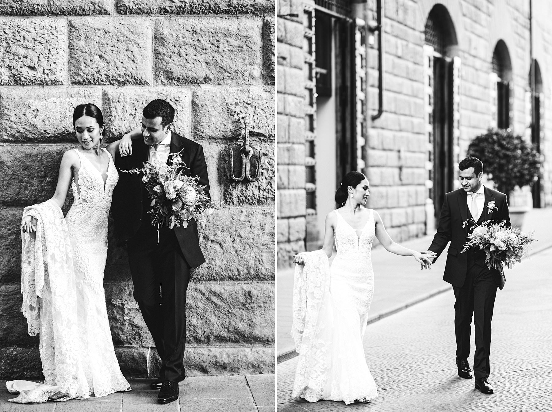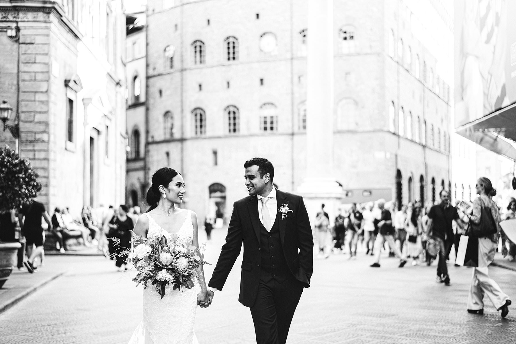 Dreamy bride and groom Florence walk tour photo shoot at Via de Tornabuoni, the fashion street, near Ponte Vecchio and Palazzo Strozzi. Intimate destination wedding in Florence with reception at luxury Belmond Villa San Michele. Photo by the Italian elegant creative and modern destination wedding photographer in Tuscany based Florence Gabriele Fani.