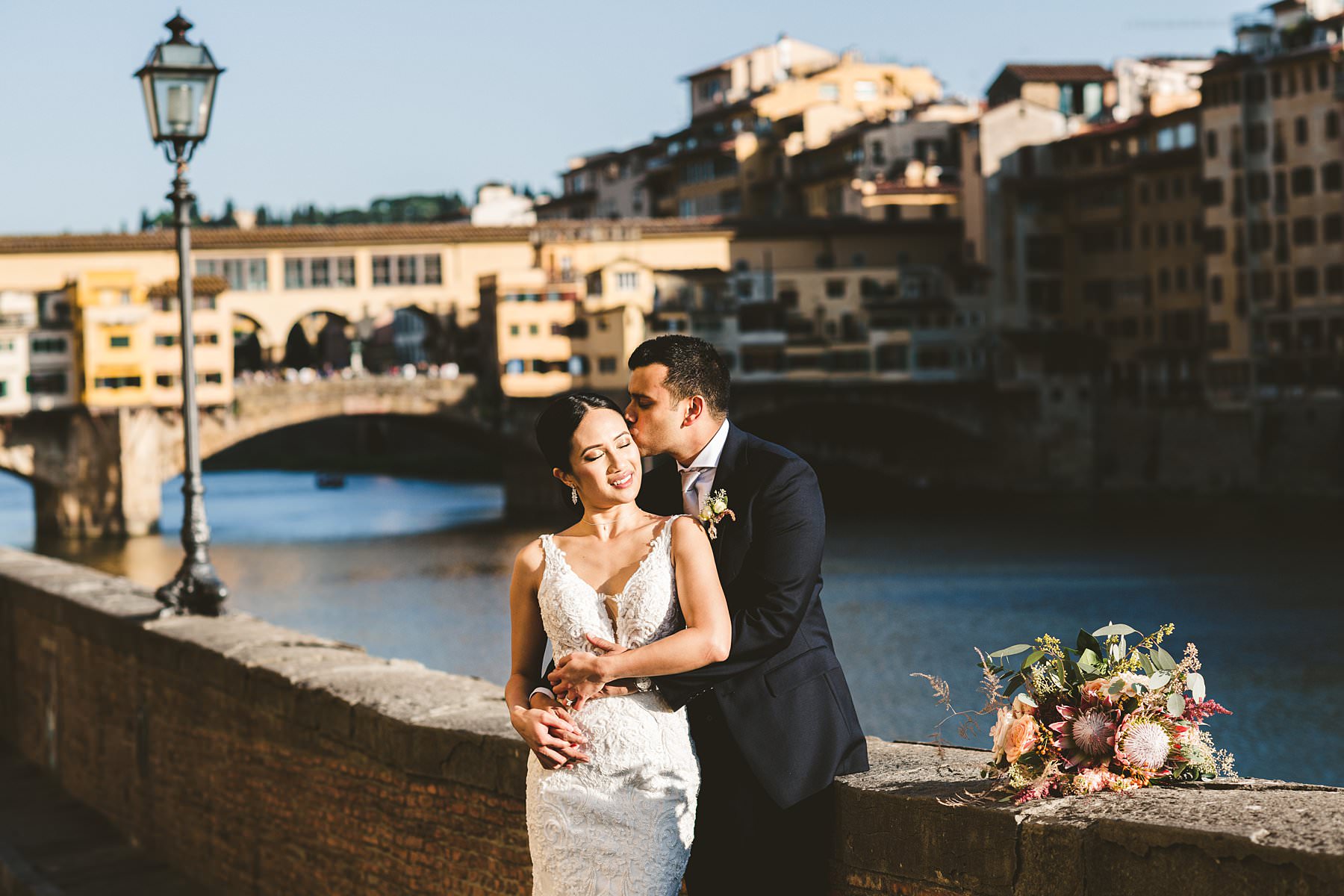Charming wedding portrait of bride and groom at Ponte Vecchio. Luxury and beautiful bride gown by Martina Liana. Intimate destination wedding with reception at the incredible and breathtaking luxury hotel Belmond Villa San Michele. Photo by the Italian elegant creative and modern destination wedding photographer in Tuscany based Florence Gabriele Fani.