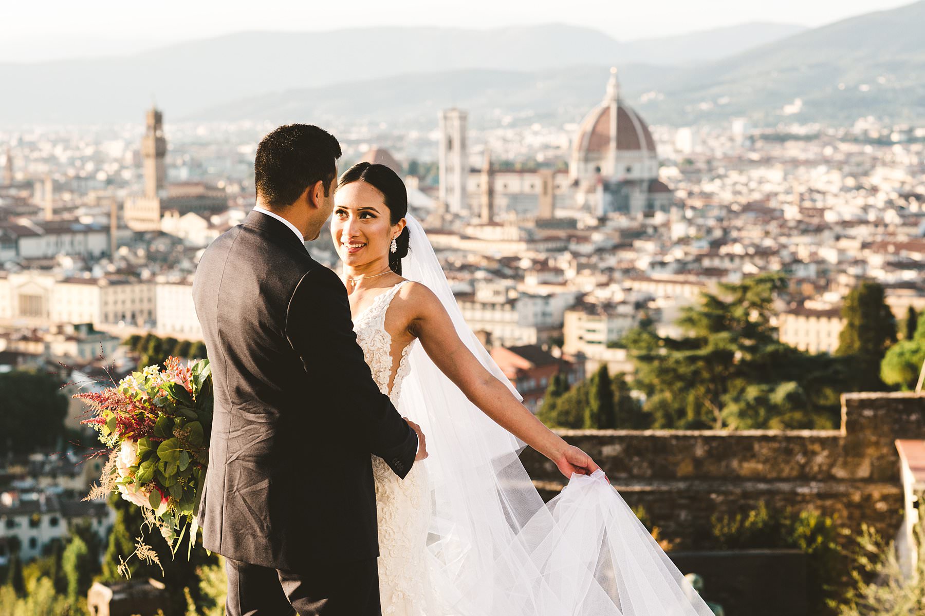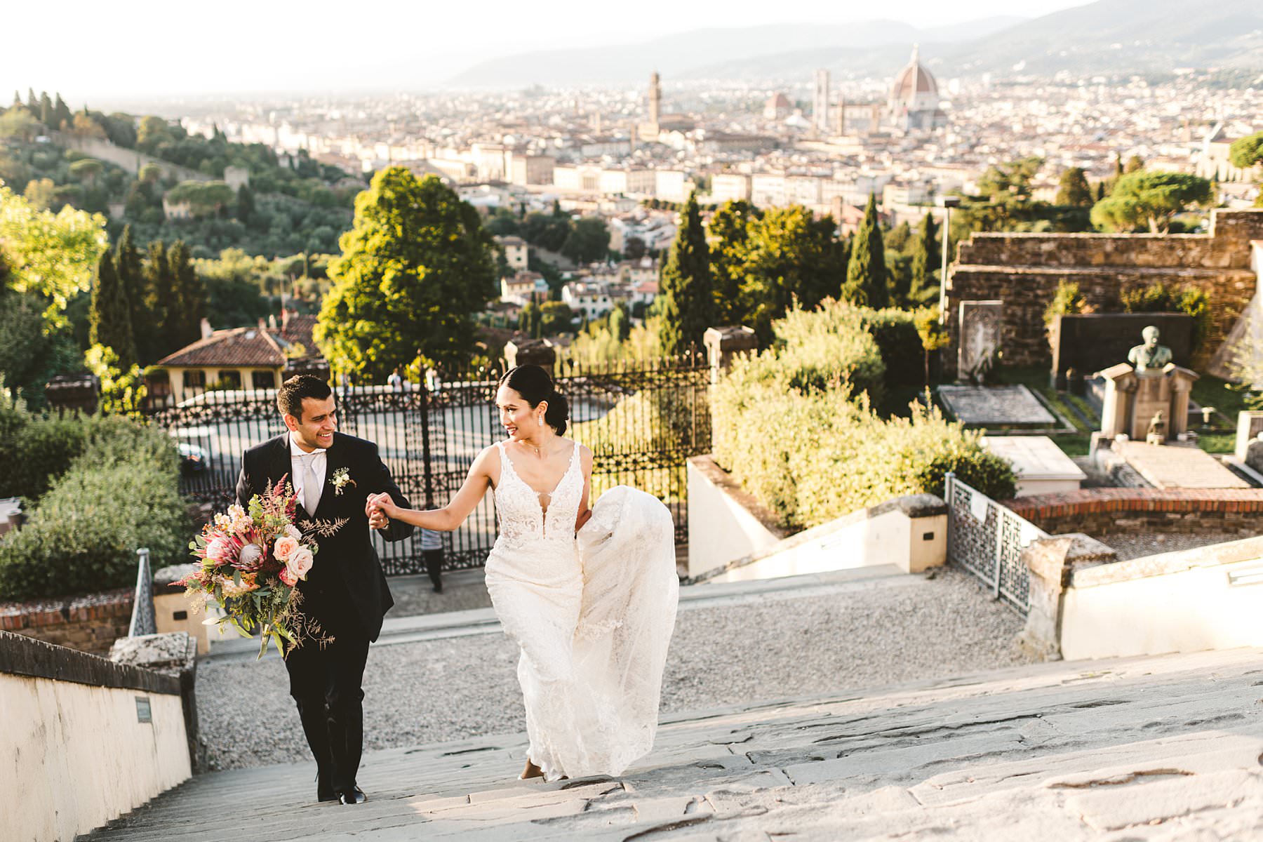 Lovely bride and groom photo at the most panoramic breathtaking view of Florence near Piazzale Michelangelo. Intimate destination wedding with reception at the incredible luxury venue of Belmond Villa San Michele. Photo by the Italian elegant creative and modern destination wedding photographer in Tuscany based Florence Gabriele Fani.